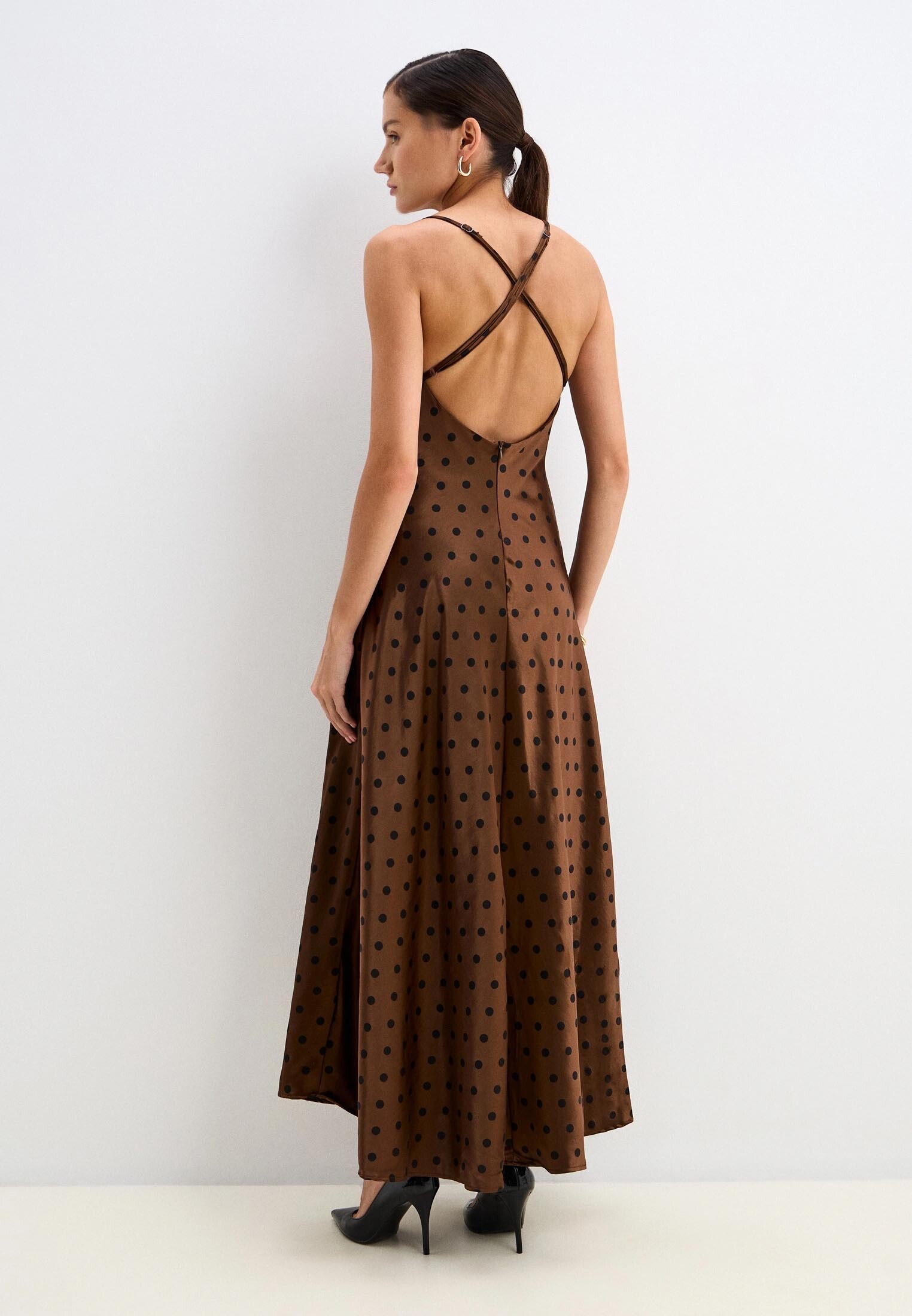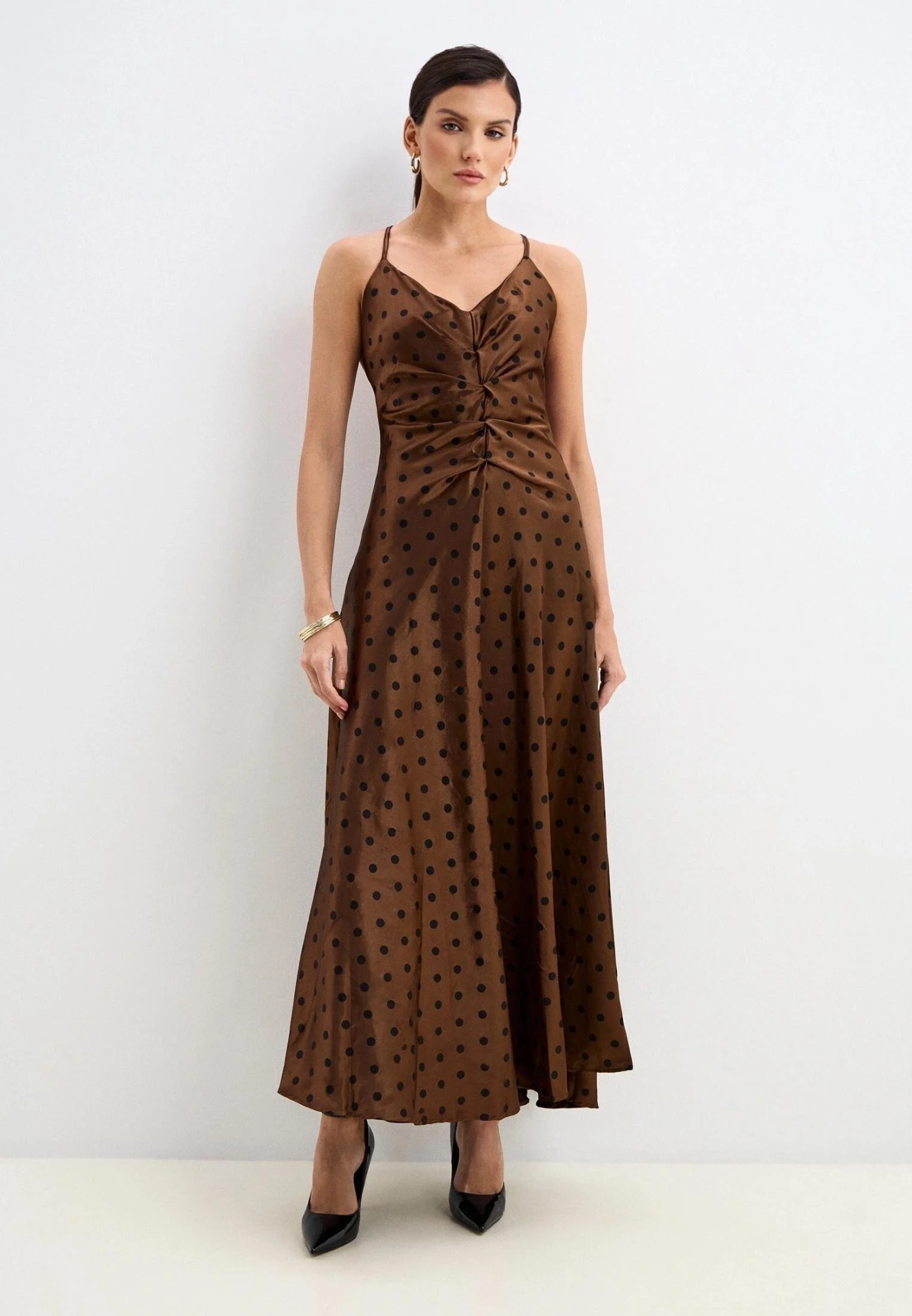 Дизайнерское длинное платье из лёгкого струящегося сатина в тёплом шоколадном оттенке с чёрным принтом «polka dot». Акцентная сборка по линии груди и талии формирует женственный силуэт, а лёгкий клёш к низу придаёт движению пластичность.