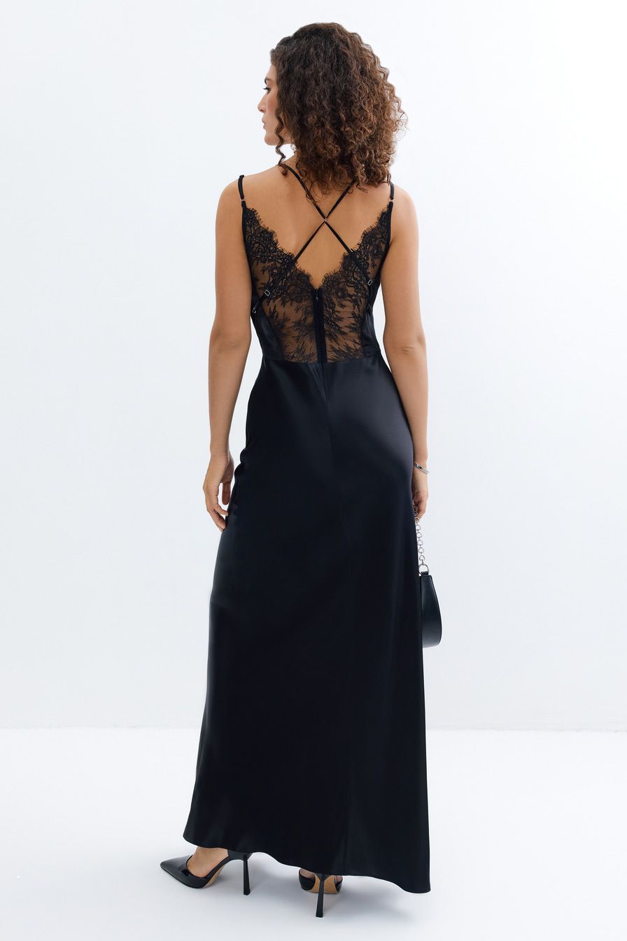 Черное платье-комбинация длины макси выполнено из 100% района – легкой, струящейся ткани на основе целлюлозы. Модель приталенного кроя декорирована кружевной отделкой.