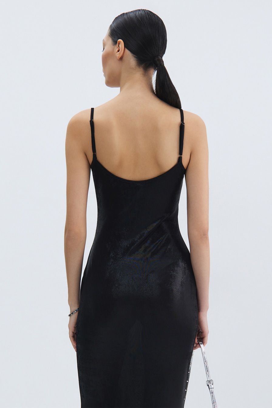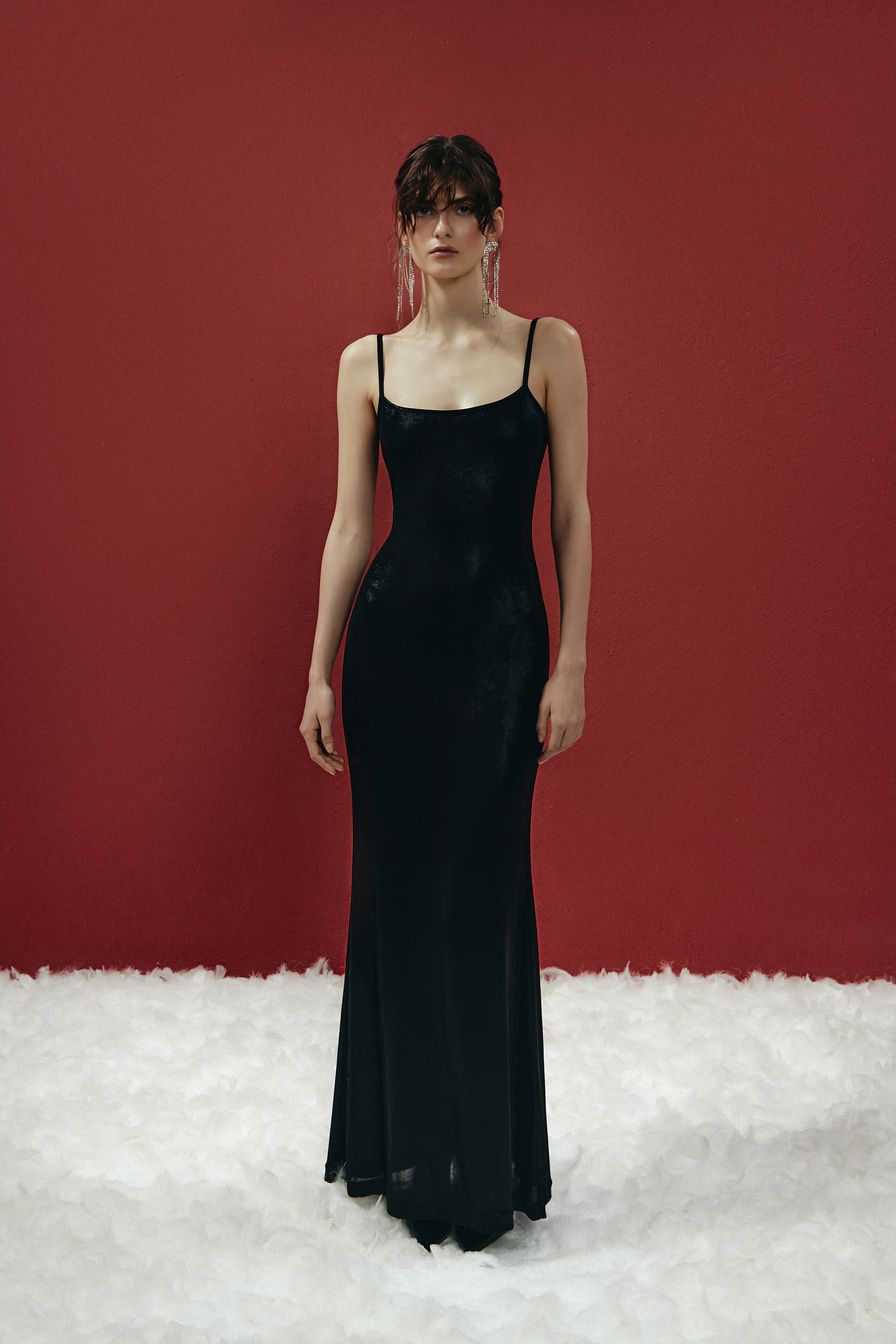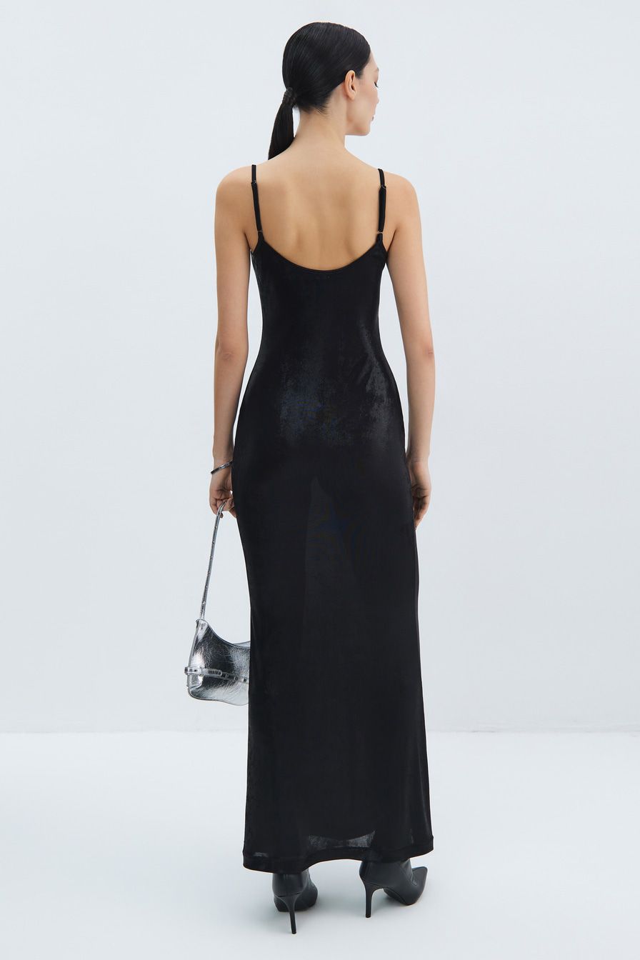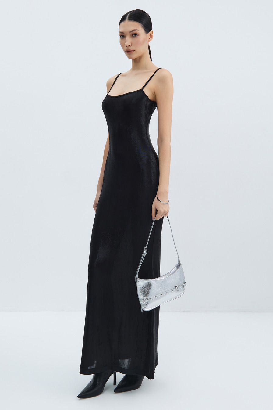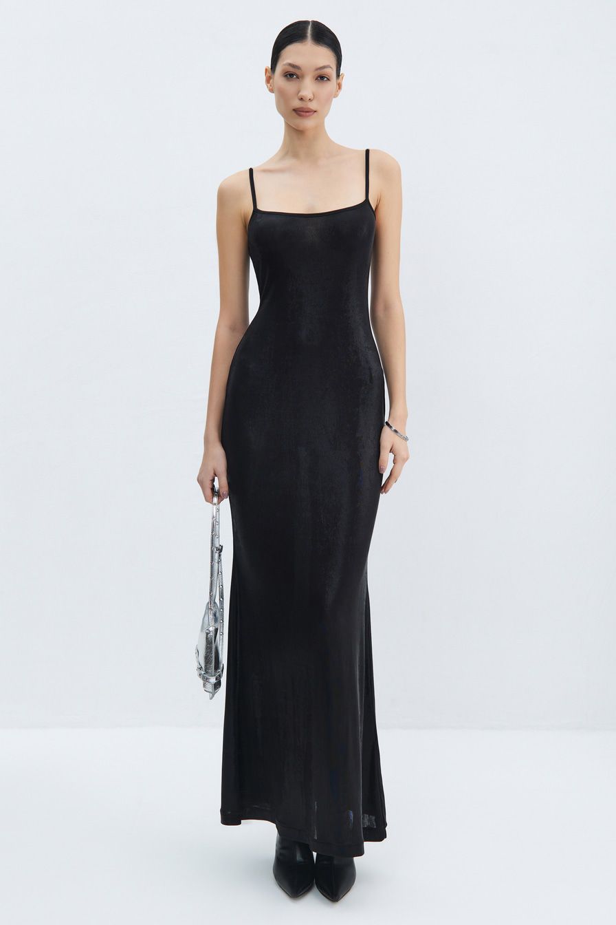 Трикотажное платье-макси с люрексом – модель приталенного кроя с тонкими бретелями и юбкой-годе.