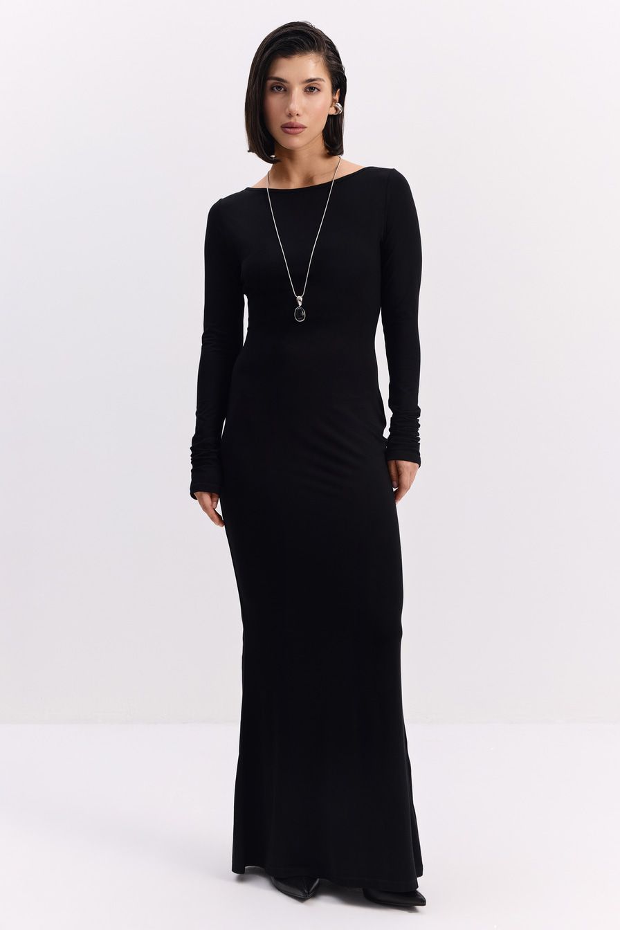 Черное трикотажное платье-макси из смесовой вискозы – модель облегающего кроя с длинными рукавами.