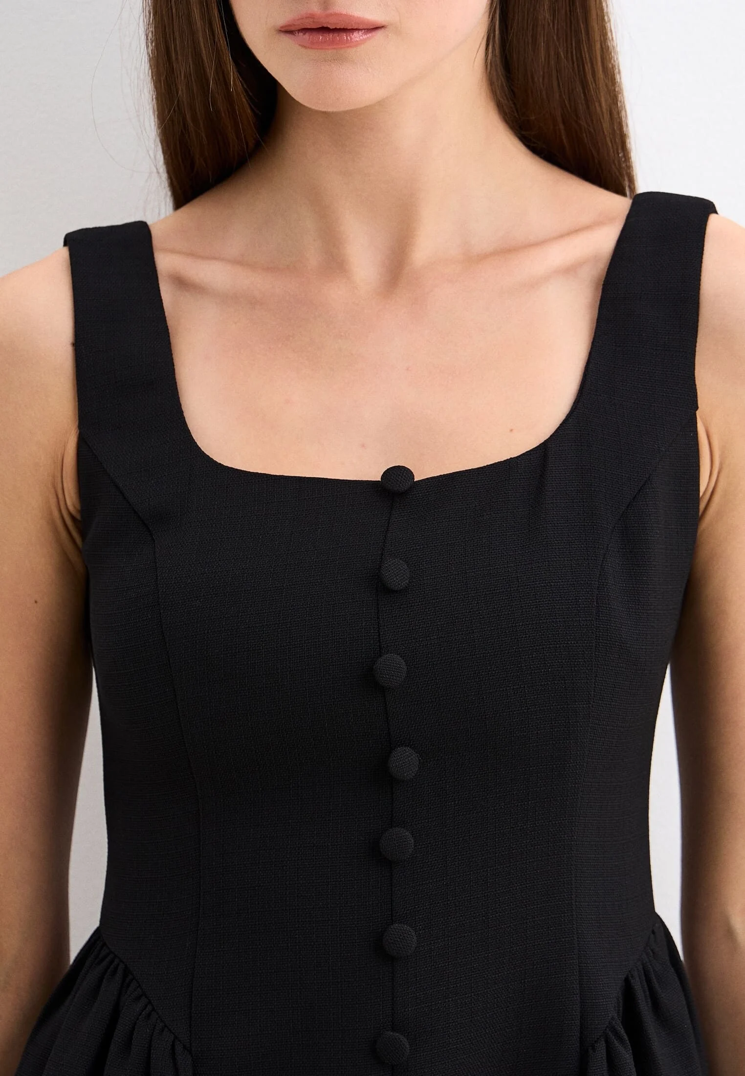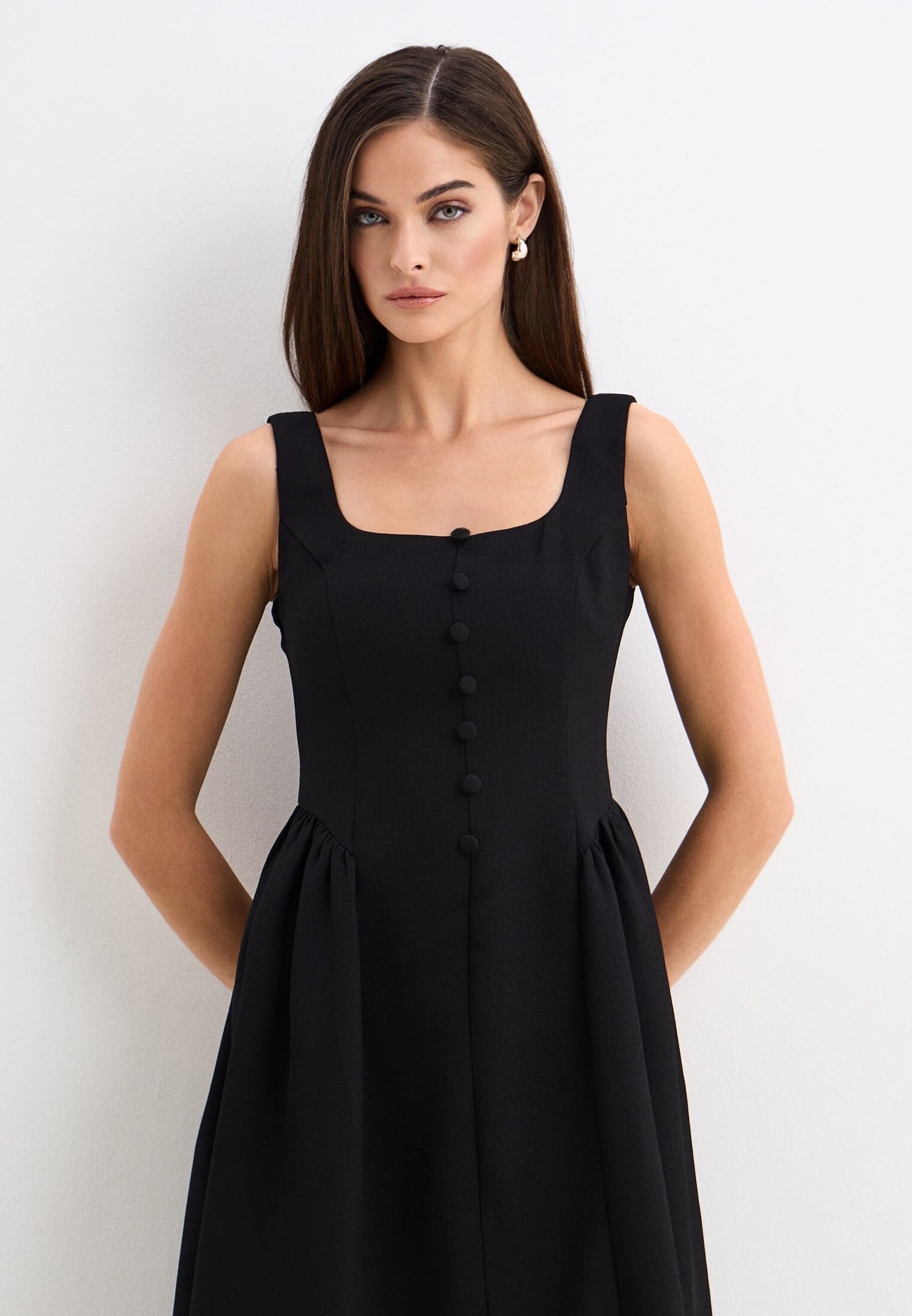 Черное платье миди без рукавов с квадратным вырезом и акцентной линией пуговиц. Лаконичное, универсальное и элегантное.
