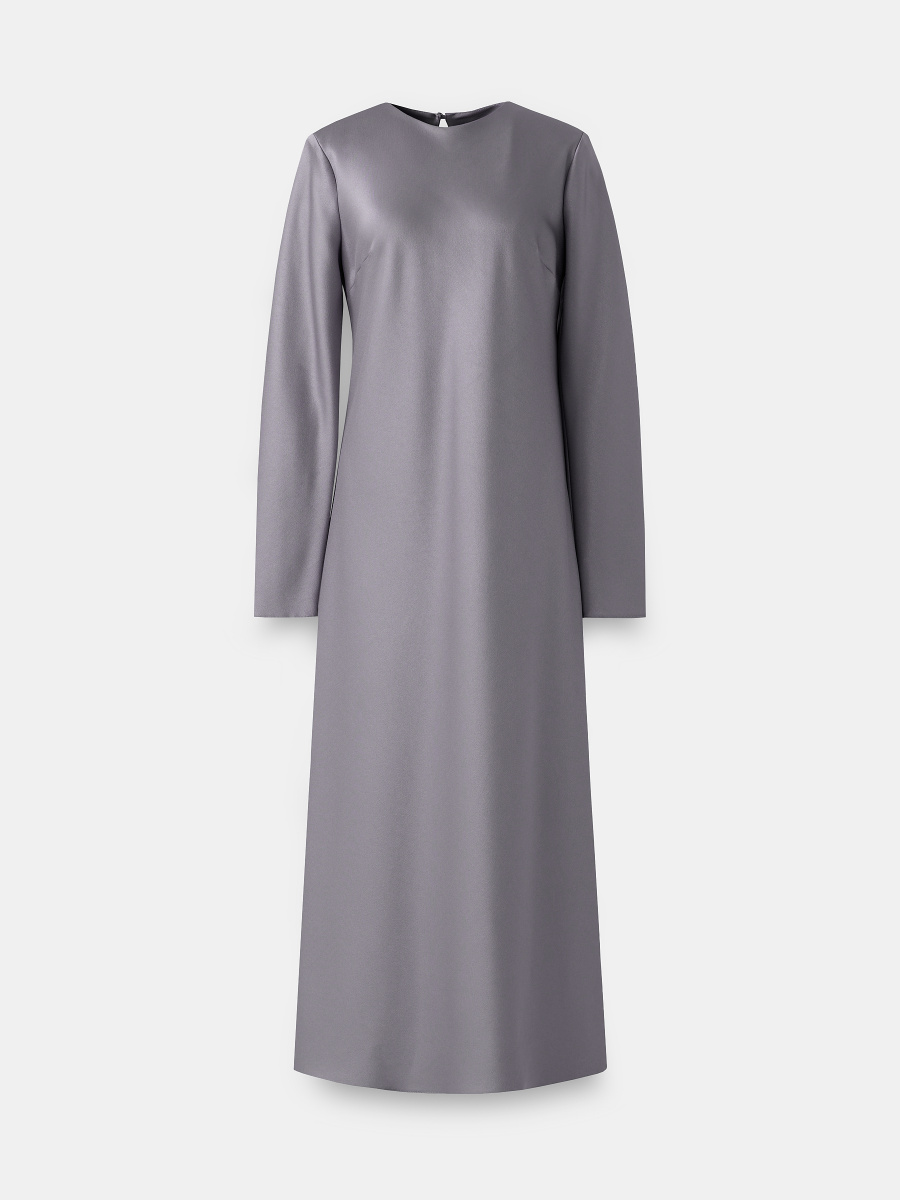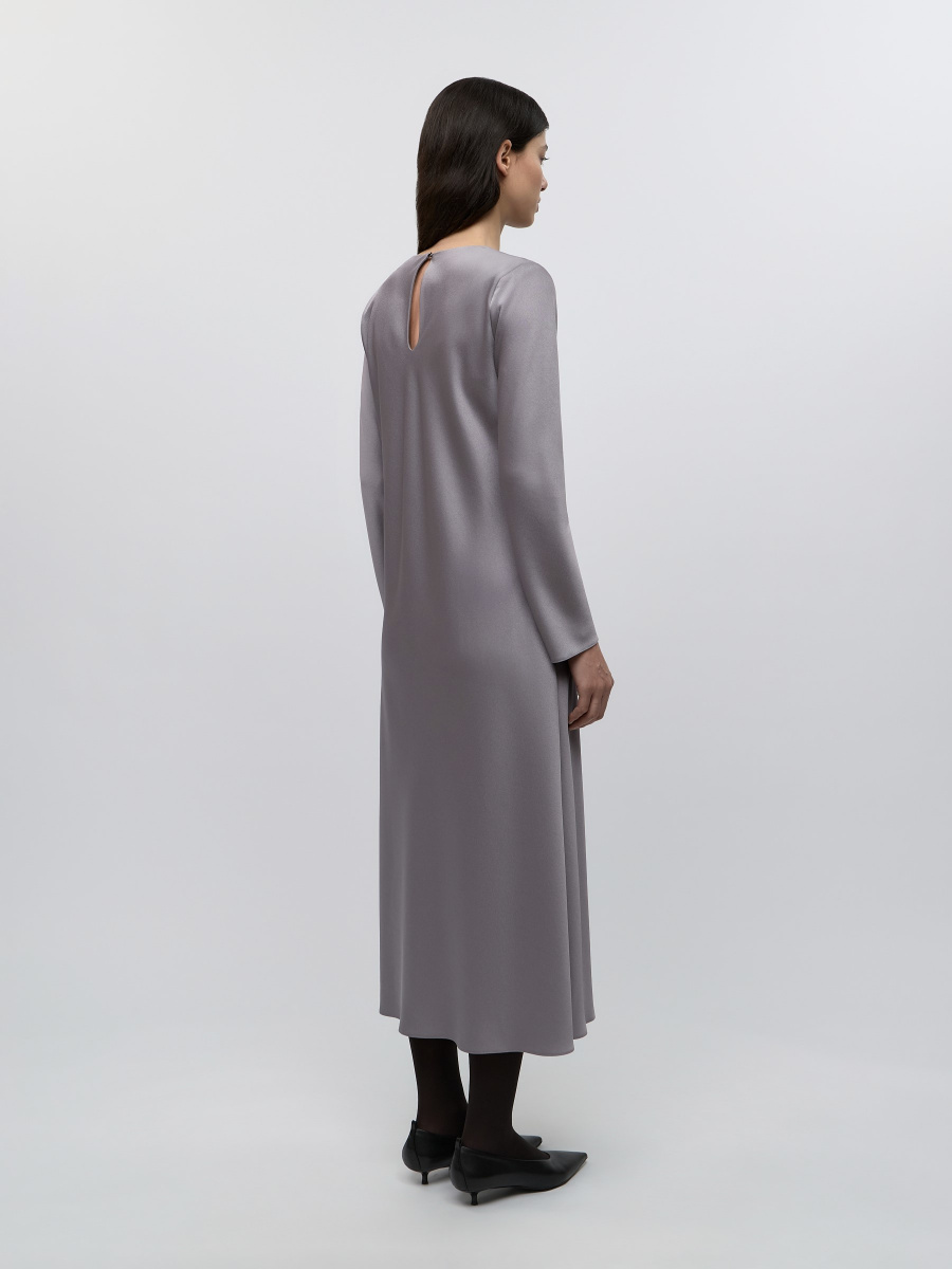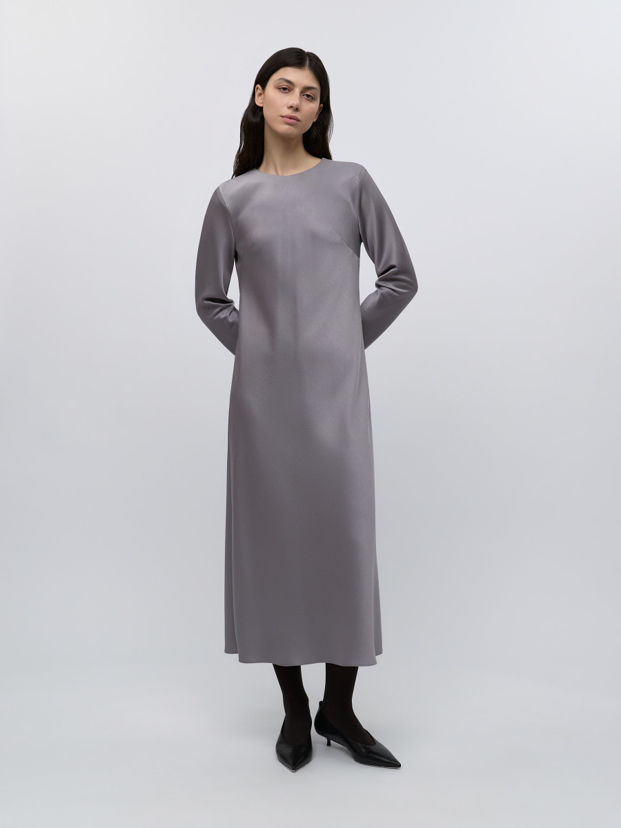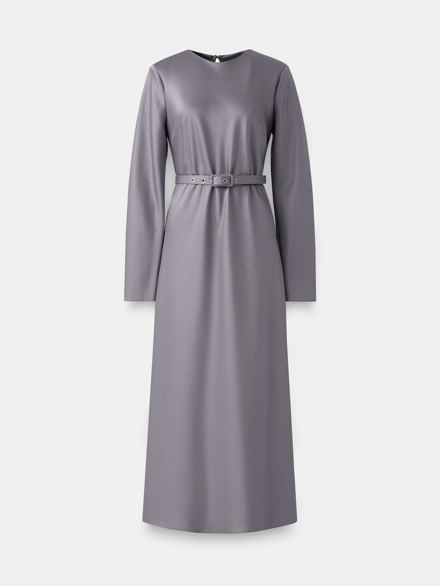 Платье макси из легкого, но прочного шелковистого полотна с сатиновыми переливами. Круглый вырез, застежка-капля на спинке, а также приятная, скользящая по коже фактура. Юбка-клеш чуть расширяется к низу и играет в движении. В комплекте жесткий тканевый пояс с пряжкой в тон, чтобы сделать силуэт еще более женственным.