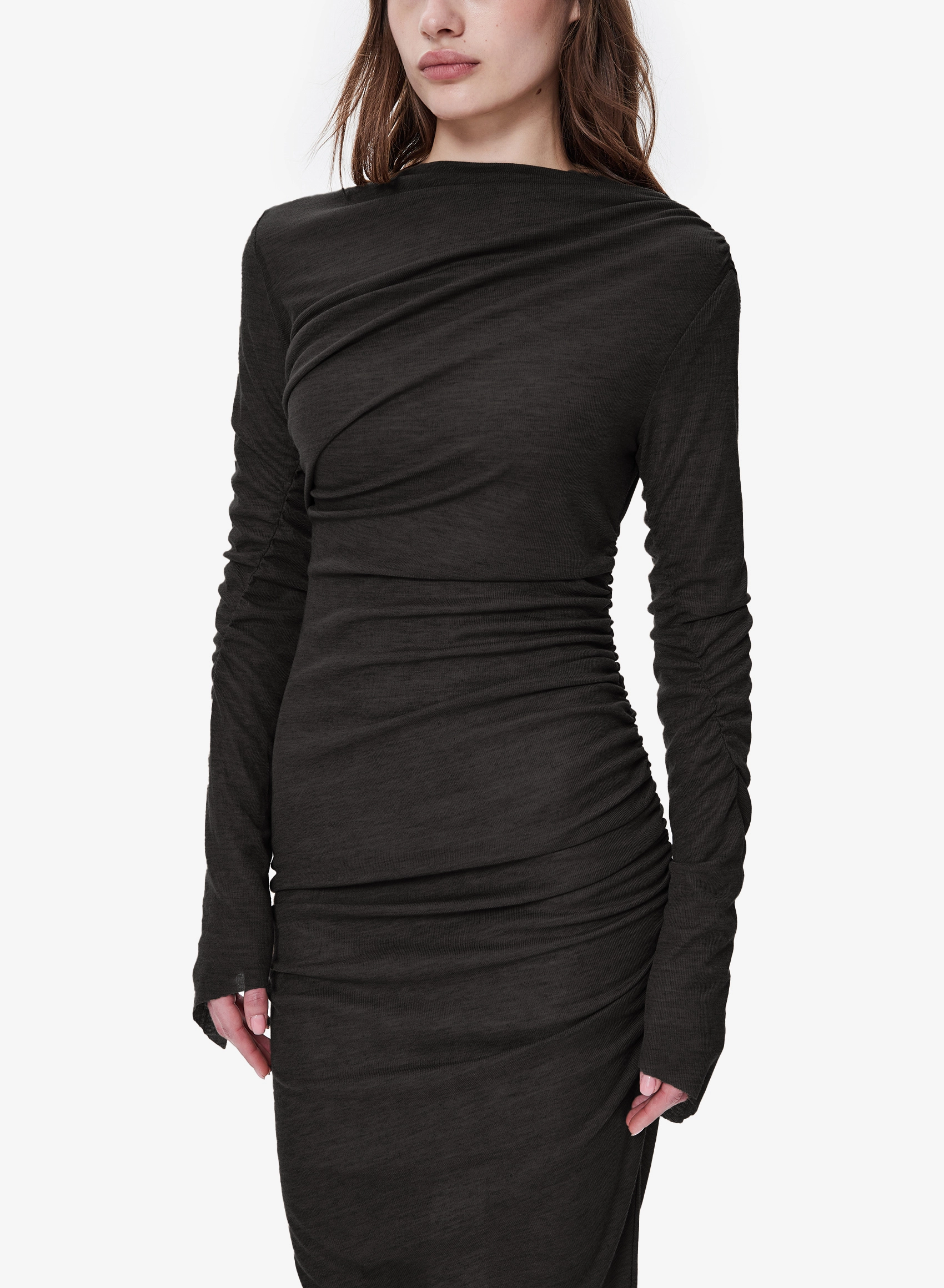 Платье из тонкого полупрозрачного трикотажа полуприлегающего силуэта с удлиненными рукавами
