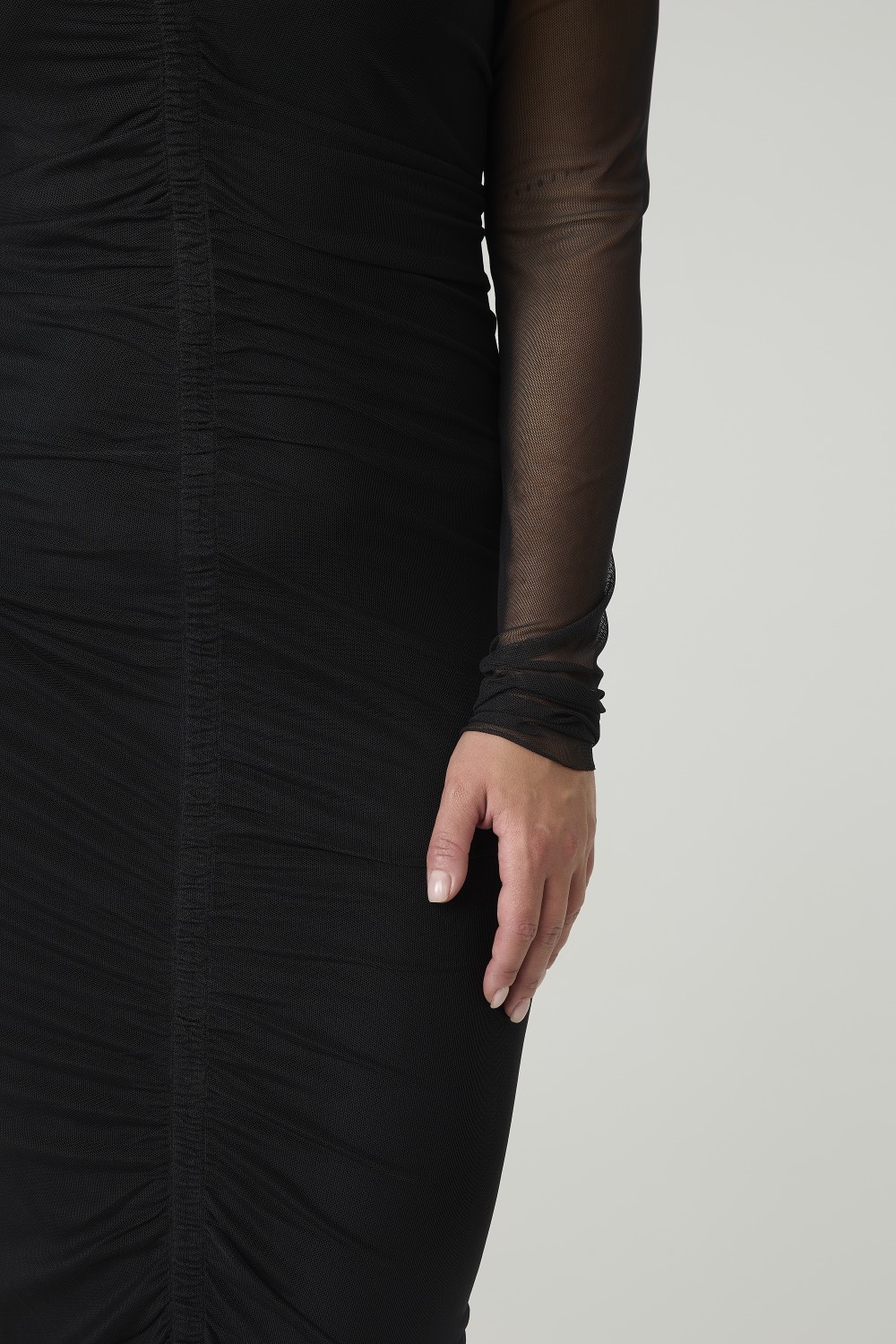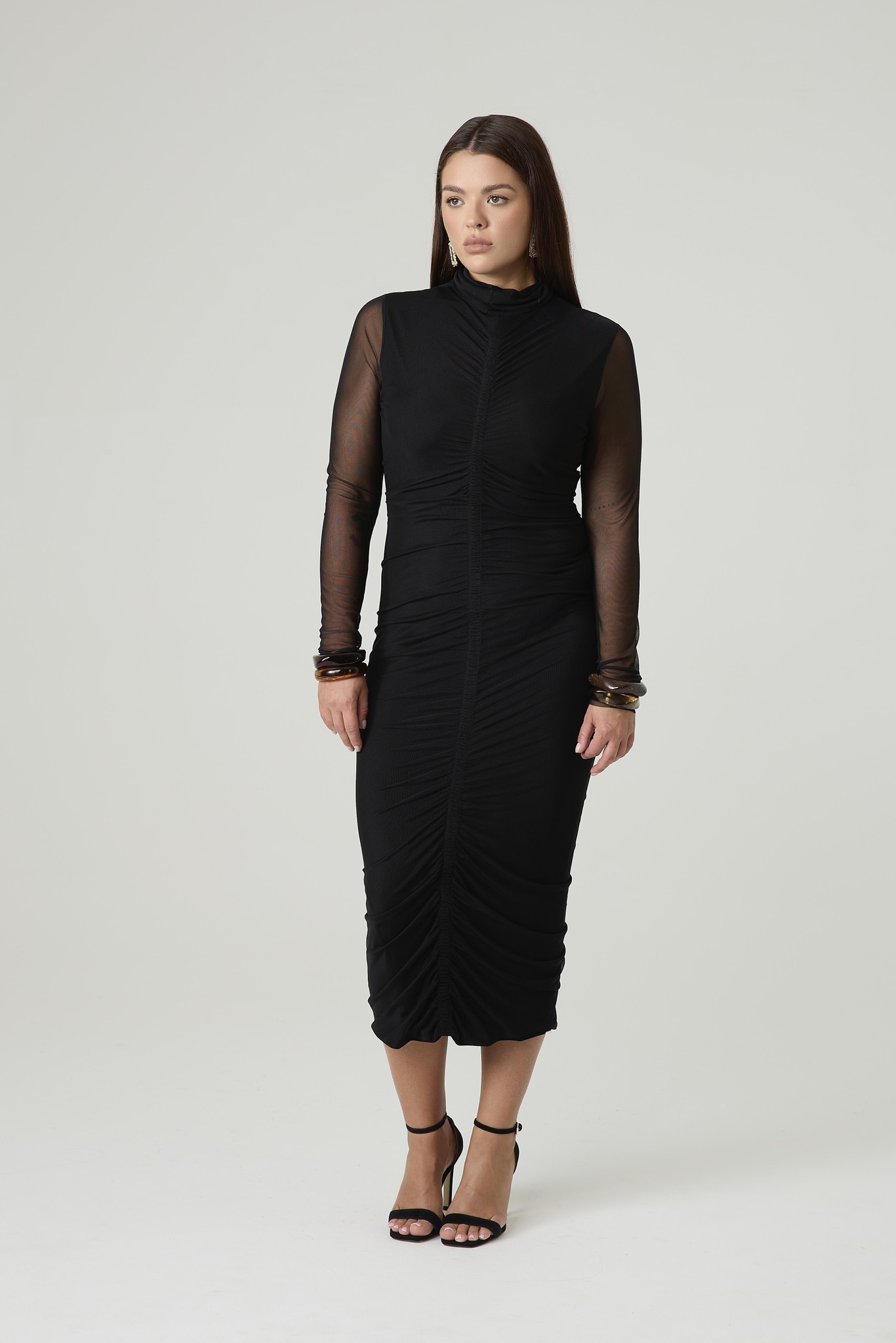 Платье из сетки прилегающего кроя длиной миди базового черного цвета. Вертикальная драпировка зрительно вытягивает силуэт. Эффектная модель для походов в театр, рестораны и торжественных мероприятий. Нужно лишь добавить к образу соответствующие обувь и аксессуары.