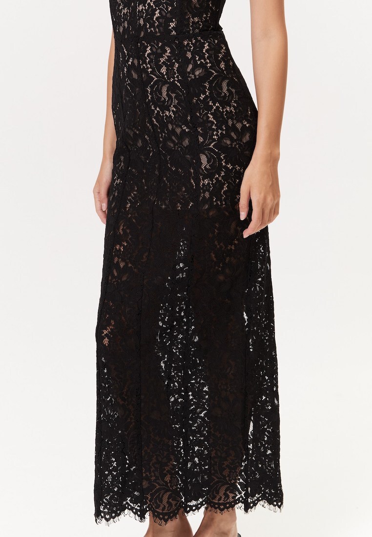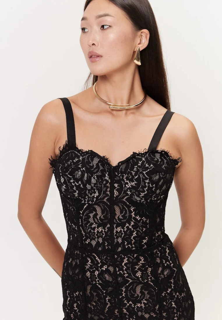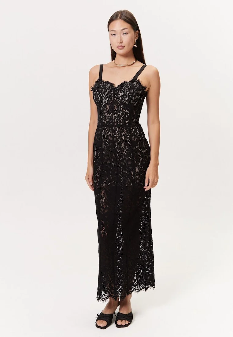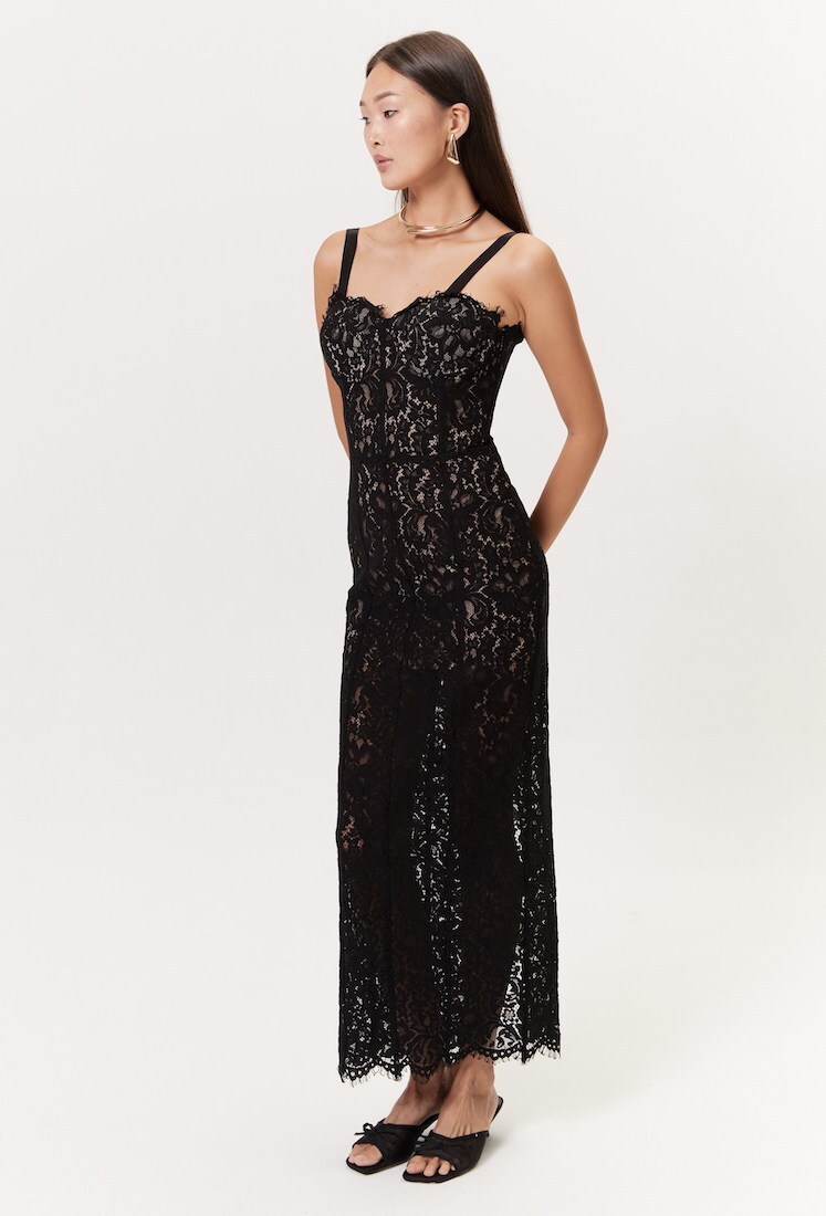 Кружевное платье на тонких лямках длиной миди — изысканный и романтичный выбор для особенных случаев. Элегантный вырез в форме сердца и чашечки подчёркивают женственность и придают образу нежность. Нежное кружево создаёт воздушную текстуру и добавляет утончённости вашему стилю.