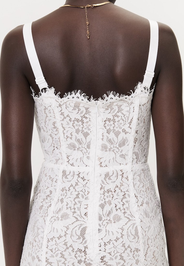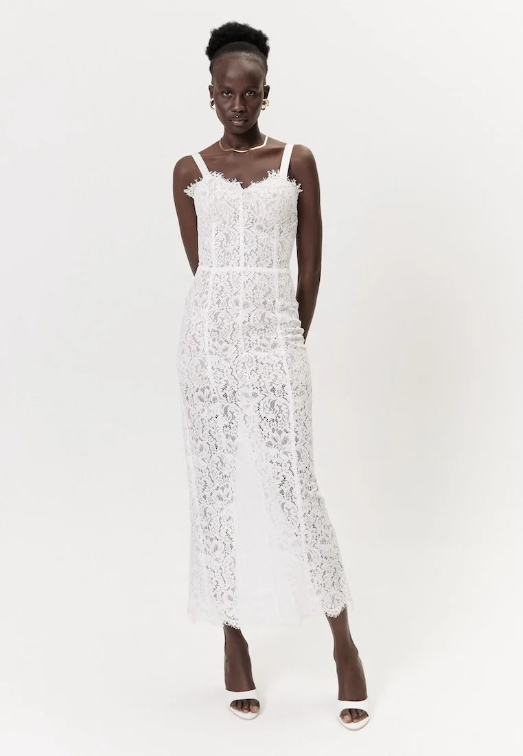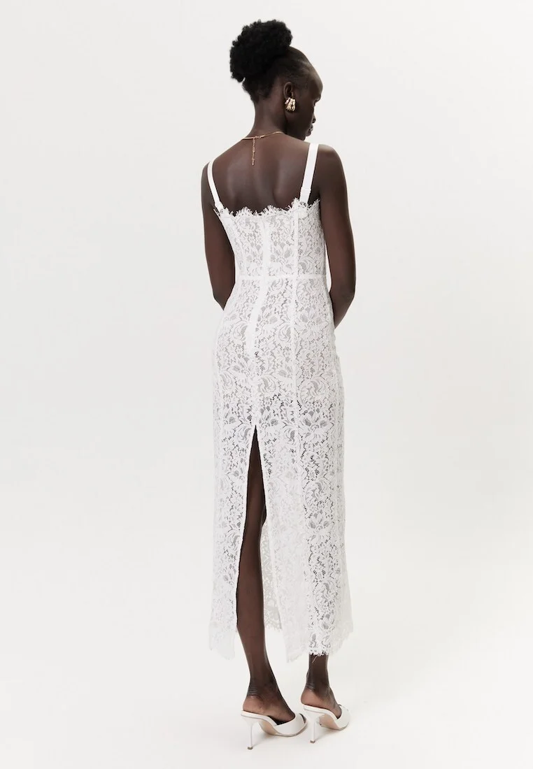 Кружевное платье на тонких лямках длиной миди — изысканный и романтичный выбор для особенных случаев. Элегантный вырез в форме сердца и чашечки подчёркивают женственность и придают образу нежность. Нежное кружево создаёт воздушную текстуру и добавляет утончённости вашему стилю.