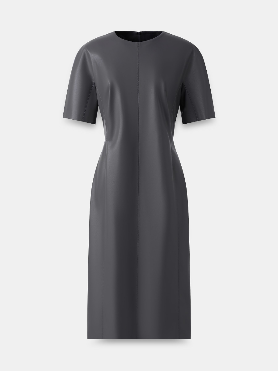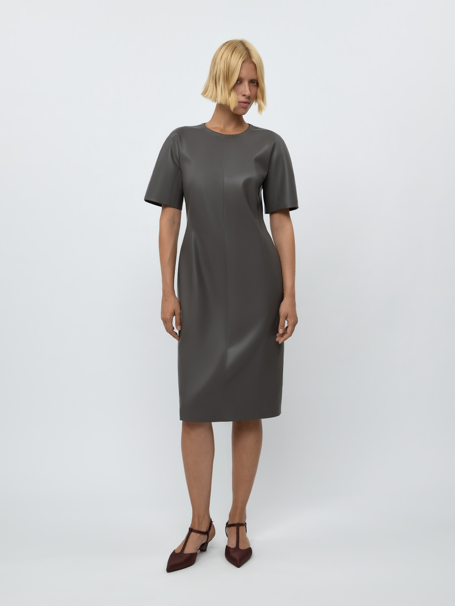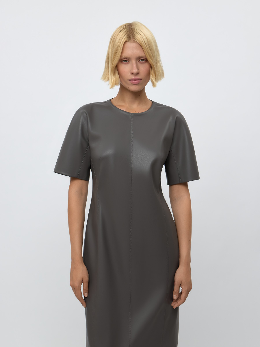 Платье миди из дышащей экокожи последнего поколения — лаконичное и универсальное. Среднее облегание с вытачками на талии, круглая горловина, бесшовная линия плеч, деликатный разрез. Ткань с естественным блеском и фактурой, а также сложный крой создают впечатление натуральной кожи. Мягкая хлопковая изнанка позволяет с комфортом носить изделие на голое тело.
