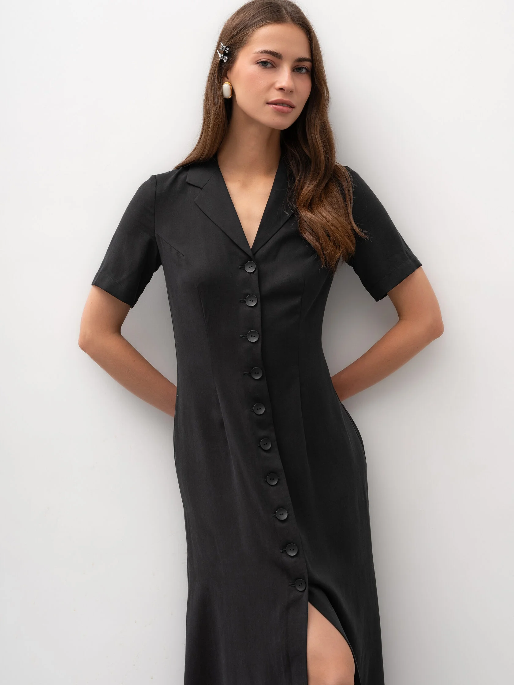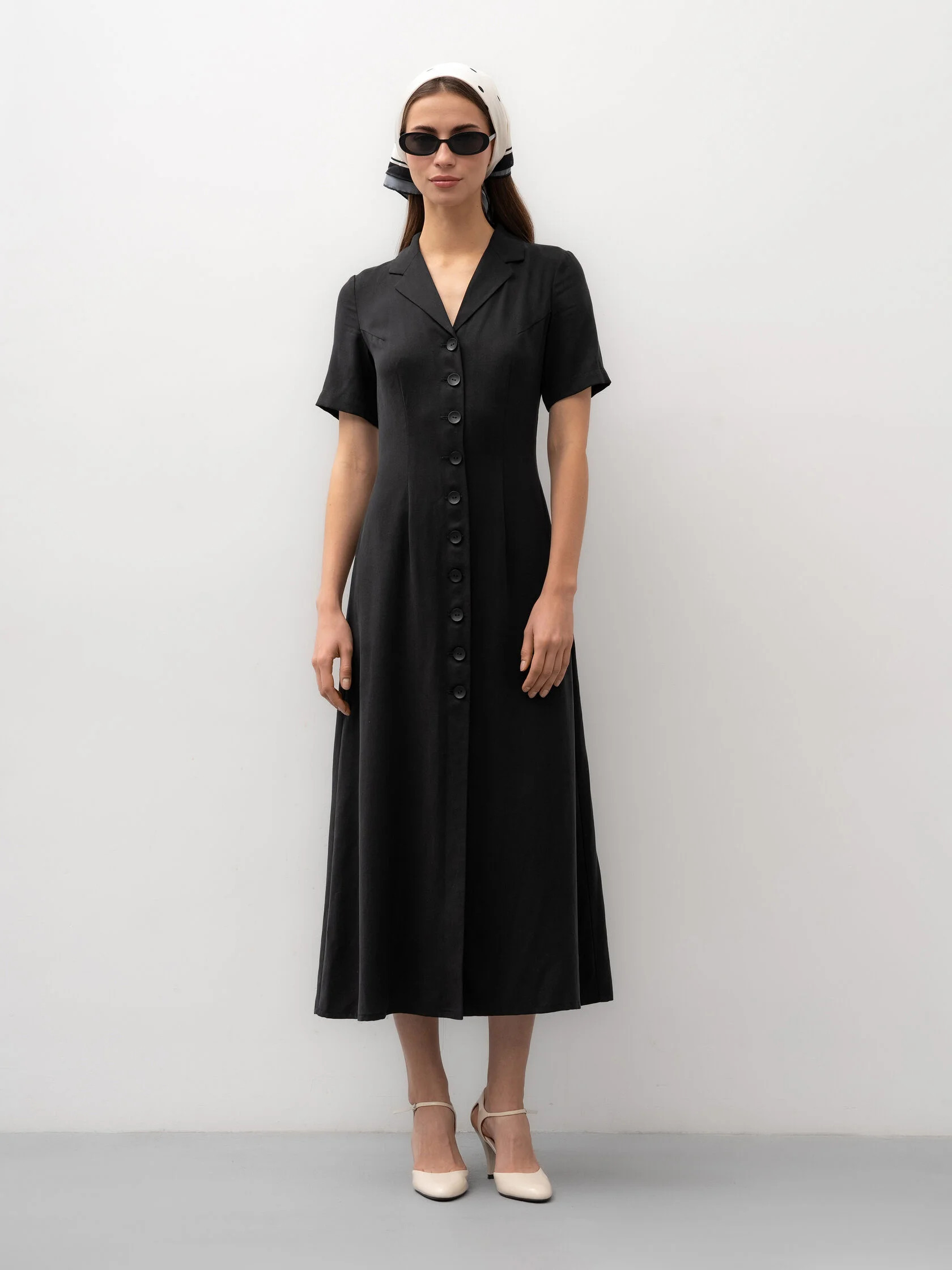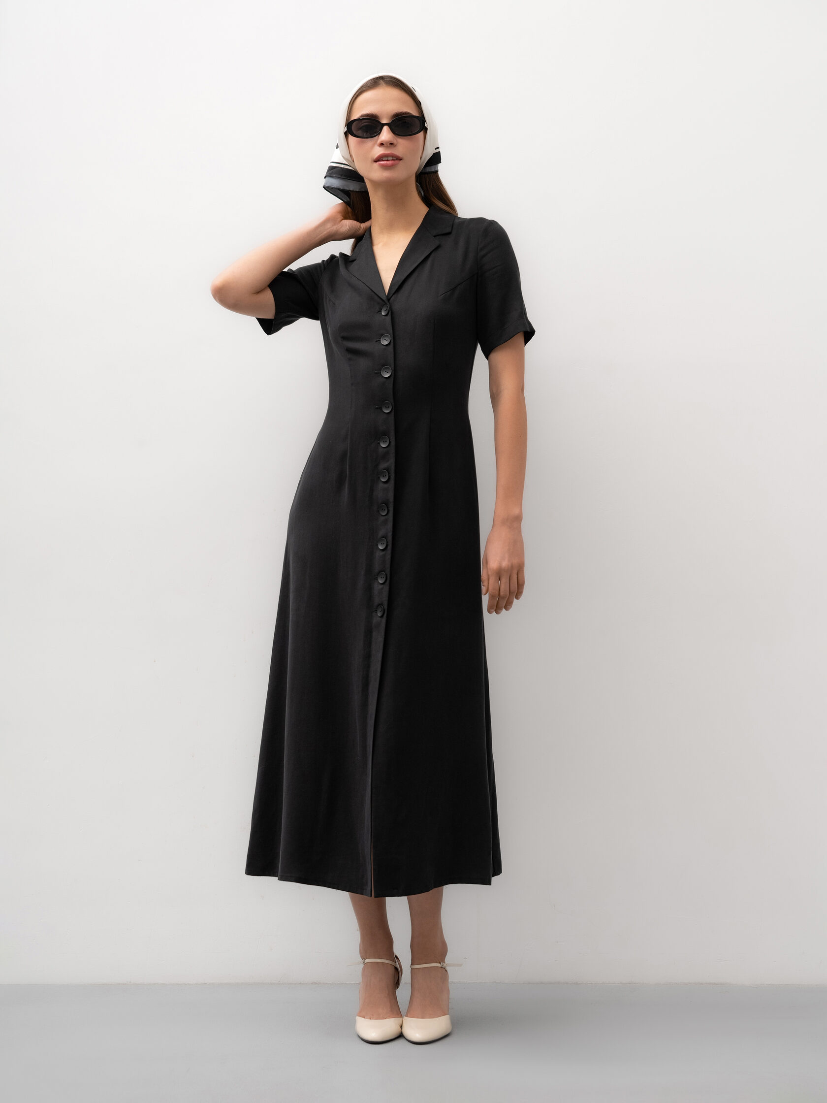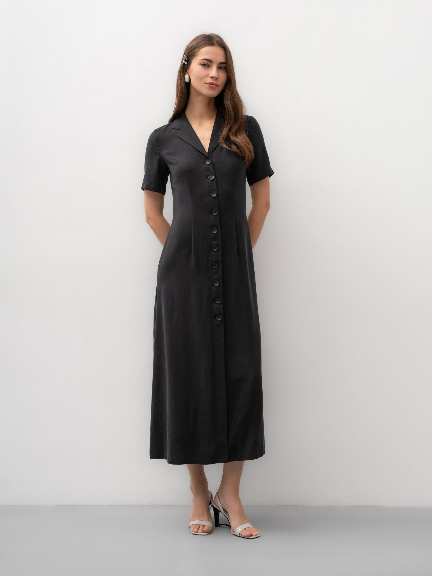 Платье миди из 100% тенселя в чёрном оттенке. Приятная к коже ткань красиво струится и мягко подчеркивает силуэт. V-вырез с лаконичными лацканами, короткий рукав и длинная планка на матовых пуговицах задают безупречно элегантную линию.