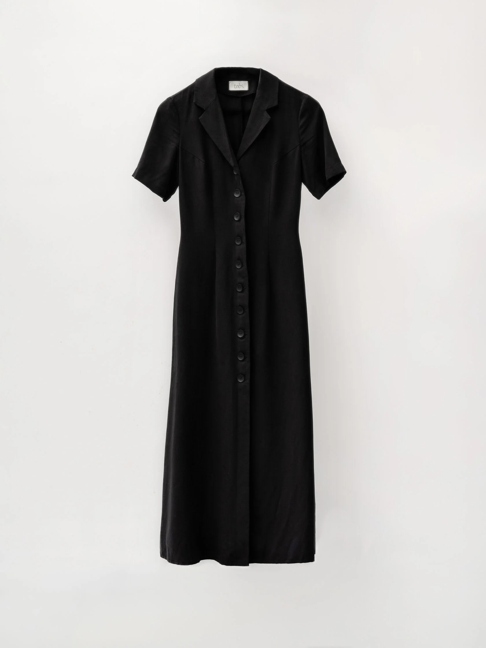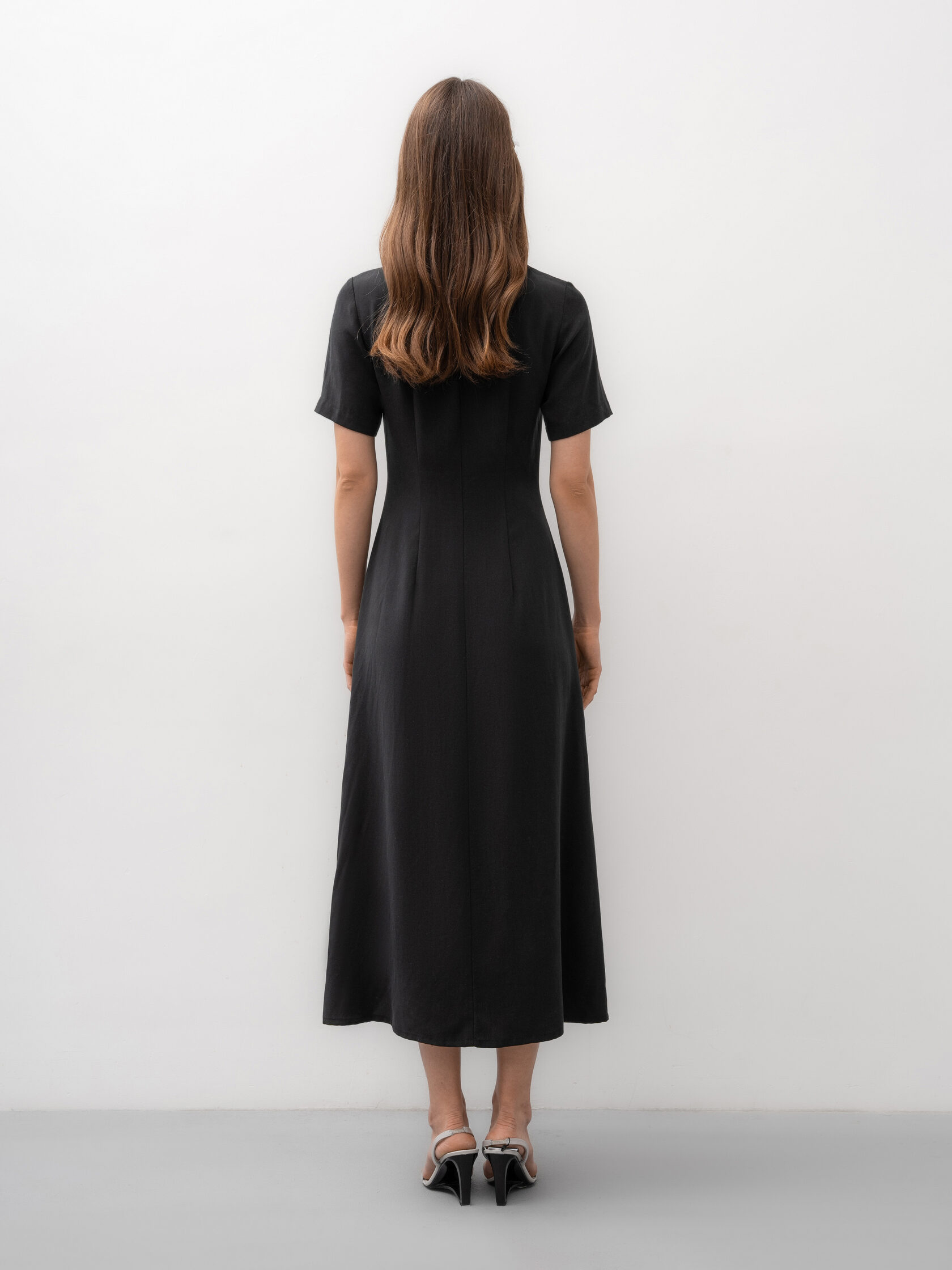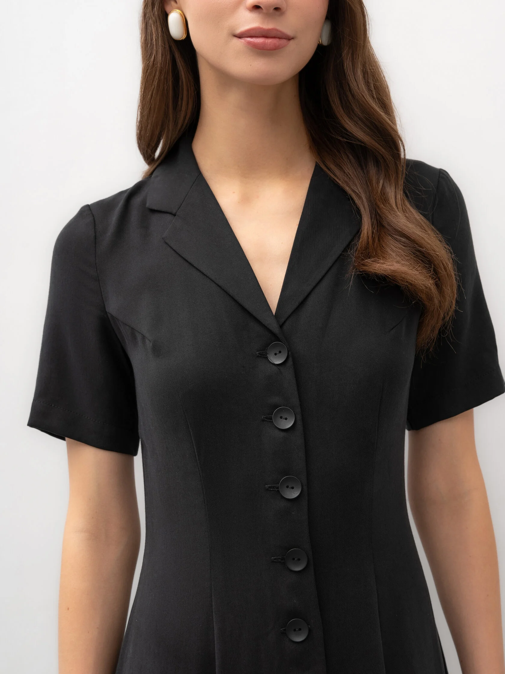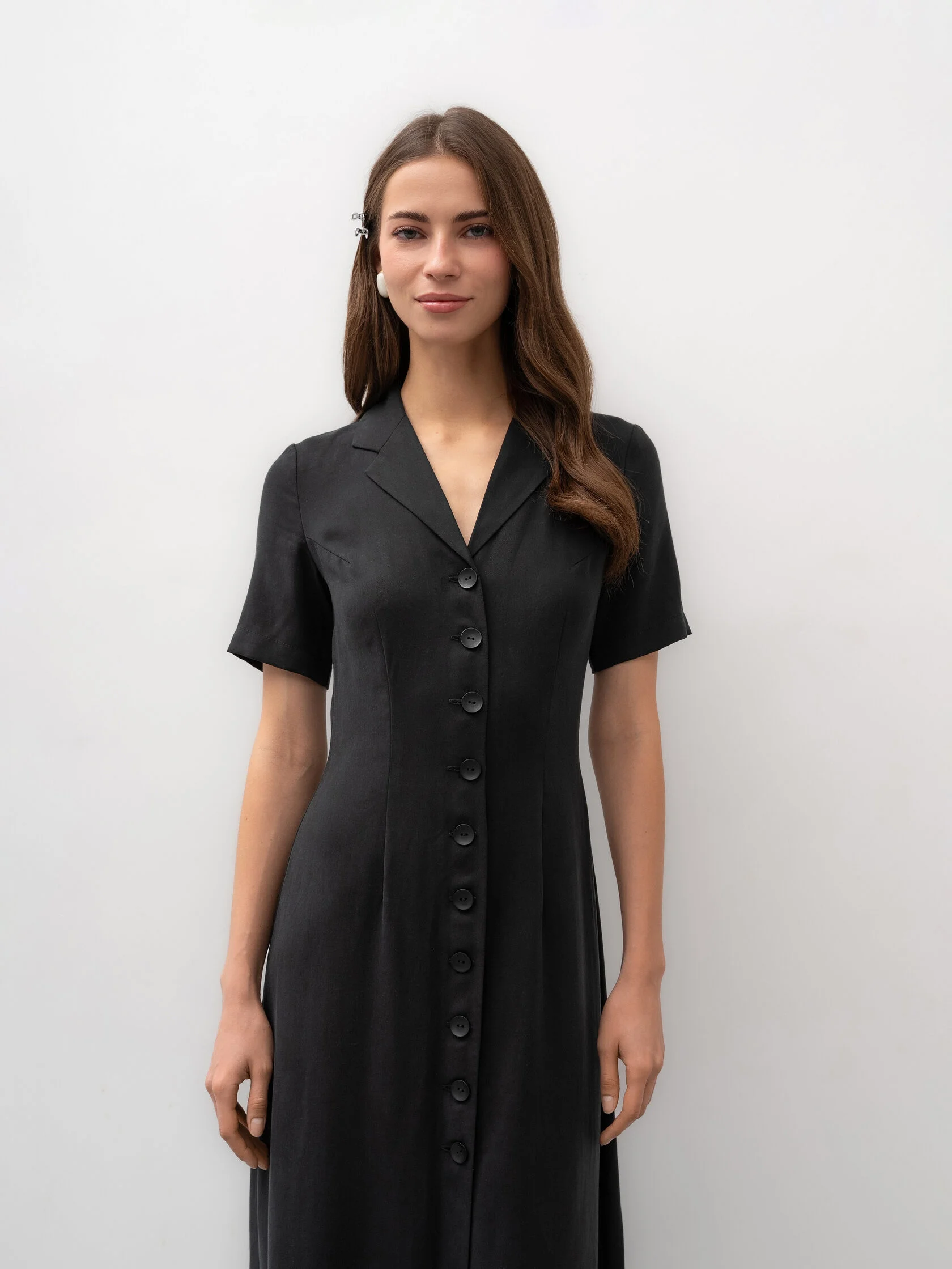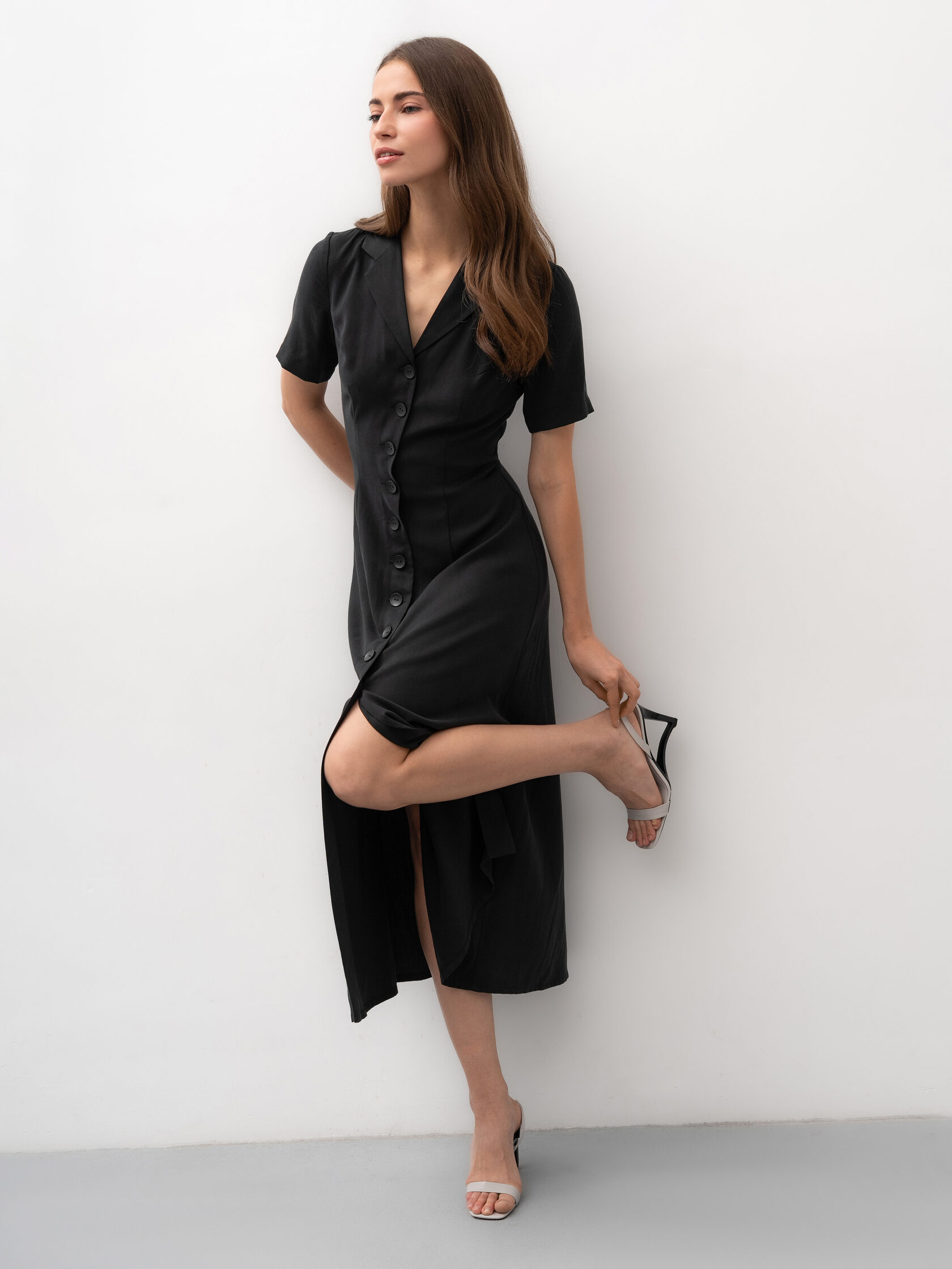 Платье миди из 100% тенселя в чёрном оттенке. Приятная к коже ткань красиво струится и мягко подчеркивает силуэт. V-вырез с лаконичными лацканами, короткий рукав и длинная планка на матовых пуговицах задают безупречно элегантную линию.