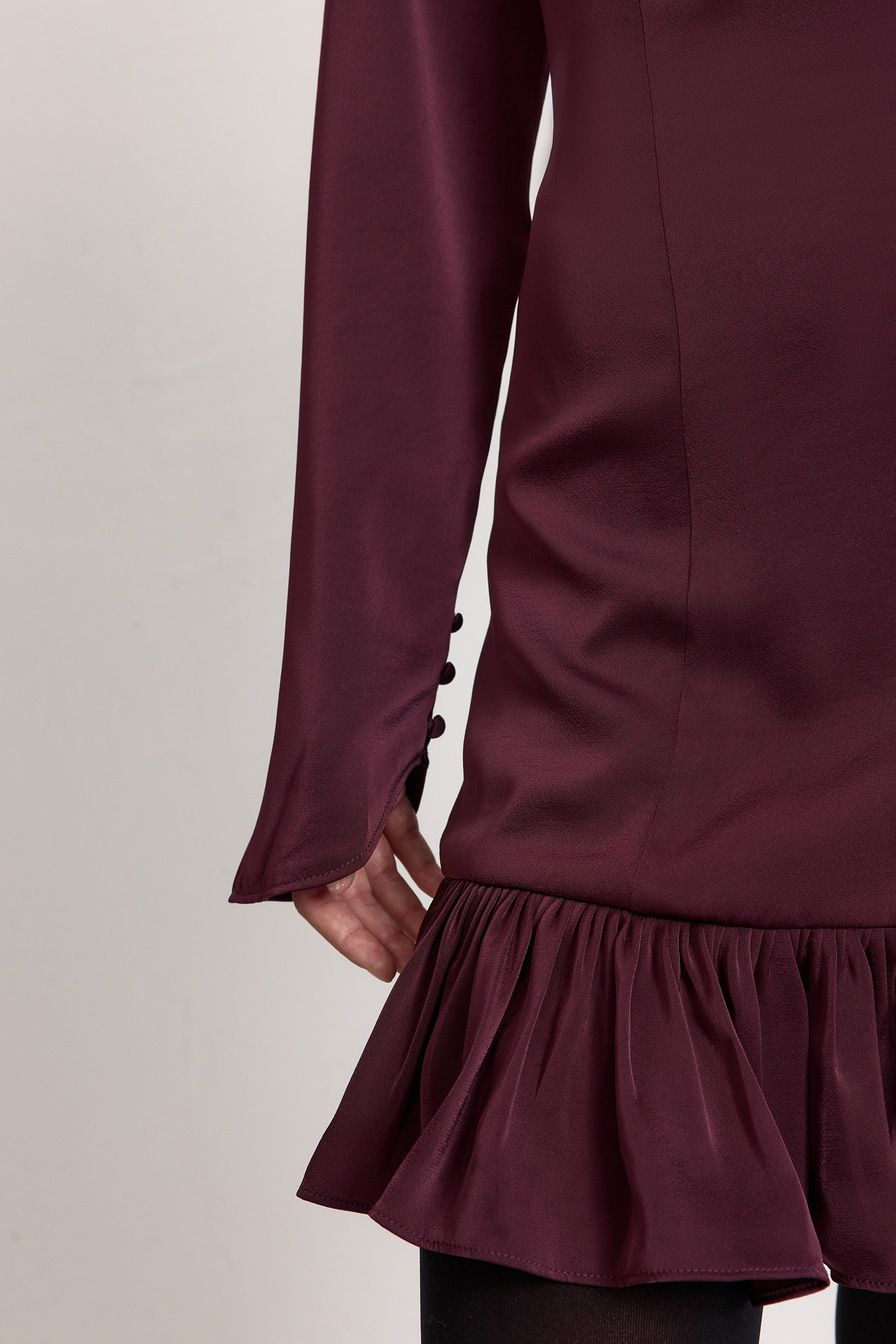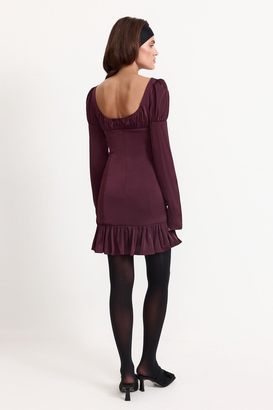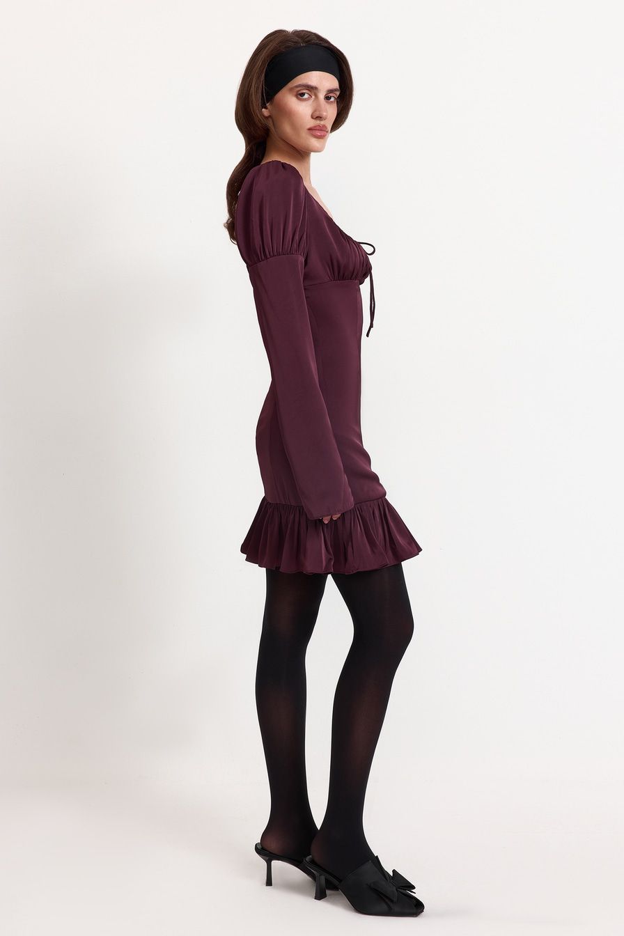 Темно-фиолетовое платье-мини – модель приталенного кроя с высокой линией лифа. Платье декорировано воланом.