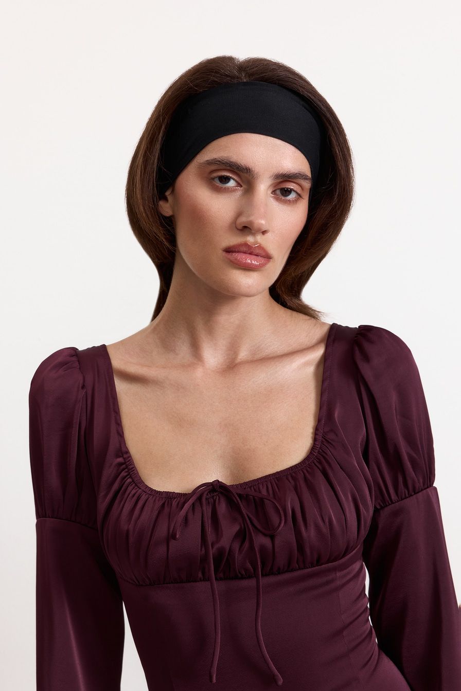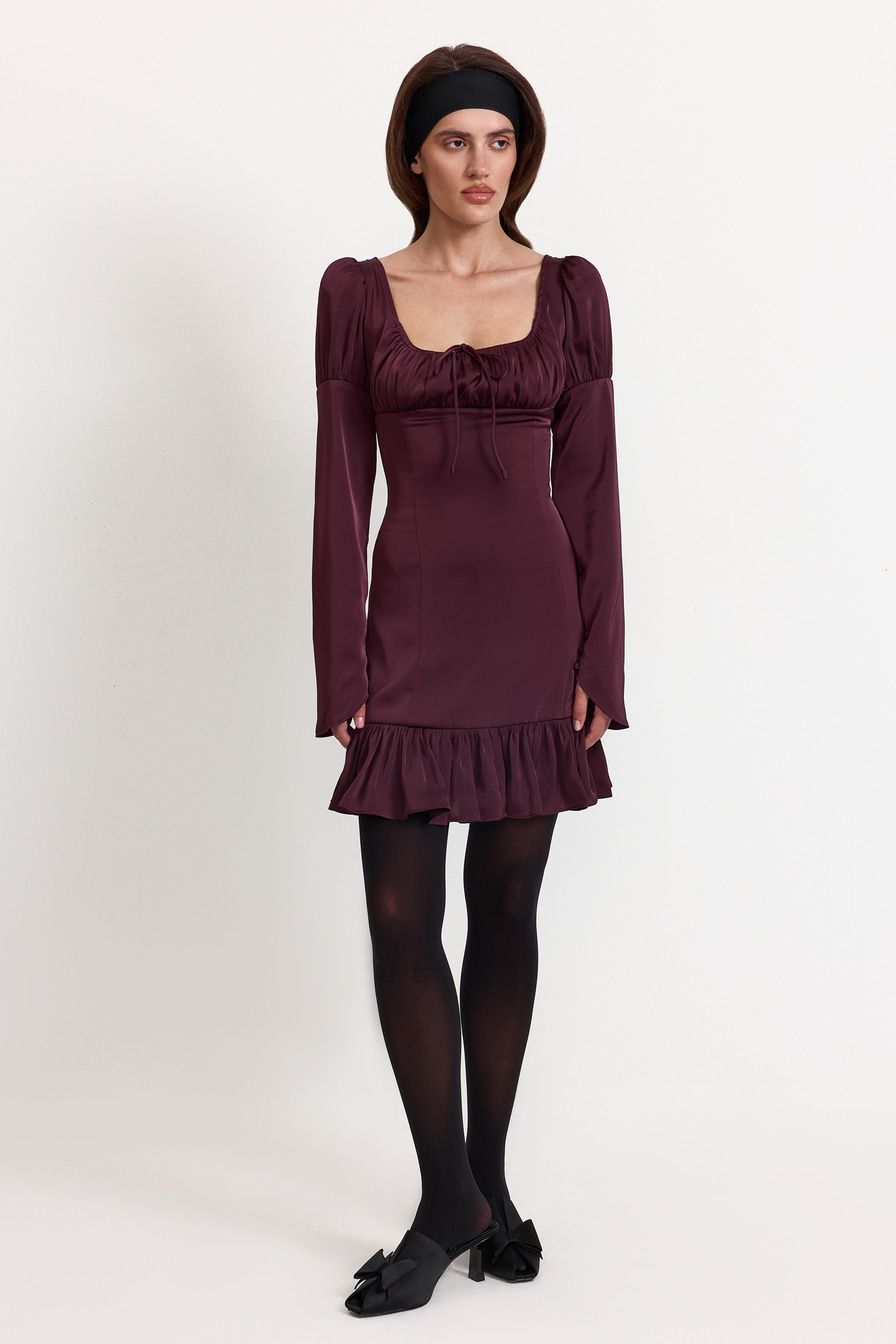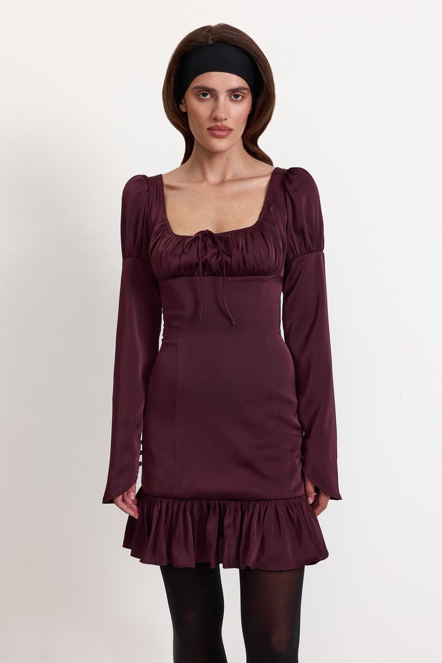 Темно-фиолетовое платье-мини – модель приталенного кроя с высокой линией лифа. Платье декорировано воланом.