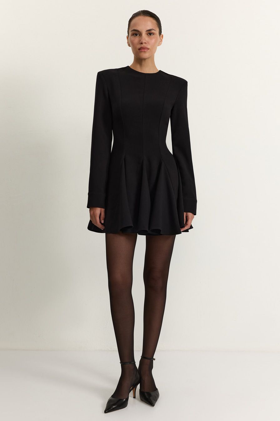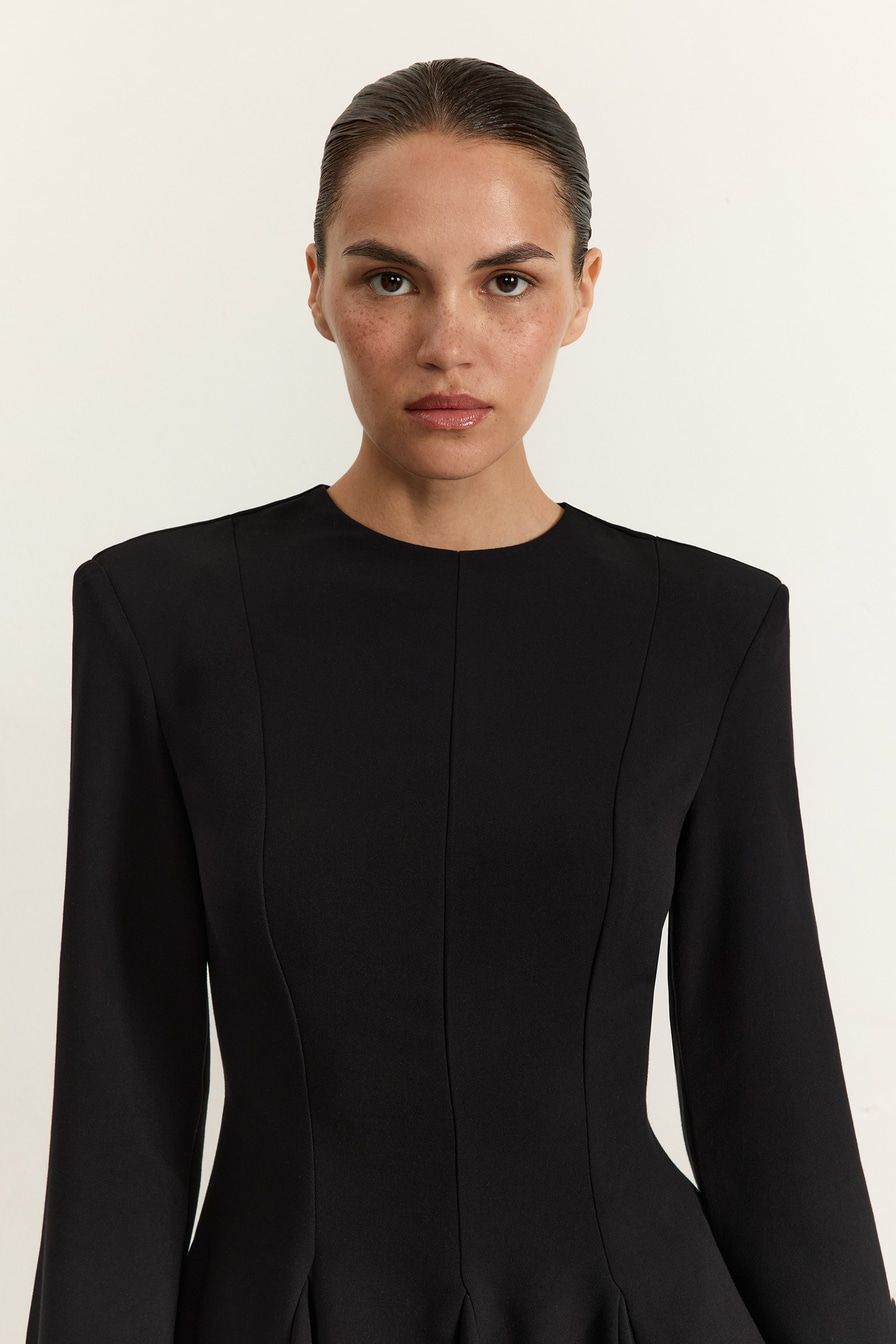 Черное платье-мини из смесовой вискозы – модель приталенного кроя с акцентными плечами. Платье дополнено клиньями на юбке и застежкой-молнией на спине.