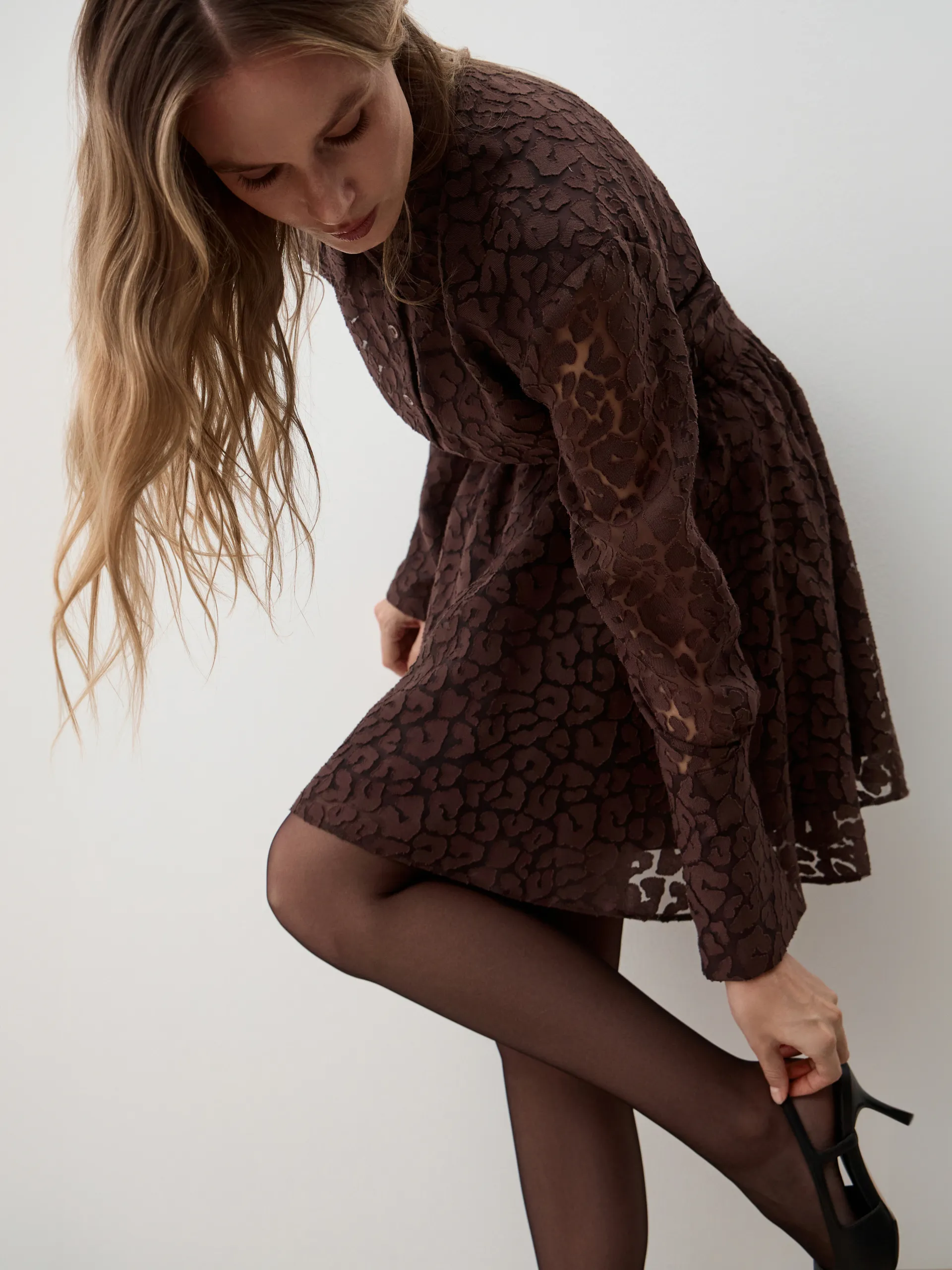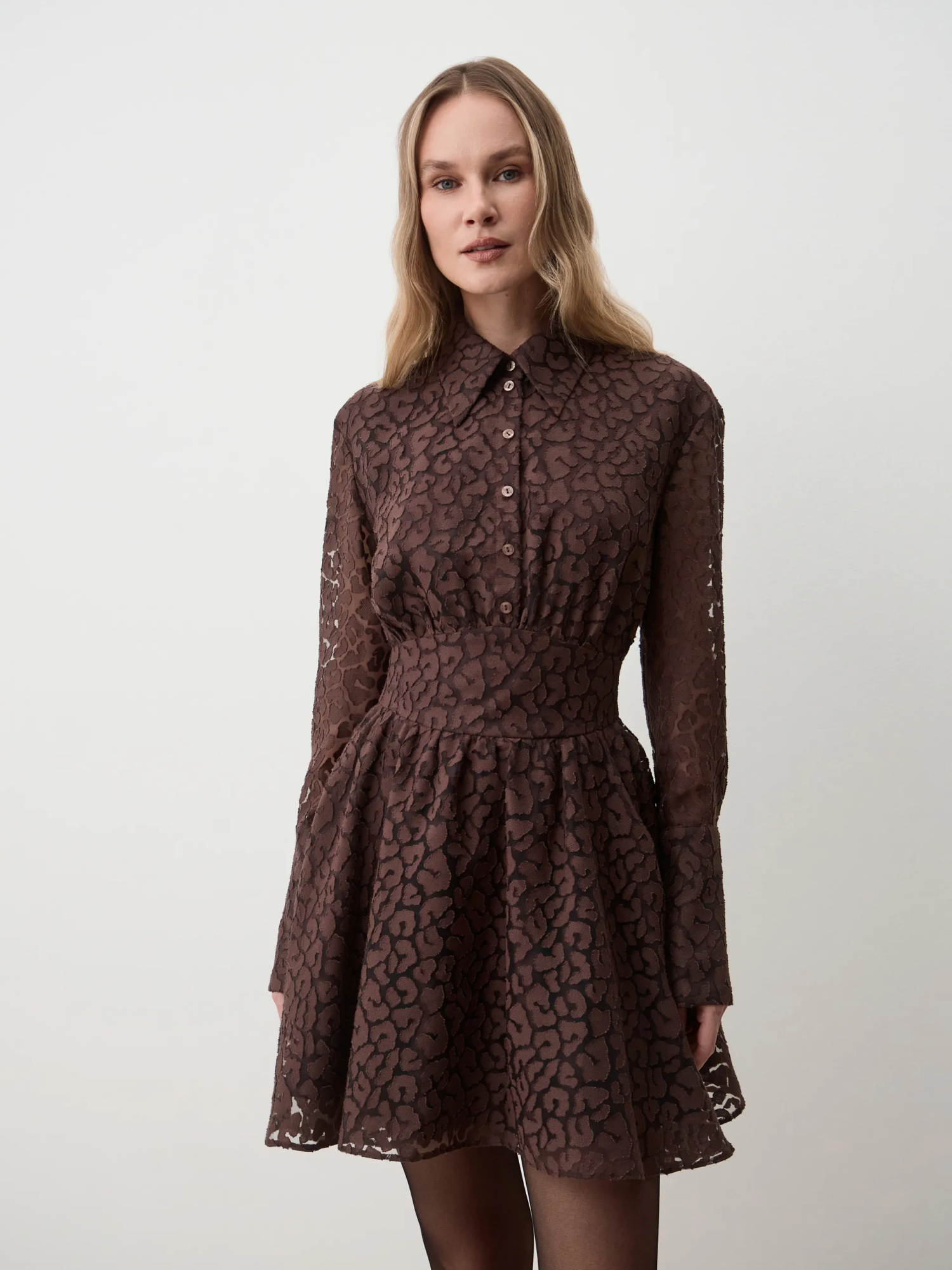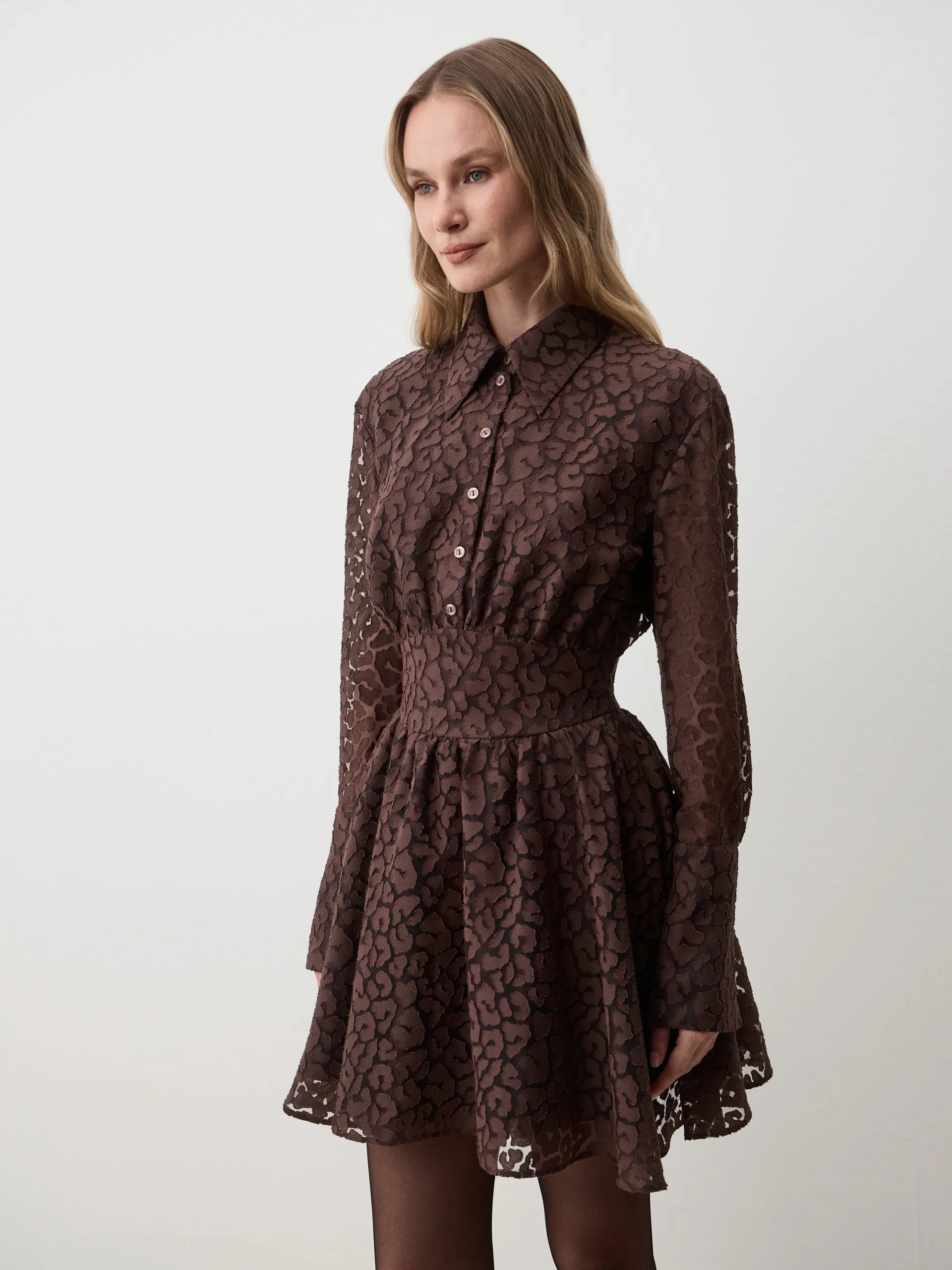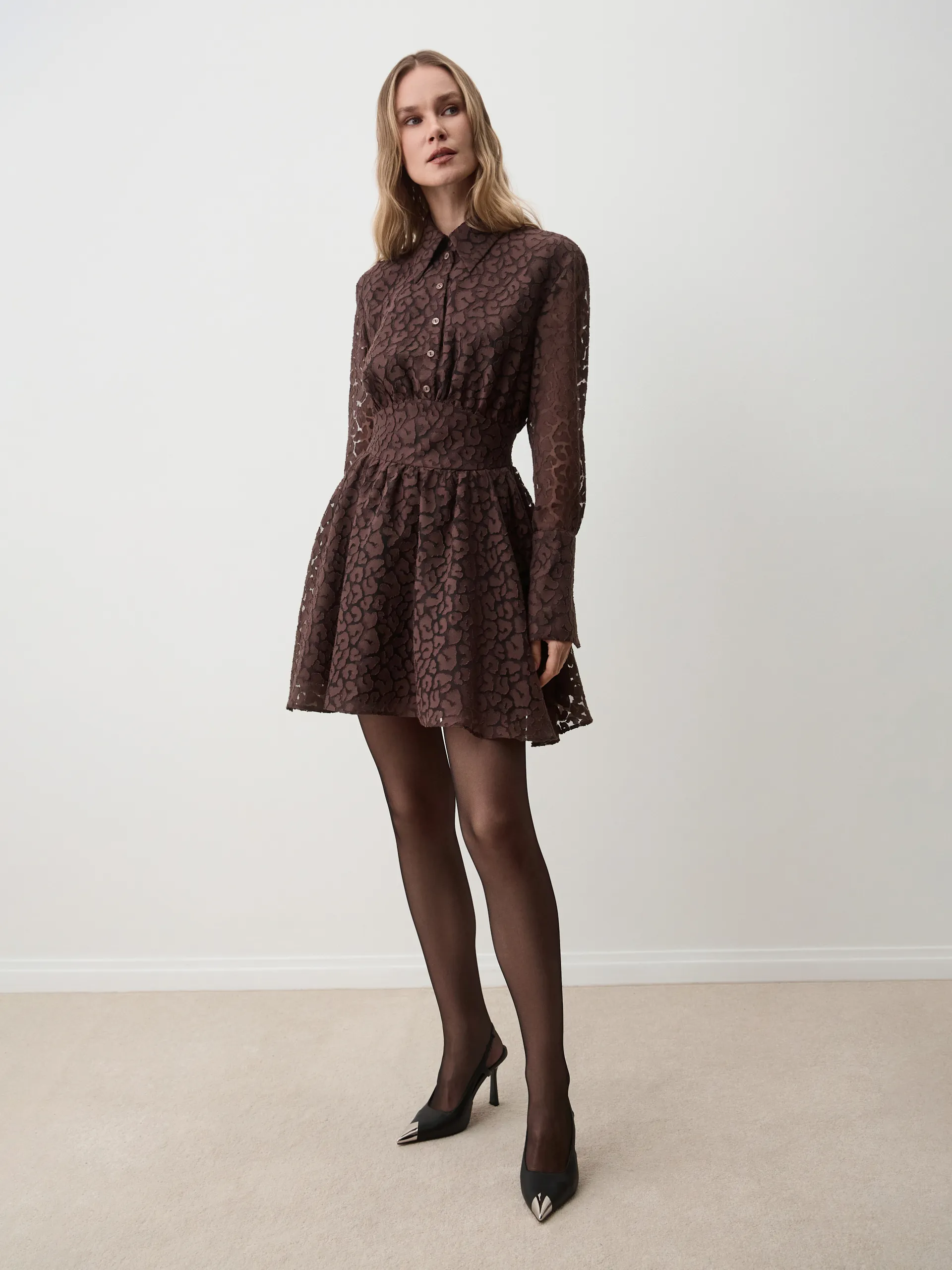 Платье Greti. Мини-платье приталенного силуэта с юбкой-солнцем выполнено из лёгкой вискозы с оригинальным принтом жираф в благородном шоколадном оттенке. Материал приятно ощущается на коже и обеспечивает комфорт в течение дня. Приталенный крой подчёркивает фигуру, а расклёшённая юбка придаёт объём и динамику образу. Игривый и запоминающийся принт делает модель акцентной и актуальной в новом сезоне. Рекомендуем носить с высокими сапогами для выразительного образа.