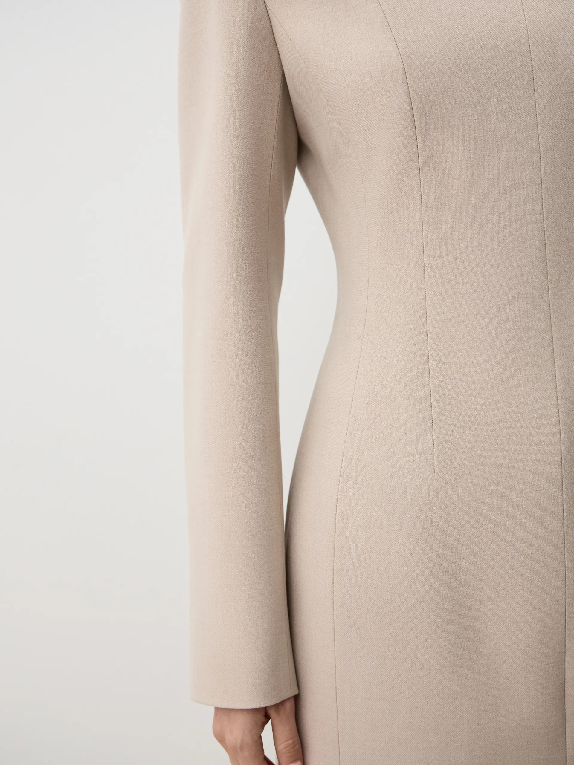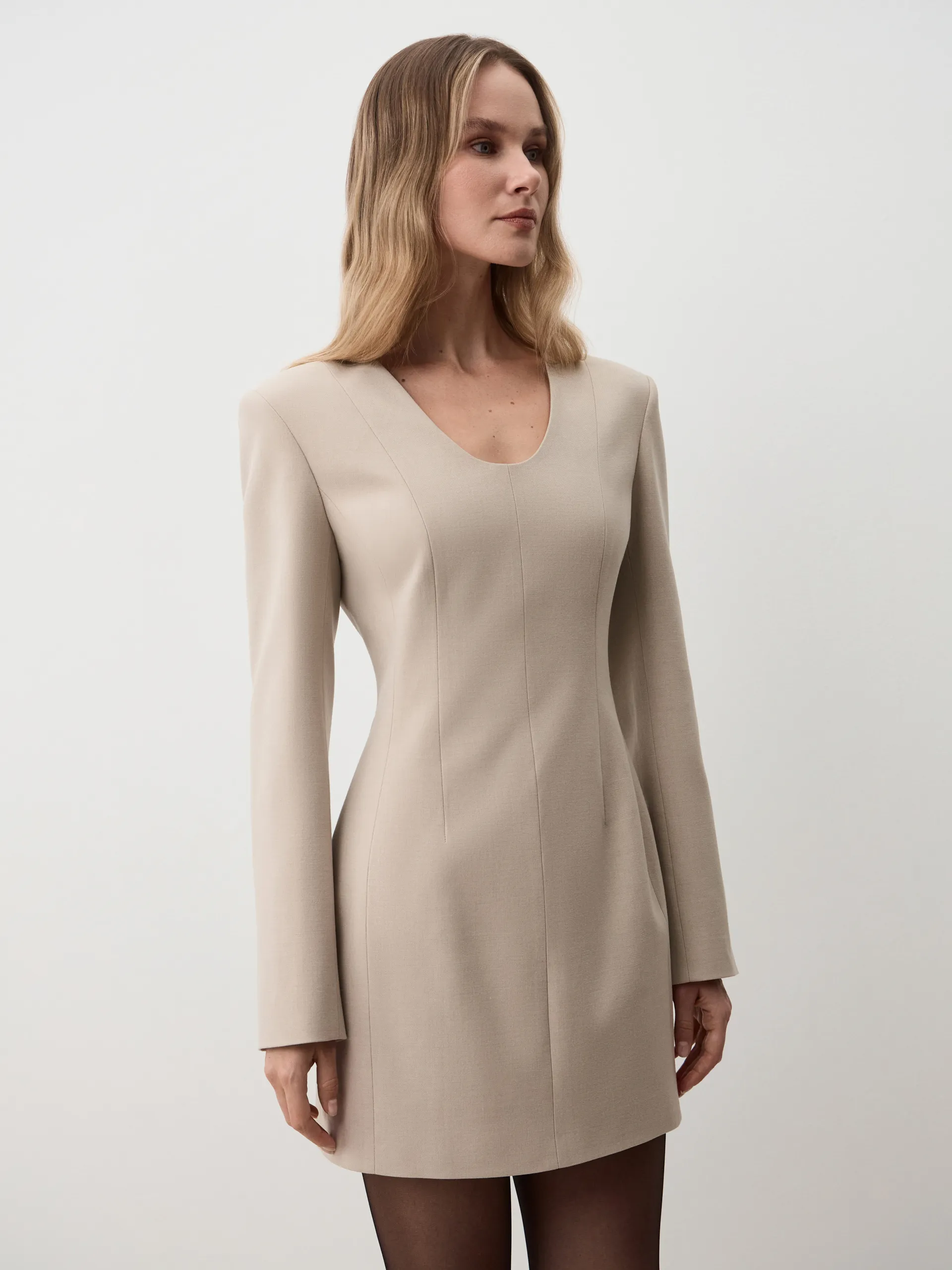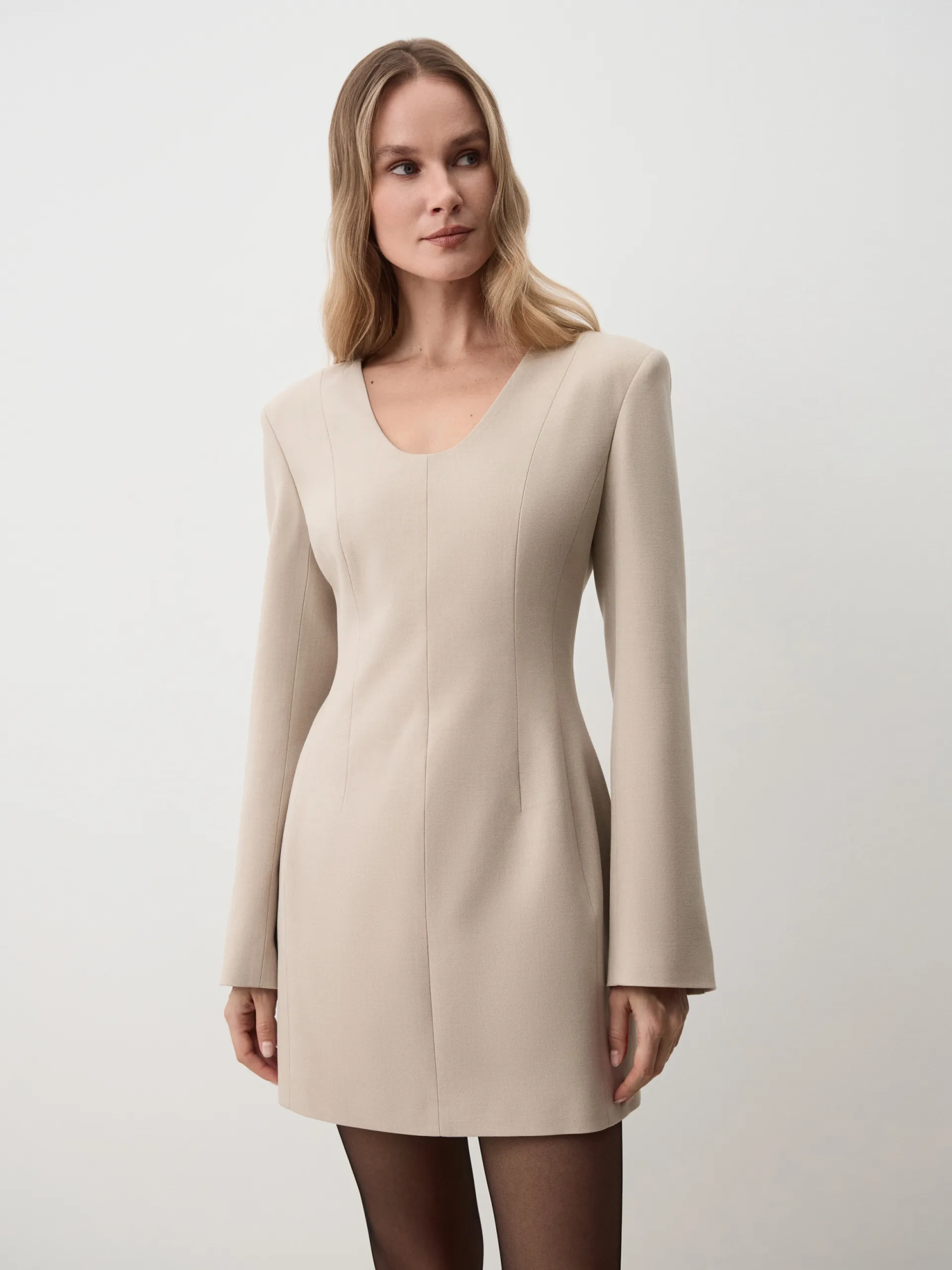 Платье Ricarda. Мини-платье из костюмной ткани с высоким содержанием шерсти сочетает в себе элегантность и комфорт. Благодаря плотной фактуре ткань хорошо держит форму, подчёркивает линии фигуры и создаёт утончённый силуэт. Лаконичный крой дополнен акцентом на плечах, придающим образу геометрию и строгость. Такая модель идеально подходит для офисных будней, деловых встреч и городских выходов. Рекомендуем носить с классическими туфлями или сапогами, дополнять минималистичными аксессуарами и жакетом или кардиганом для более тёплых сочетаний.