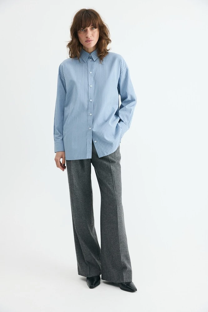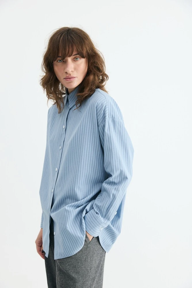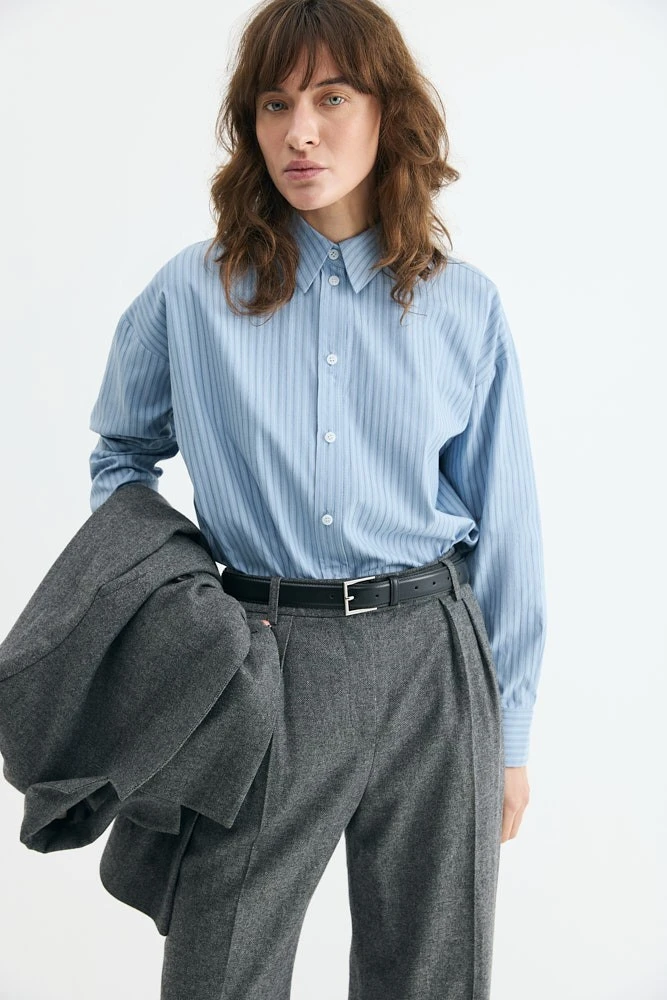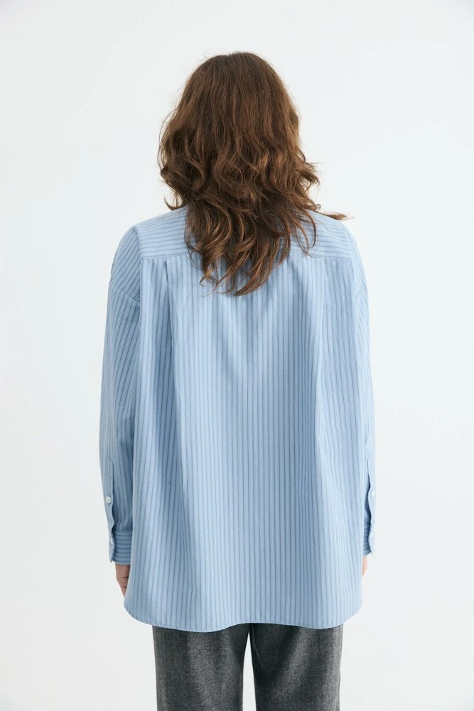 Рубашка свободного силуэта из хлопка. На спинке кокетка с двумя складками и разрезы с закругленными концами по бокам. Самодостаточная позиция для делового гардероба.