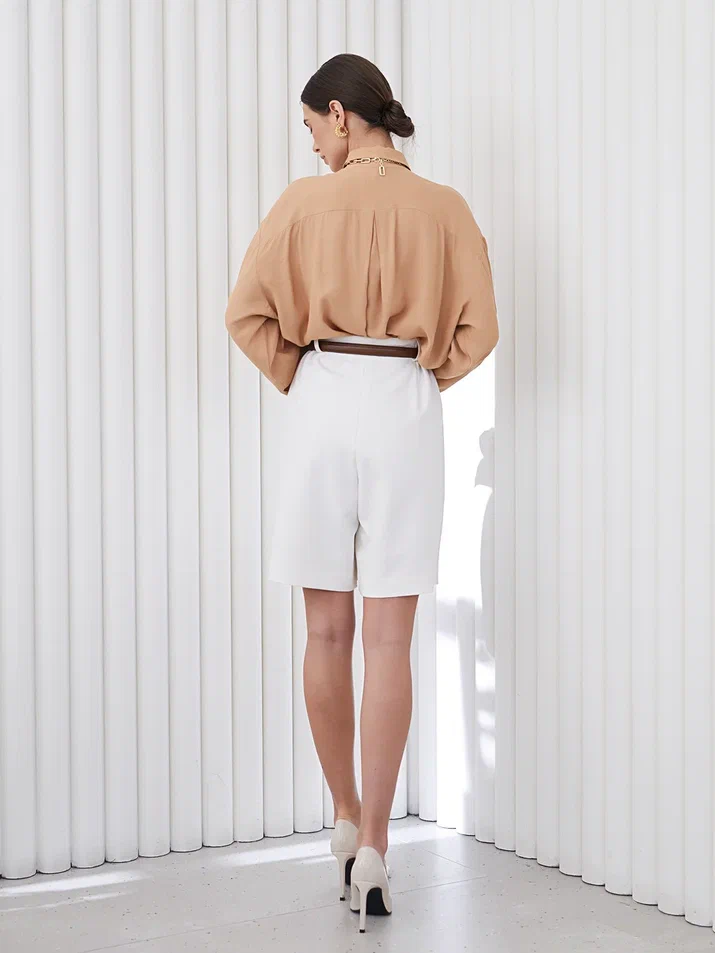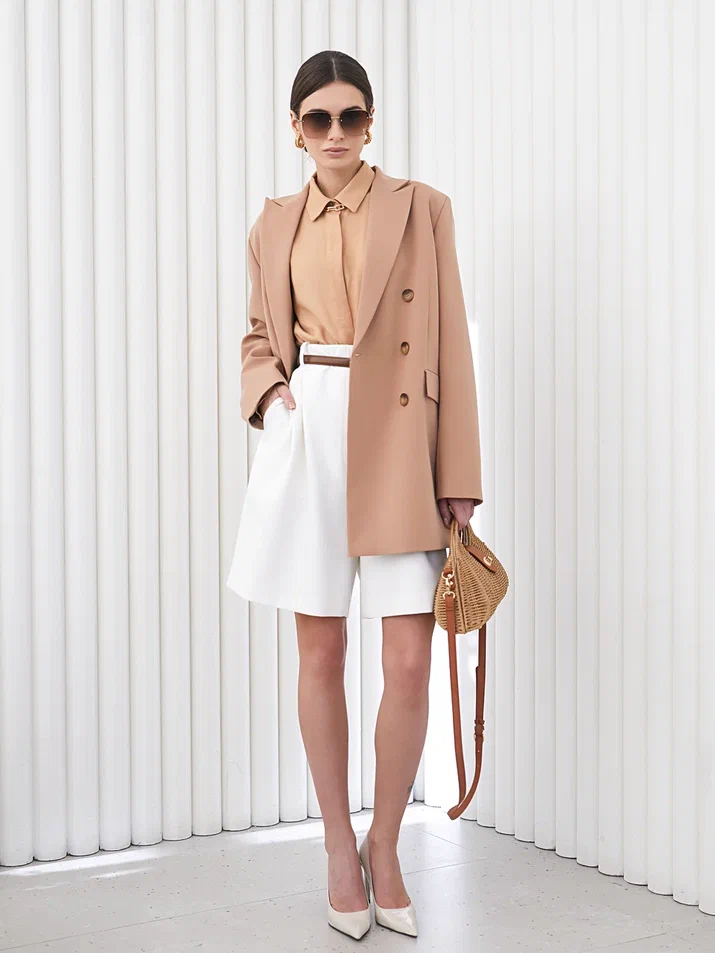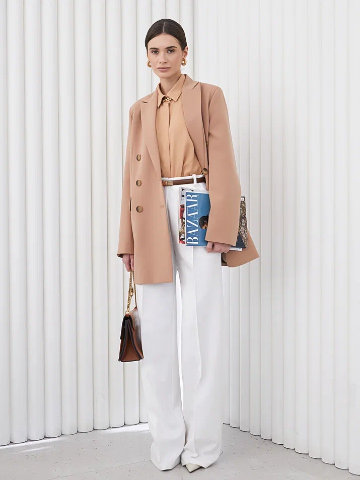 Прямой силуэт, спущенная линия плеча, встречная складка на спине, рубашечный воротник на невысокой стойке, манжета на двух пуговицах, пуговицы под планкой.