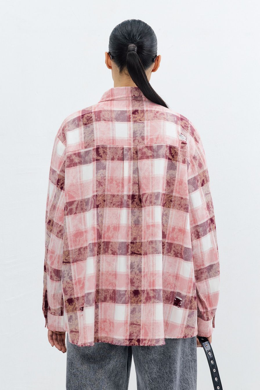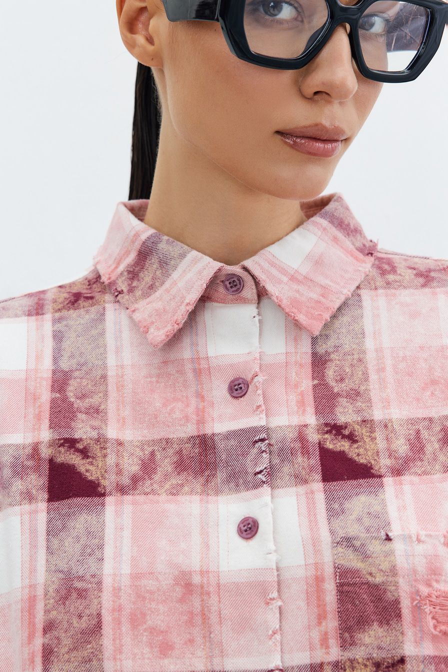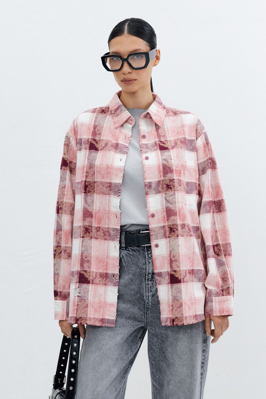 Рубашка из 100% хлопка – модель свободного кроя со спущенной линией плеч. Рубашка декорирована потертостями и клетчатым принтом с эффектом кислотной стирки.