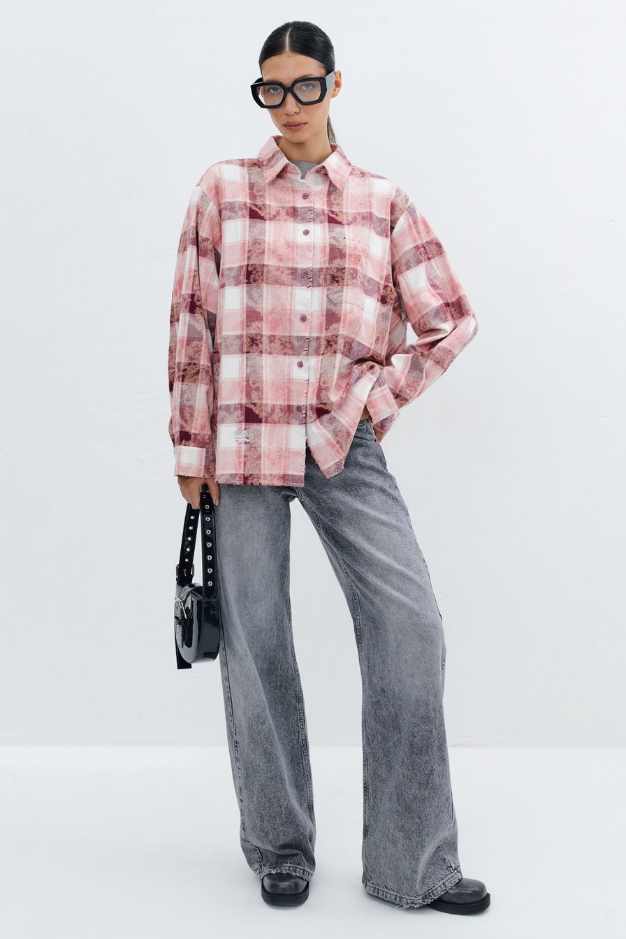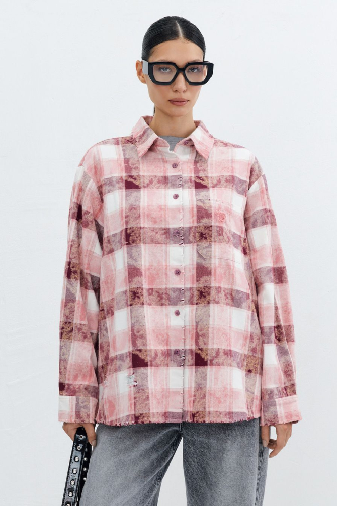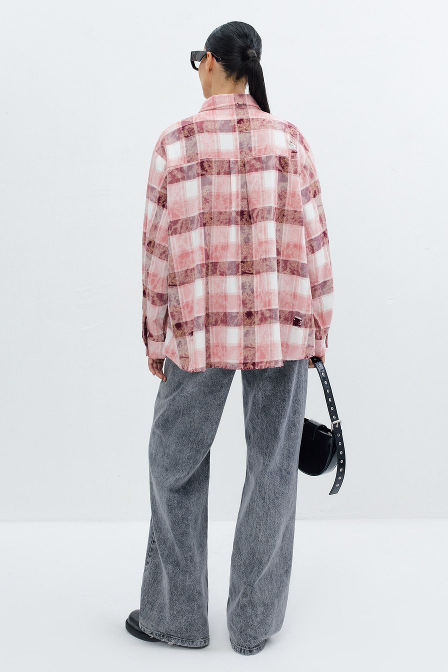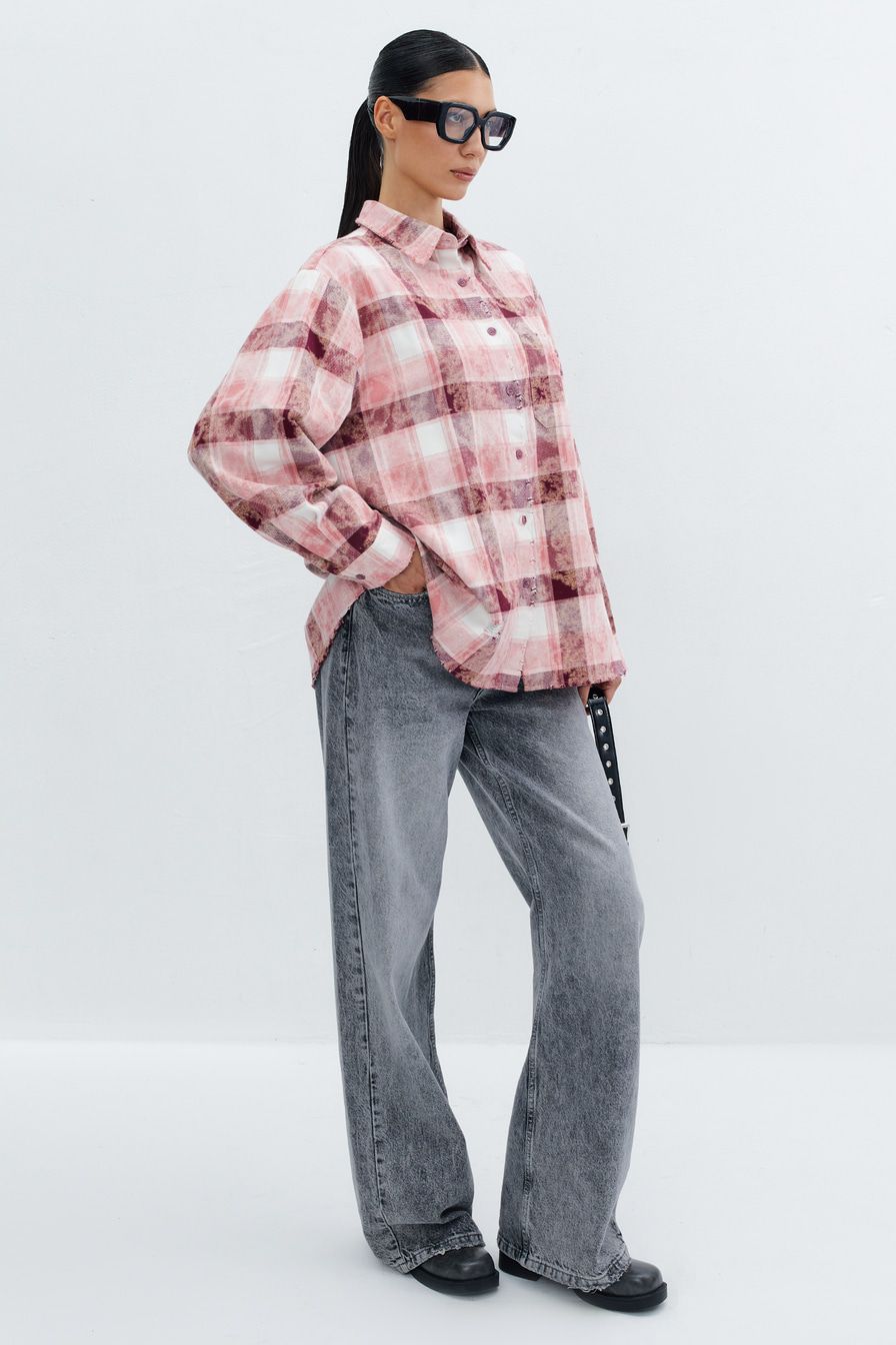 Рубашка из 100% хлопка – модель свободного кроя со спущенной линией плеч. Рубашка декорирована потертостями и клетчатым принтом с эффектом кислотной стирки.