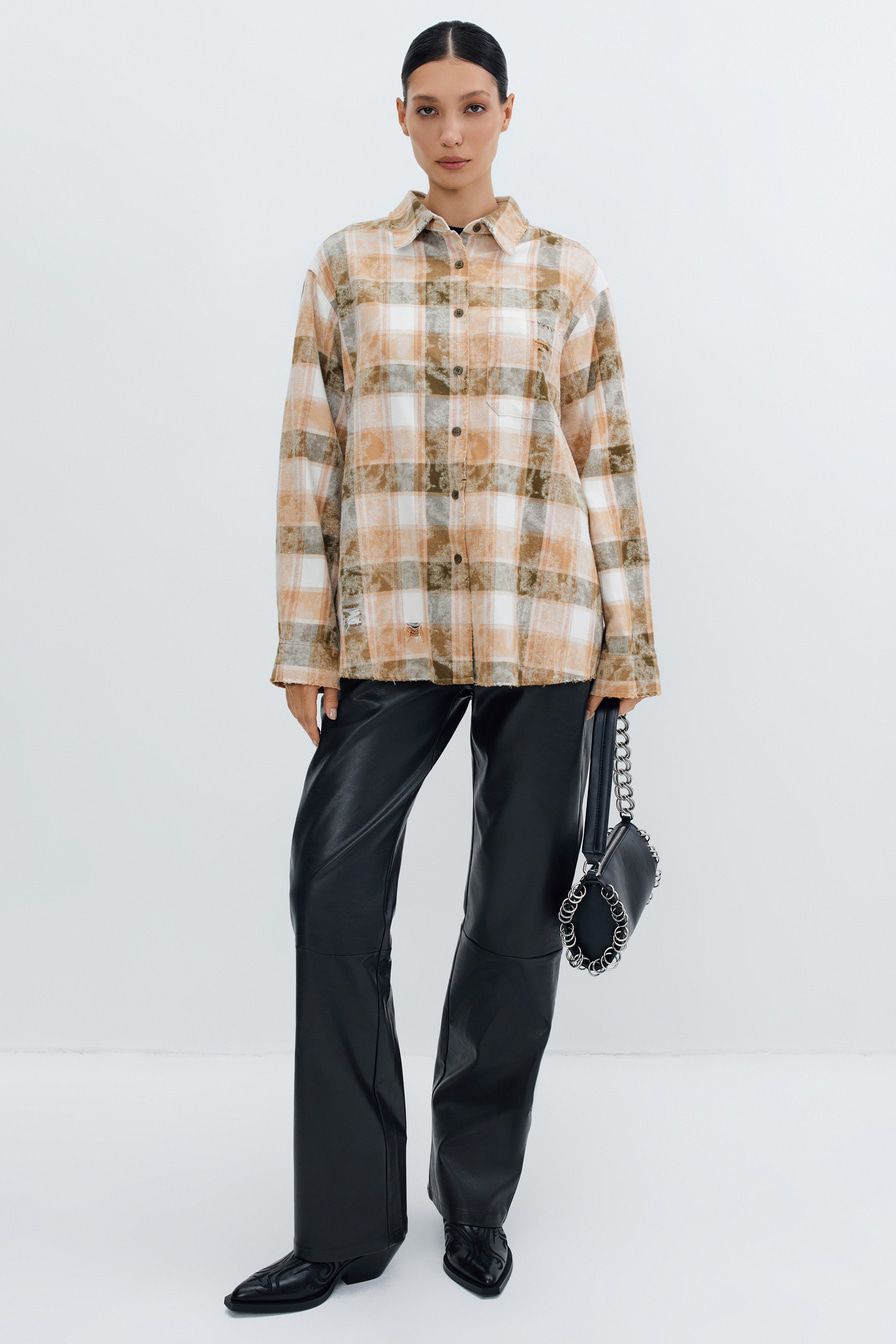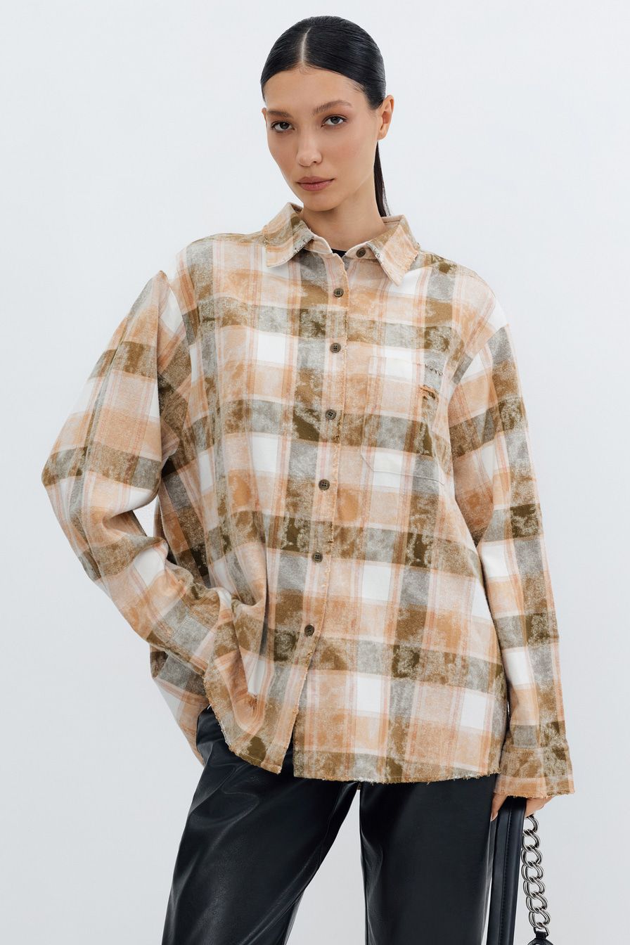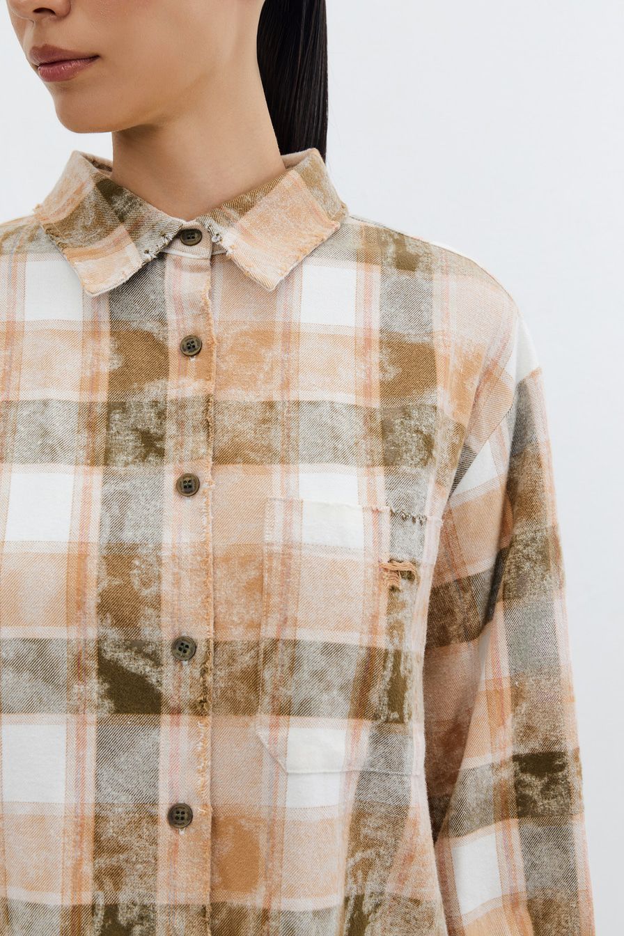 Рубашка из 100% хлопка – модель свободного кроя со спущенной линией плеч. Рубашка декорирована потертостями и клетчатым принтом с эффектом кислотной стирки.