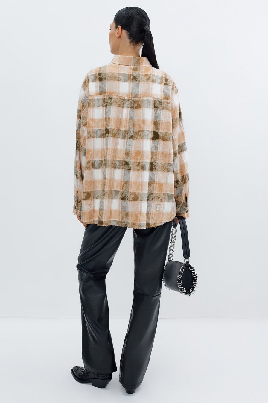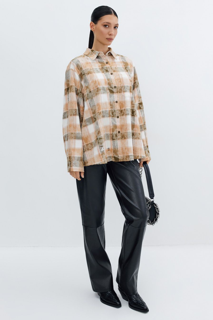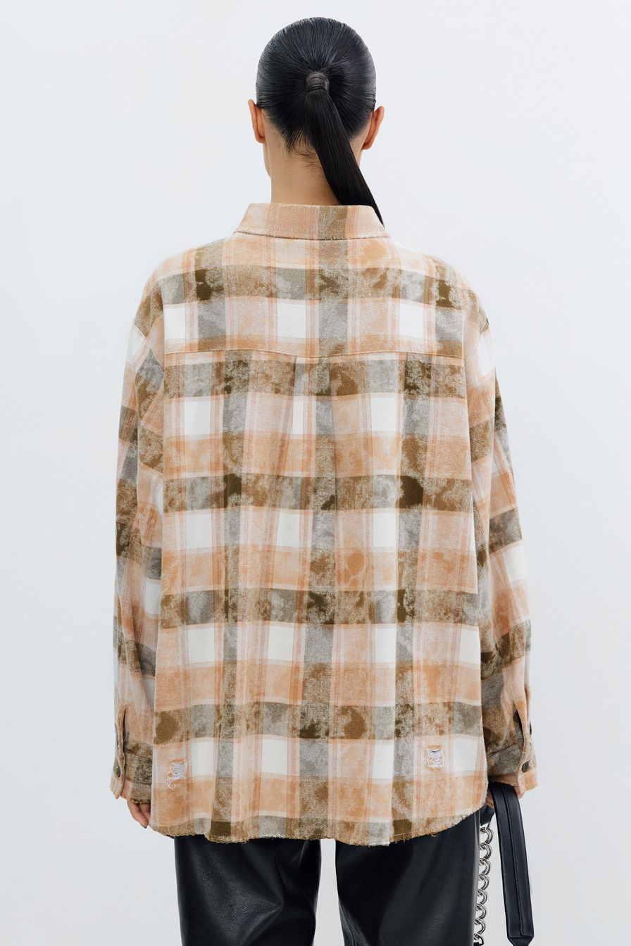 Рубашка из 100% хлопка – модель свободного кроя со спущенной линией плеч. Рубашка декорирована потертостями и клетчатым принтом с эффектом кислотной стирки.