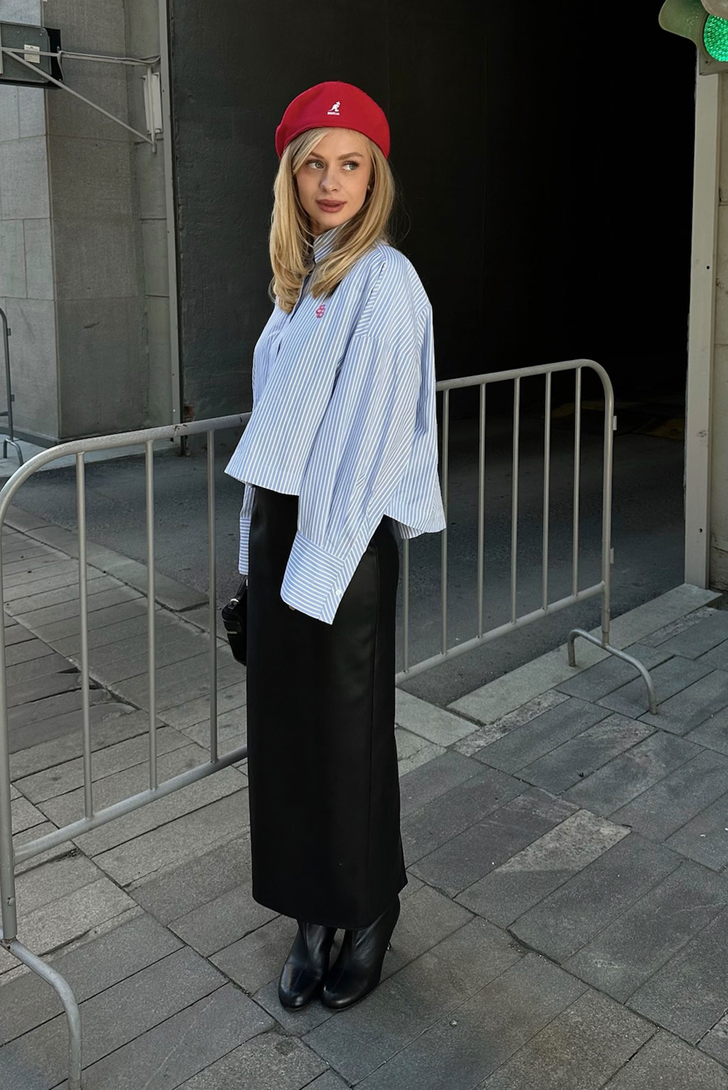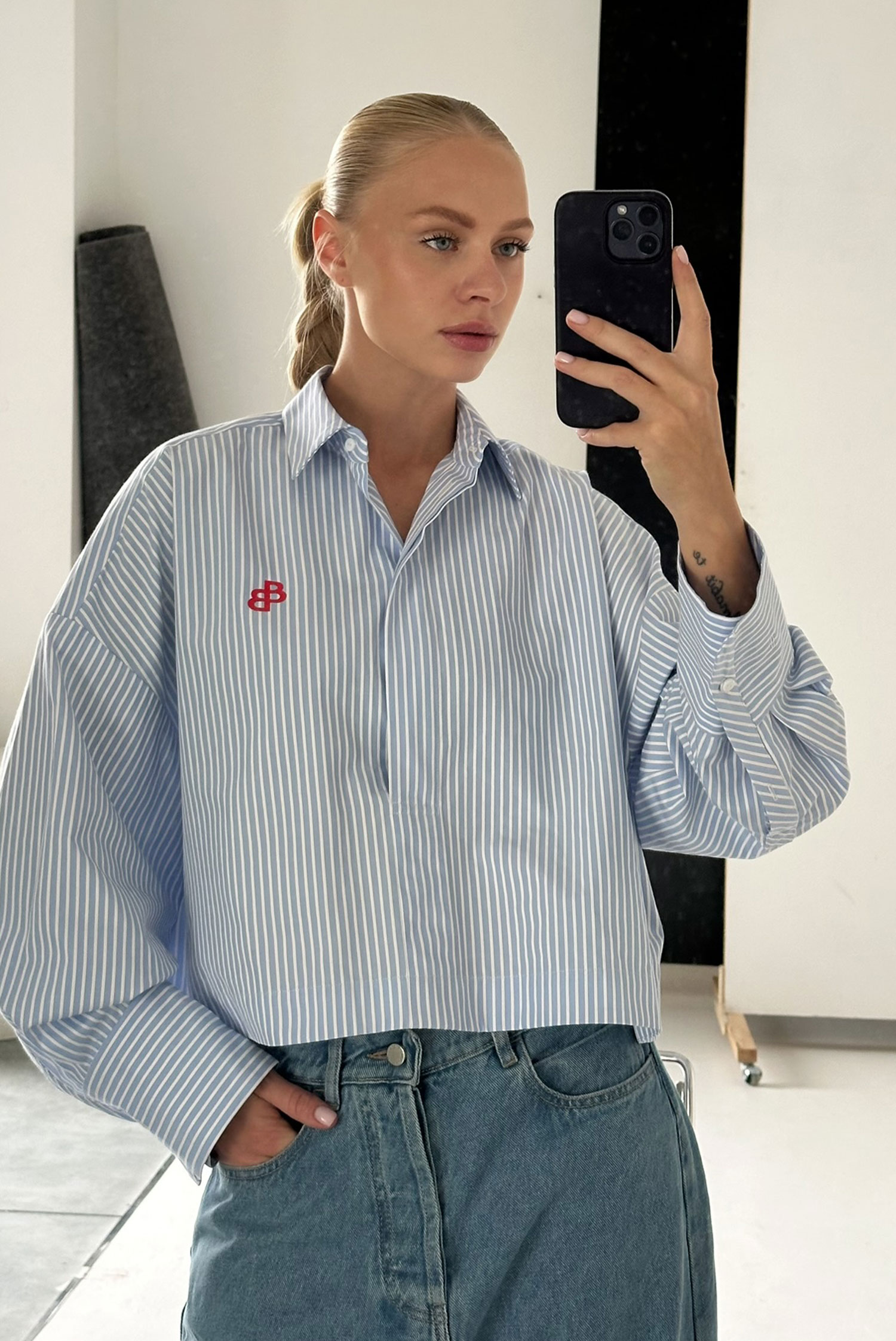 Рубашка объемного силуэта в полоску с отложным воротником на стойке и широкими манжетами. Застежка изделия на пуговицах. На передней части рубашки принт, нанесенный печатью - шелкография.