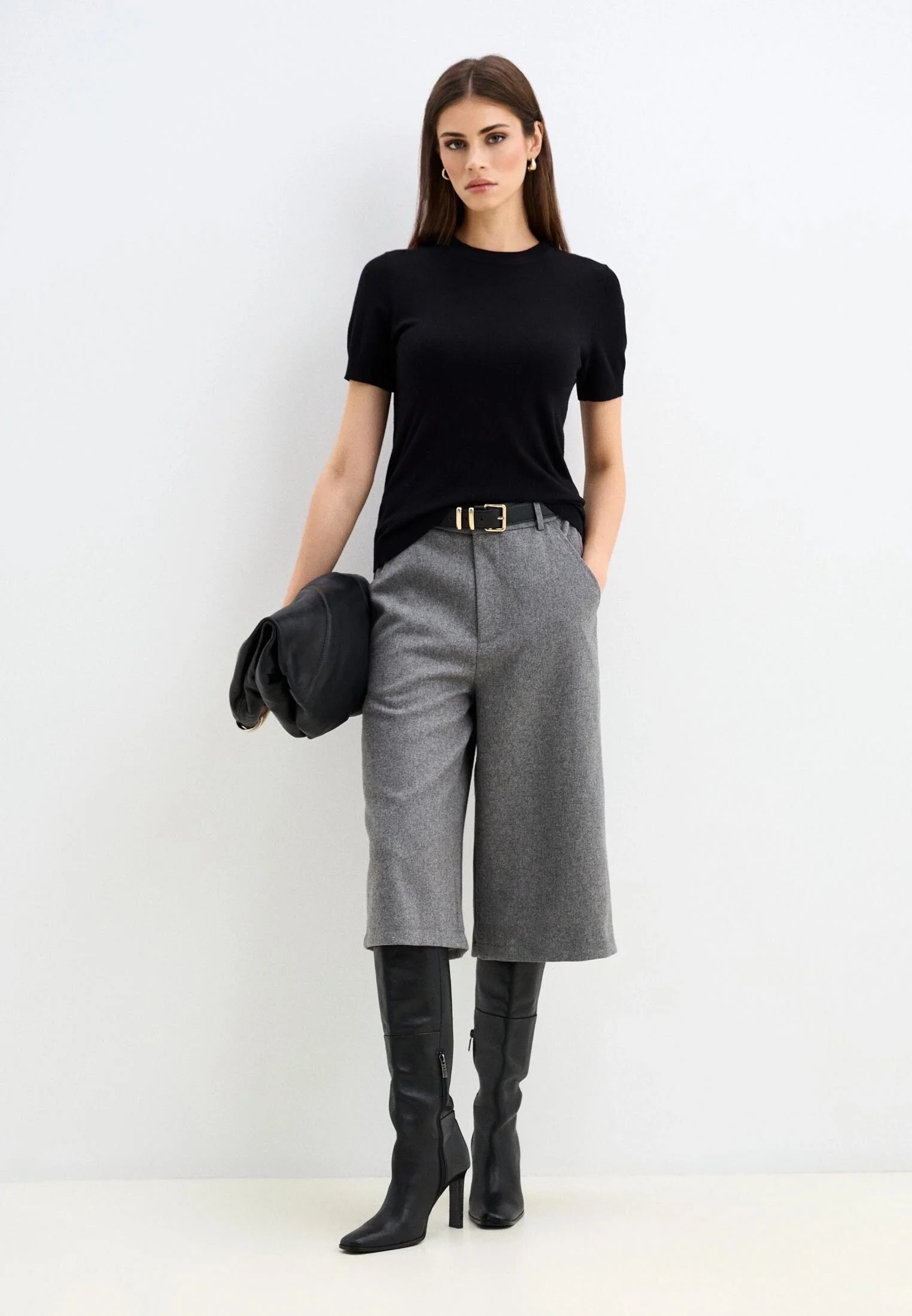 Дизайнерские шорты-кюлоты enevoo из плотной смесовой шерсти, которая не колется и комфортна в носке. Прямой широкий крой, длина чуть ниже колена и высокая посадка с аккуратным поясом создают современный силуэт. Мягкая текстура и минималистичный дизайн позволяют легко вписать модель в базовый гардероб. Сочетайте с сапогами до колена, ботильонами или массивными лоферами, а также с рубашкой, жакетом или свитером оверсайз.