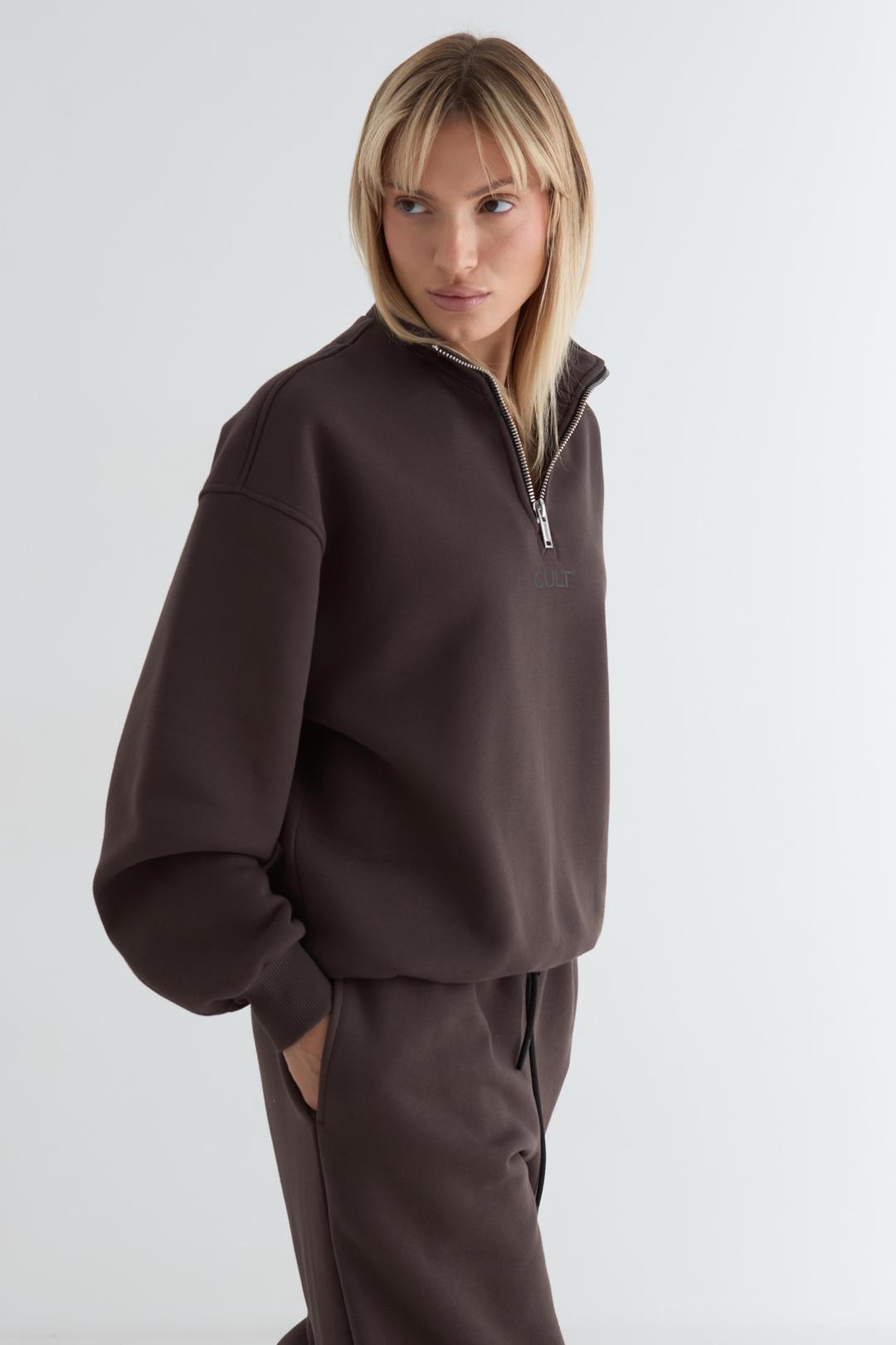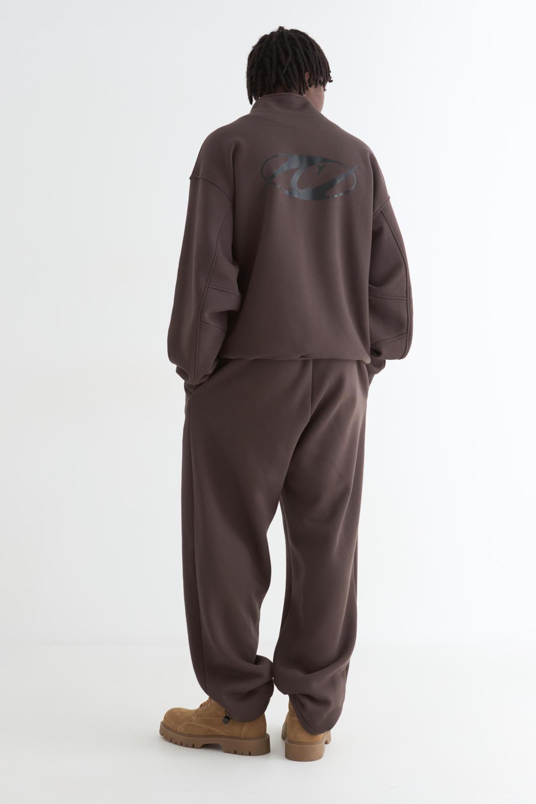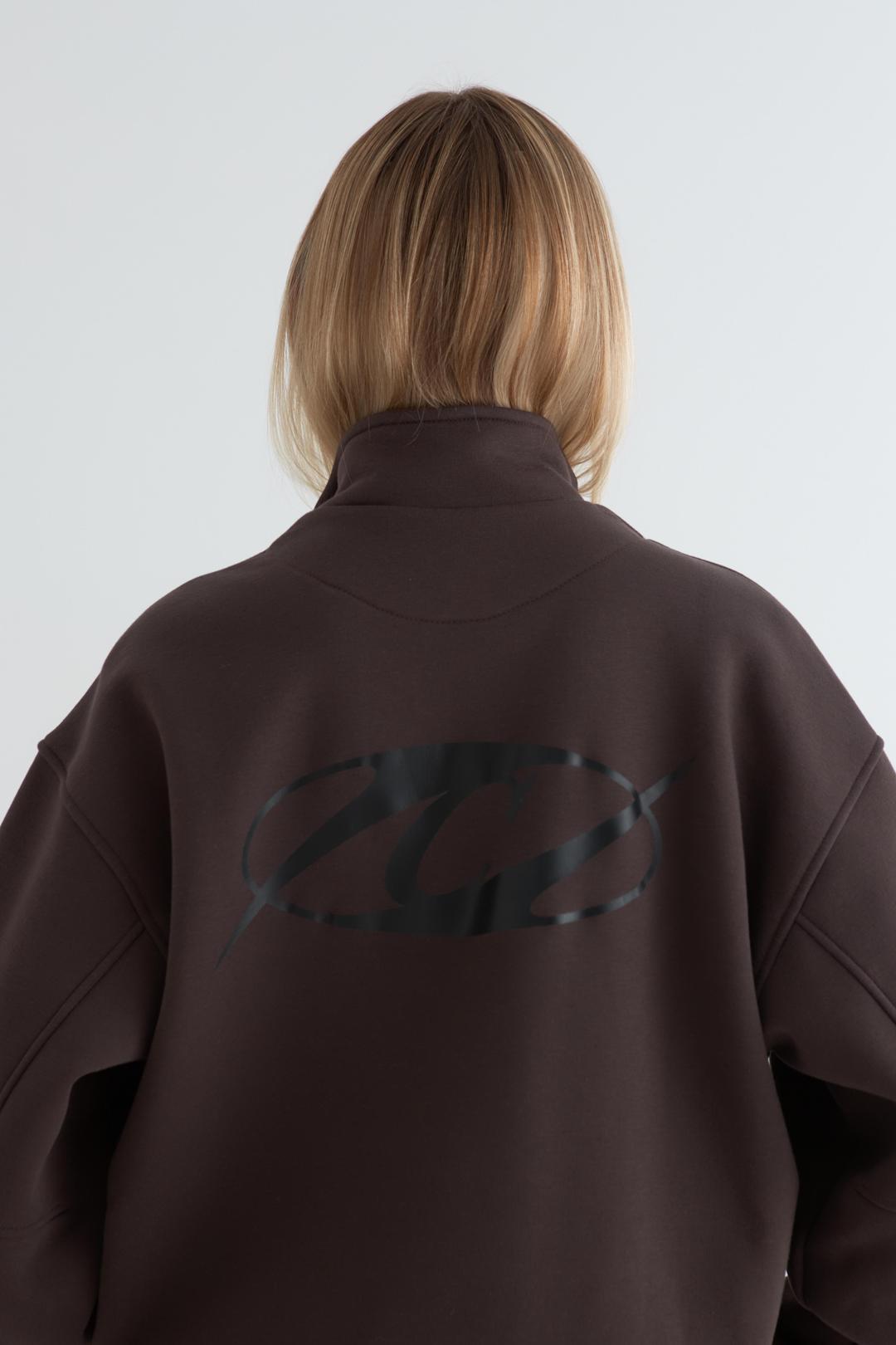 Анорак оверсайз со спущенным плечом из футера трехнитки с начёсом. Воротник на молнии. Манжеты и пояс из кашкорсе. По центру переда и спинки брендированные принты.