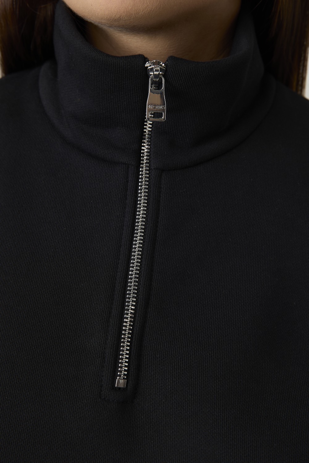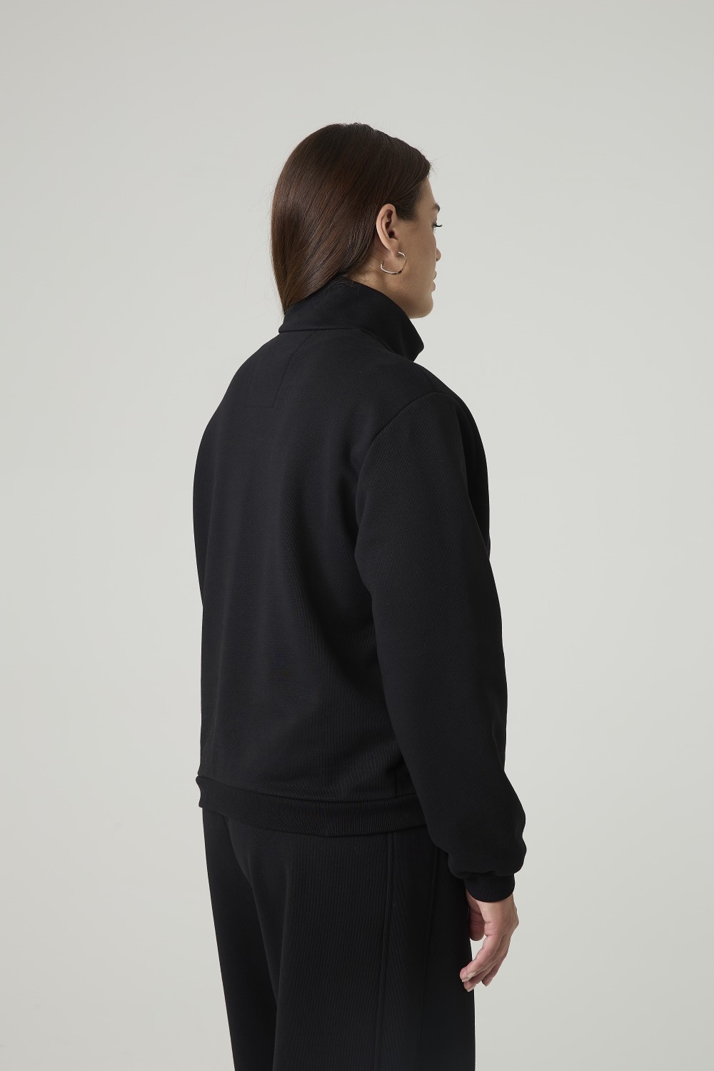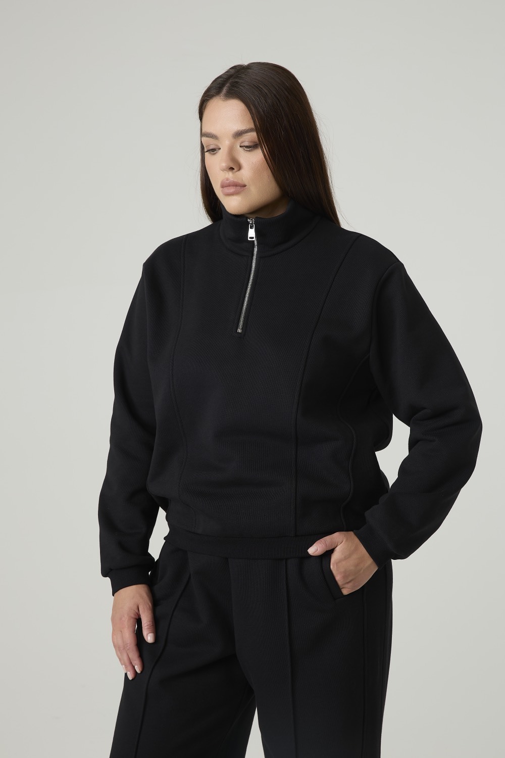 Женский свитшот выполнен из плотного трикотажного материала черного цвета. Модель имеет свободный силуэт с длинными рукавами и воротником стойкой на молнии до середины груди. Рукава и низ изделия оформлены эластичными манжетами для комфортной посадки и сохранения формы. Спереди расположены вертикальные швы, визуально структурирующие фасон.