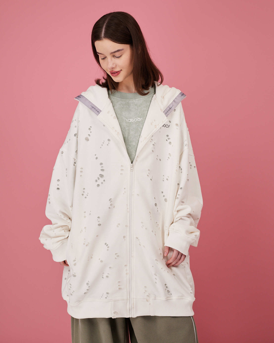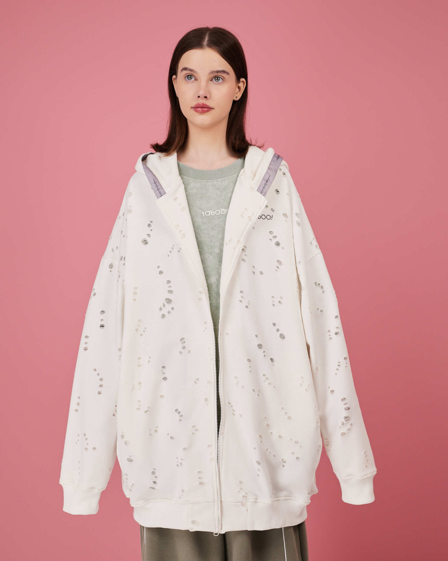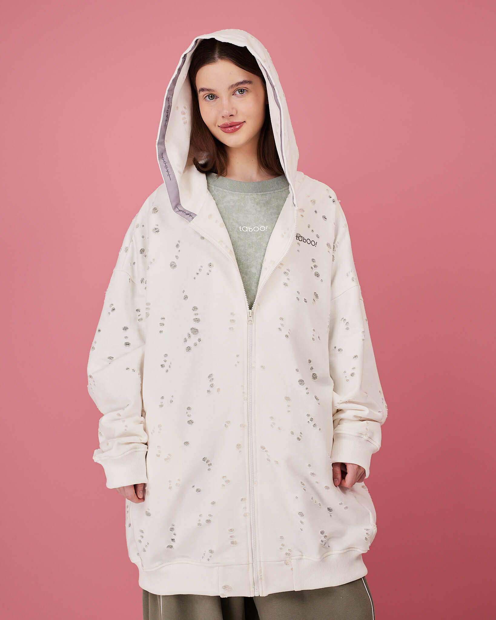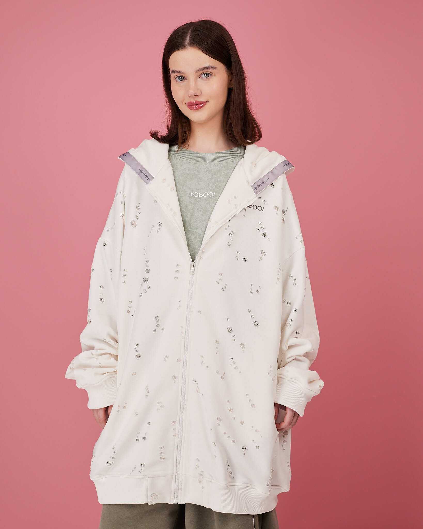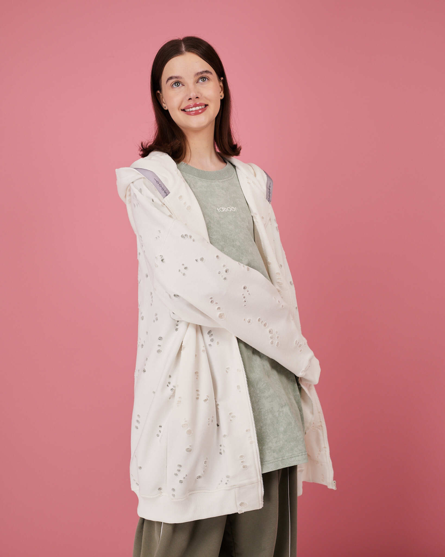 Табуха зип бренда ТАВОО - это объемный худи на молнии со спущенной линией плеча и нетипичным кроем, выполненный из мягкого футера с эффектом рваной ткани.⠀⠀⠀