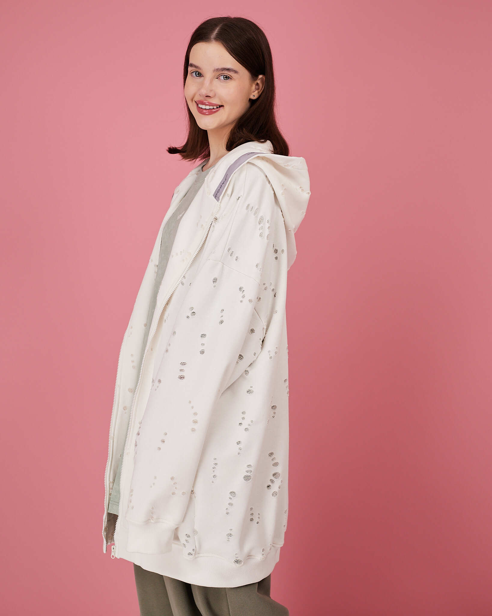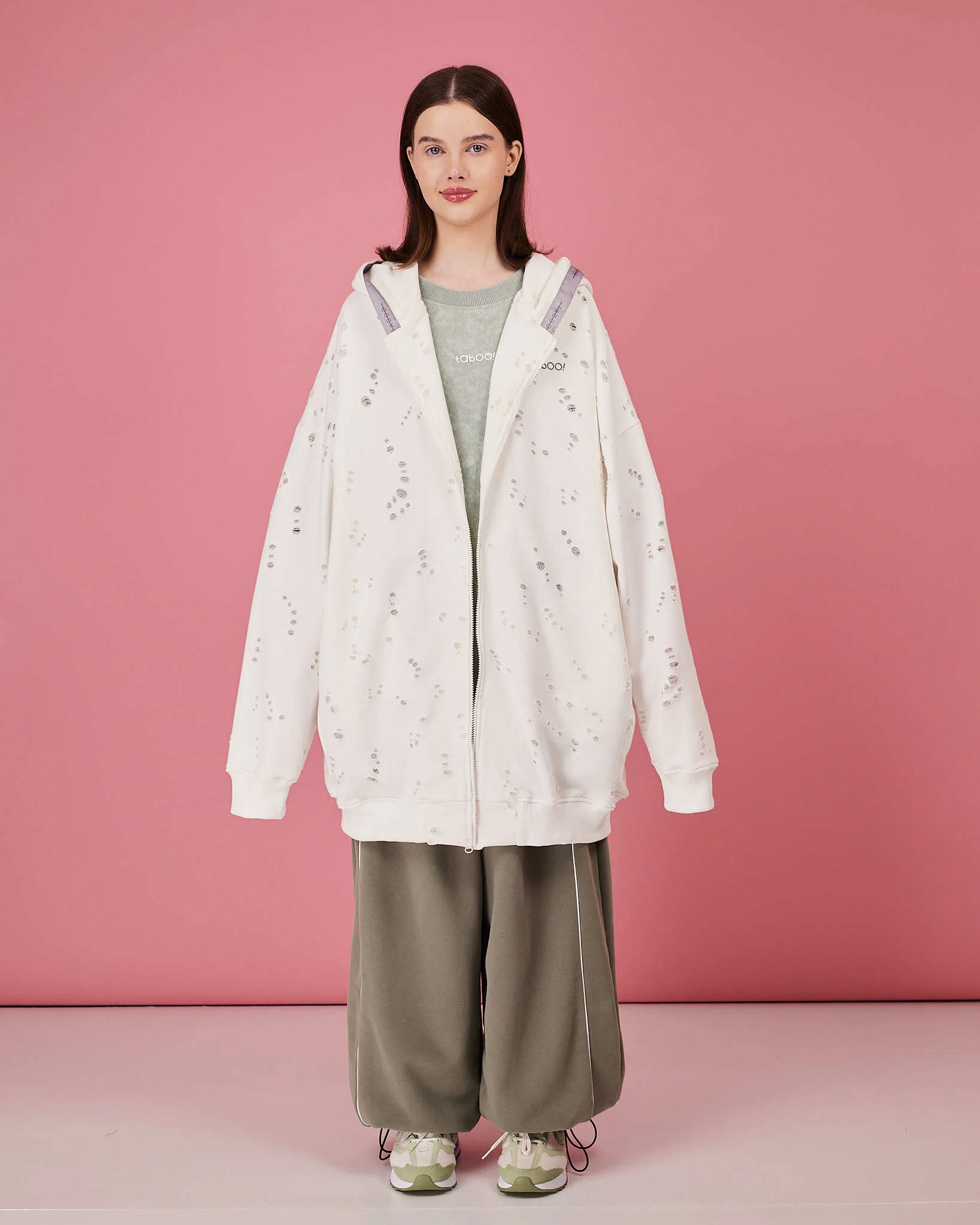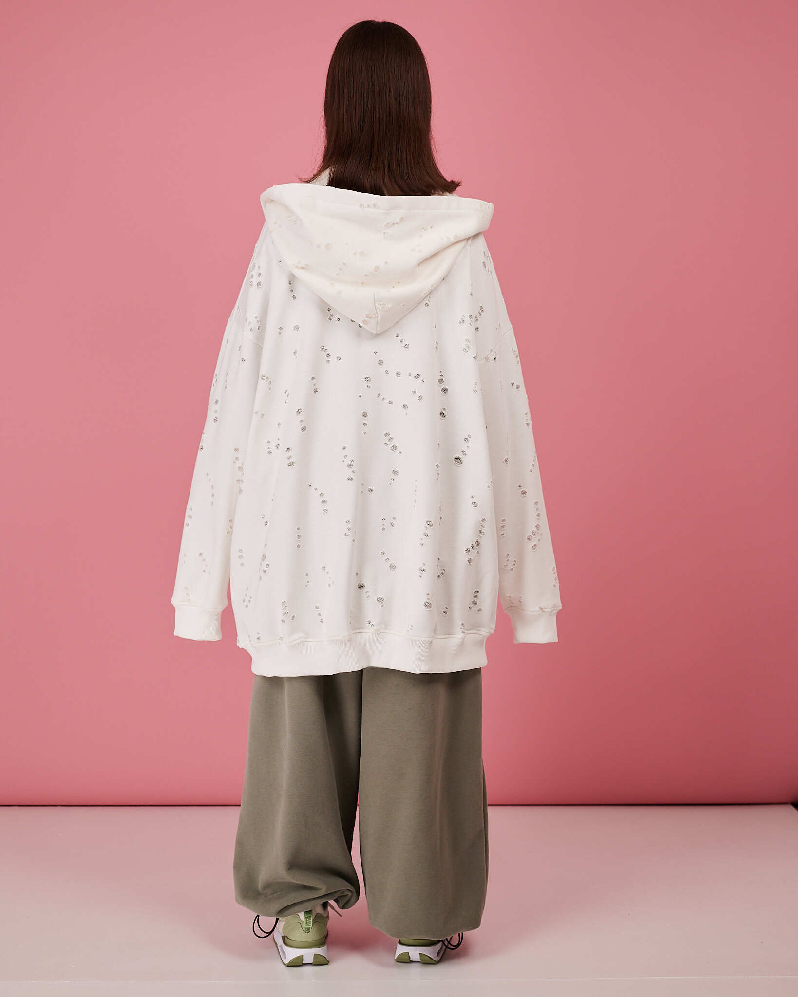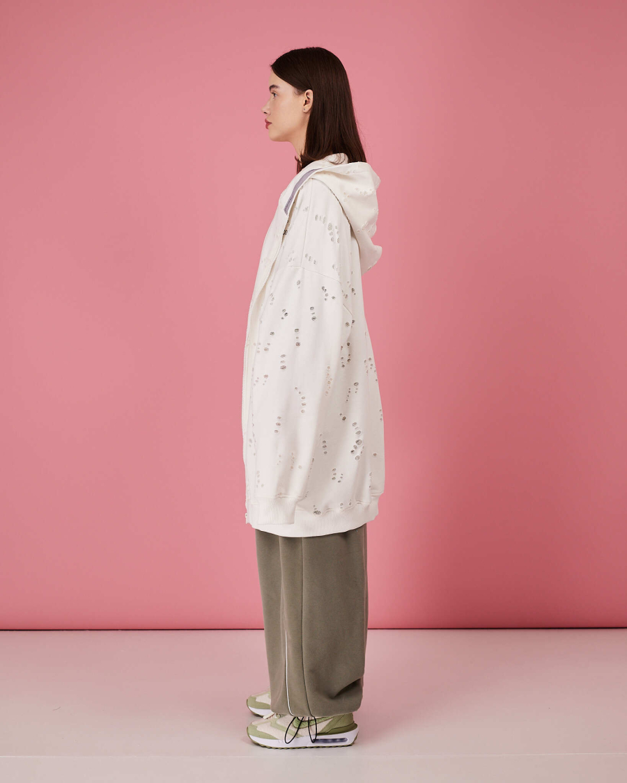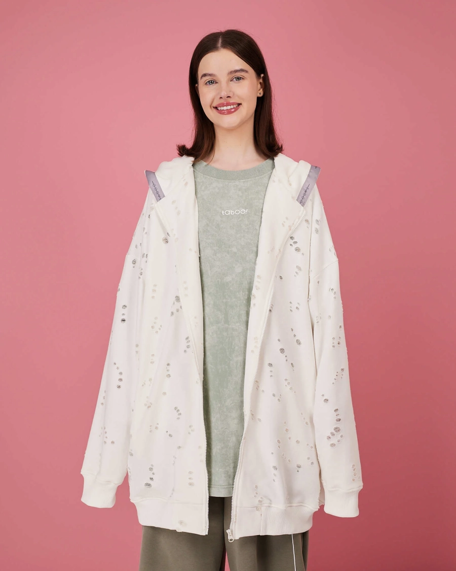 Табуха зип бренда ТАВОО - это объемный худи на молнии со спущенной линией плеча и нетипичным кроем, выполненный из мягкого футера с эффектом рваной ткани.⠀⠀⠀