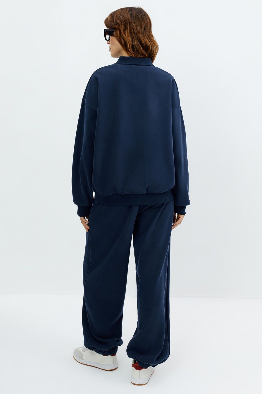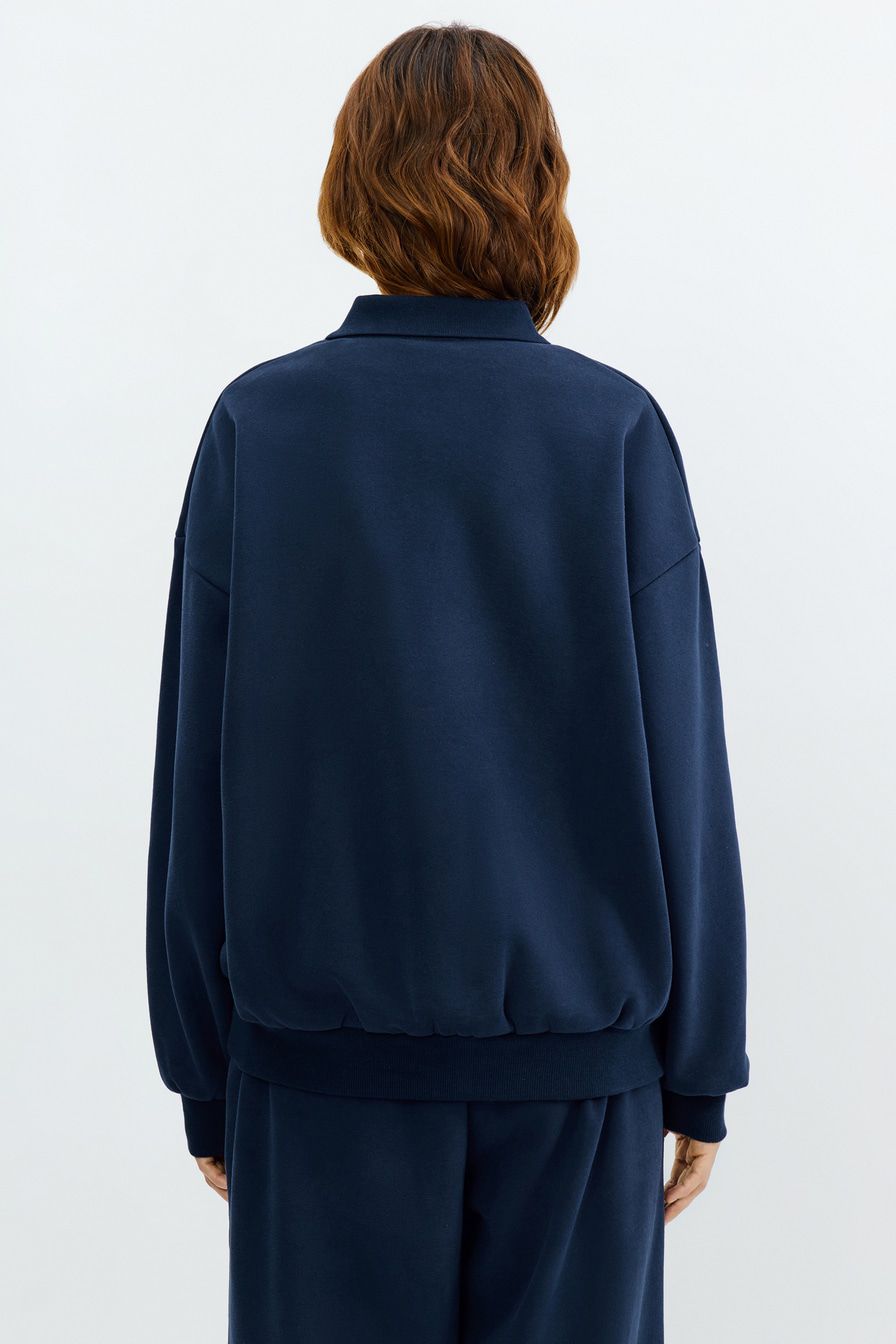 Темно-синий оверсайз-свитшот выполнен из двухслойного материала: верх – из натурального хлопка, а низ – из пушистого экомеха. Модель дополнена воротником-поло и декорирована принтом с логотипом бренда.