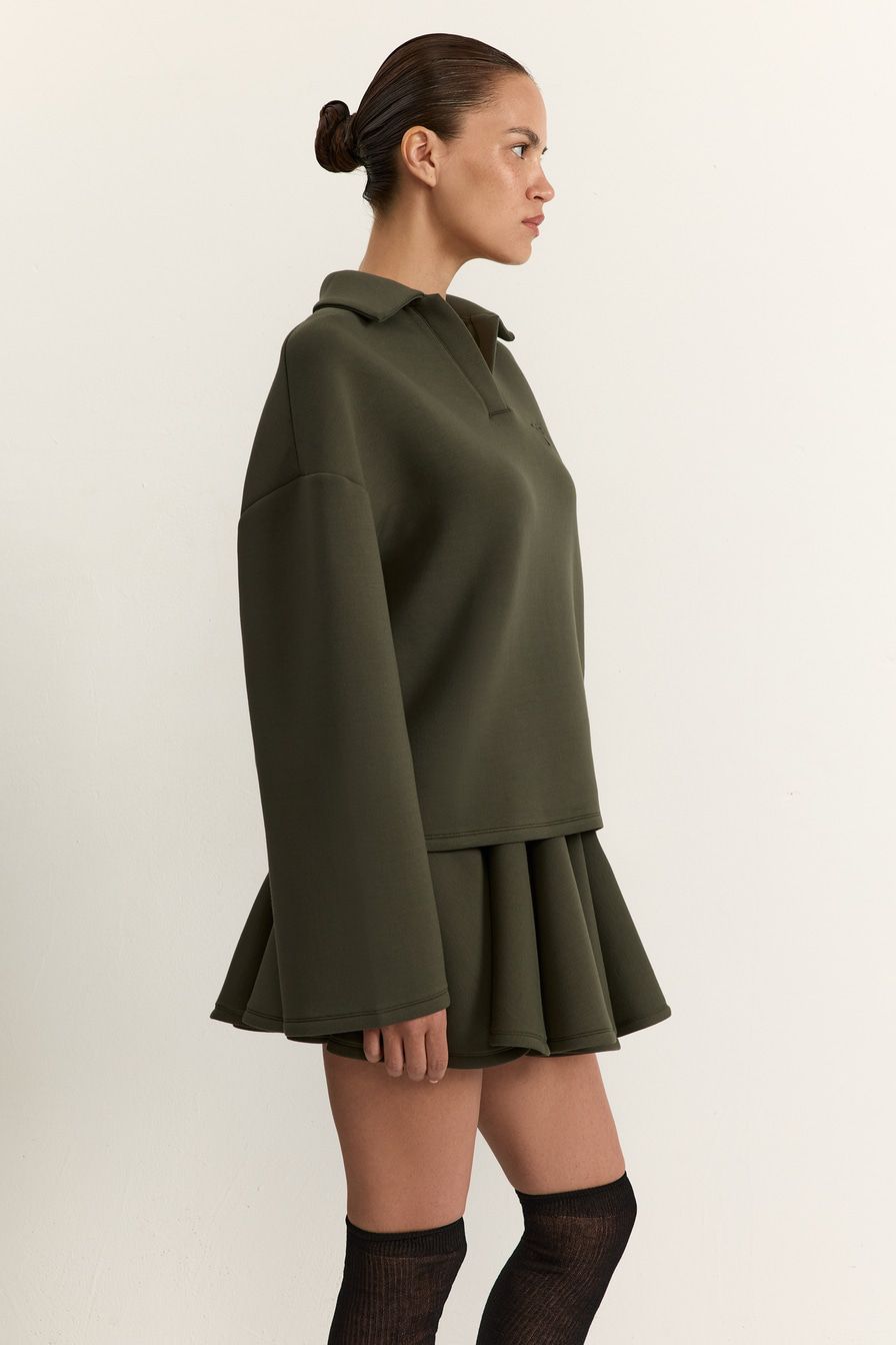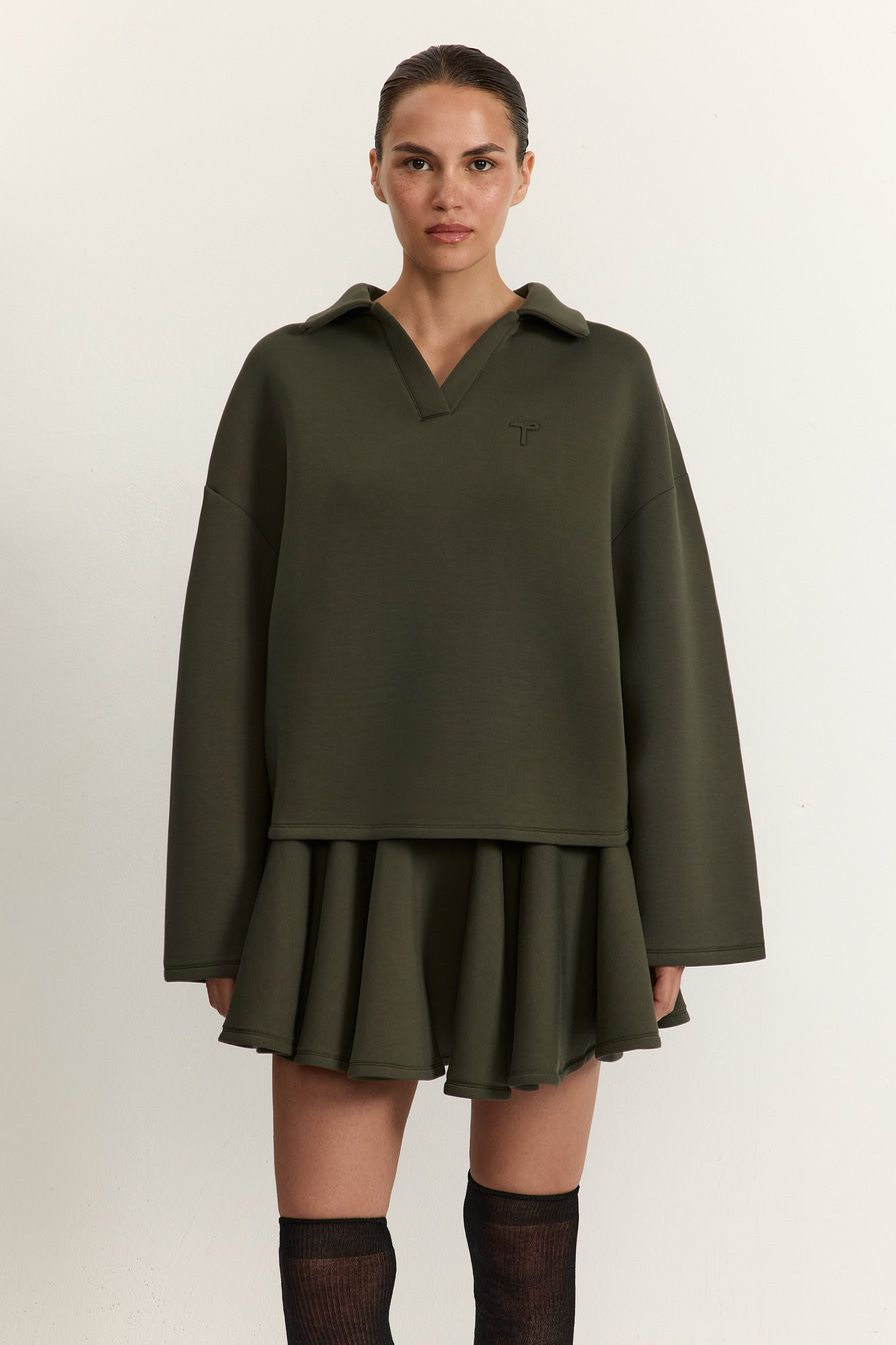 Темно-зеленый лонгслив из смесовой вискозы – модель оверсайз-кроя со спущенной линией плеч. Лонгслив дополнен отложным воротником и вышивкой в виде логотипа бренда.