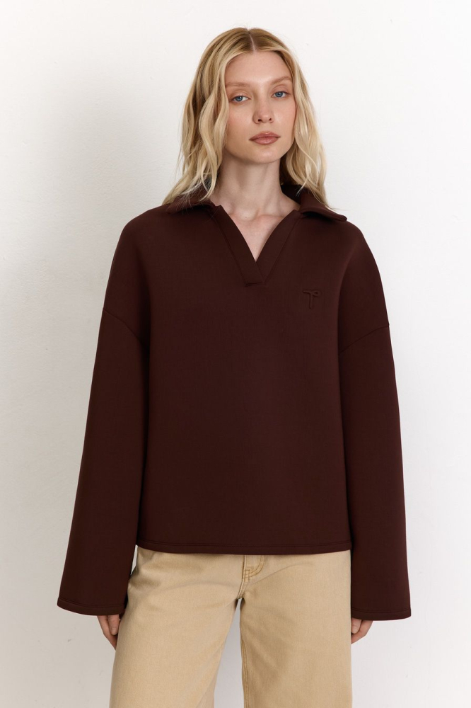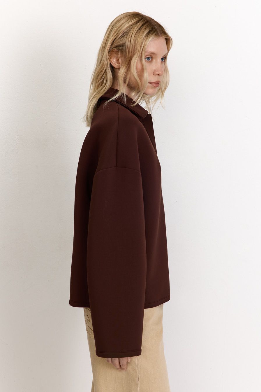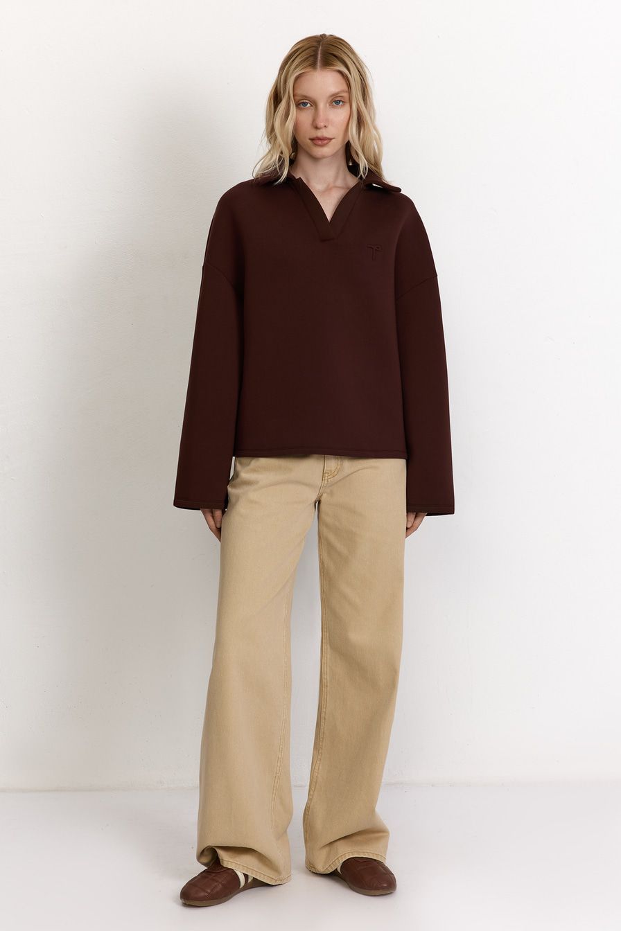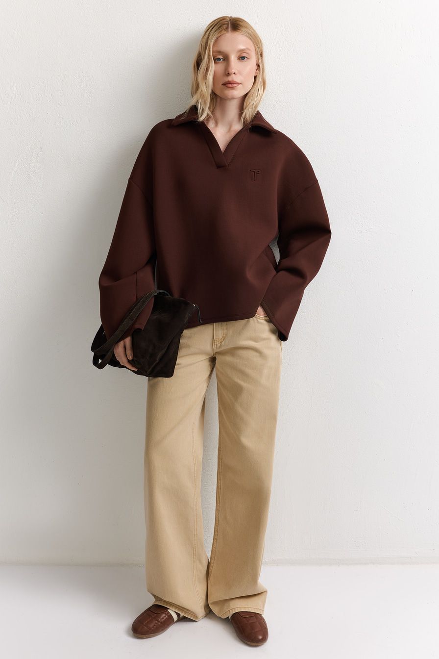 Коричневый лонгслив из смесовой вискозы – модель оверсайз-кроя со спущенной линией плеч. Лонгслив дополнен отложным воротником и вышивкой в виде логотипа бренда.
