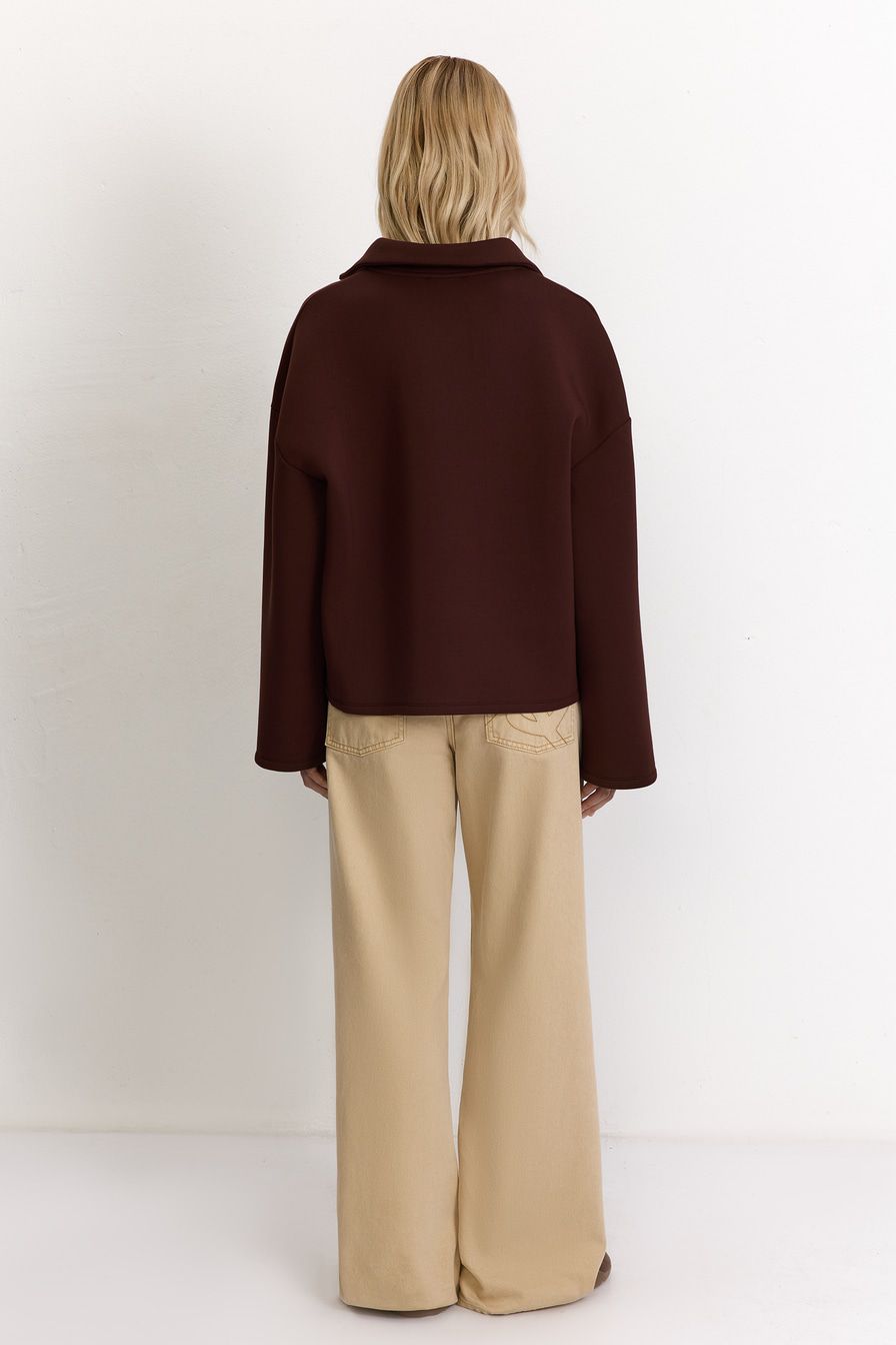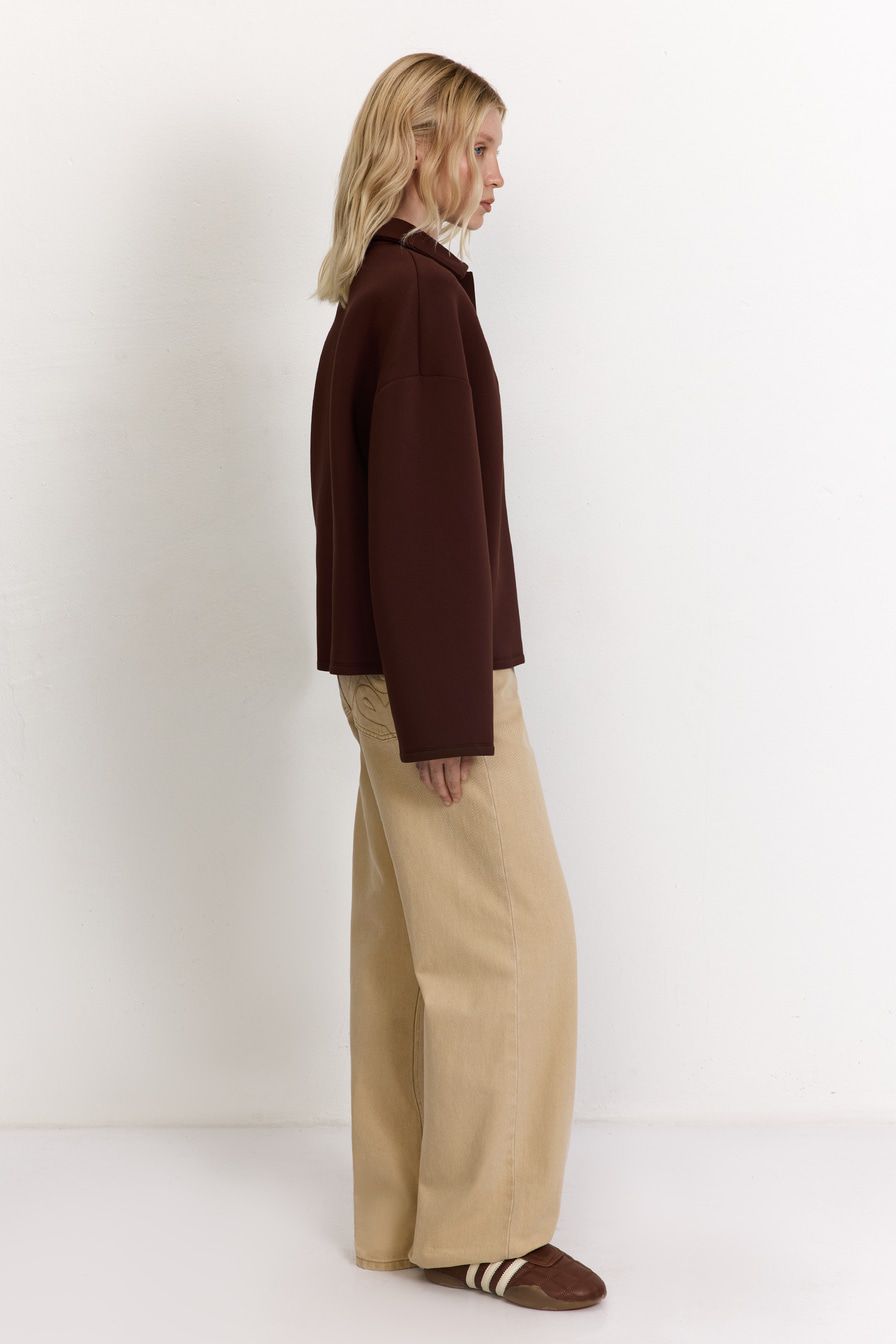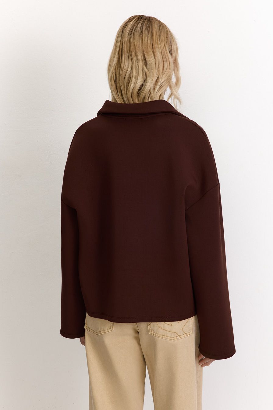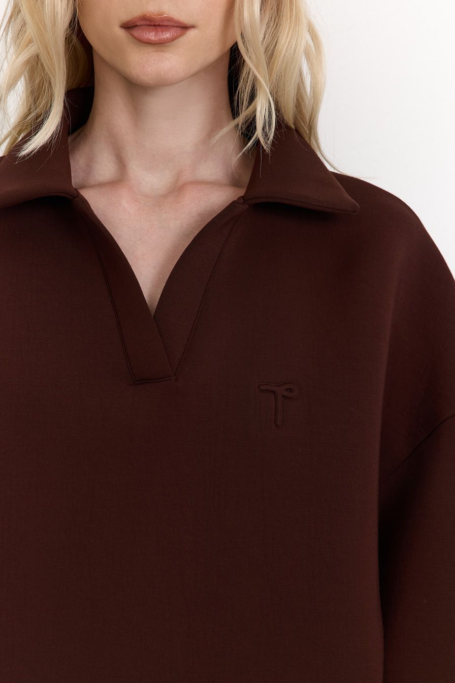 Коричневый лонгслив из смесовой вискозы – модель оверсайз-кроя со спущенной линией плеч. Лонгслив дополнен отложным воротником и вышивкой в виде логотипа бренда.