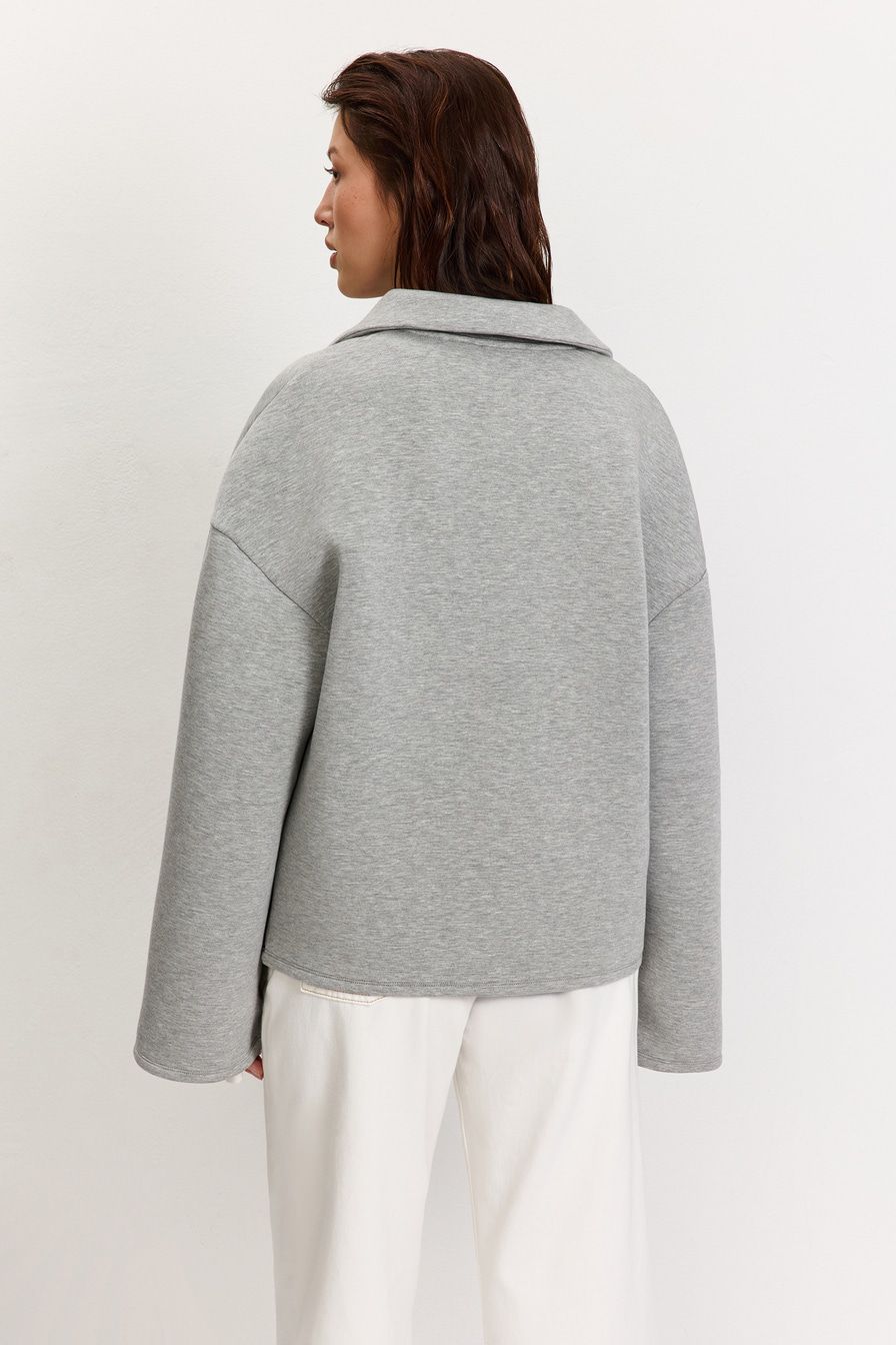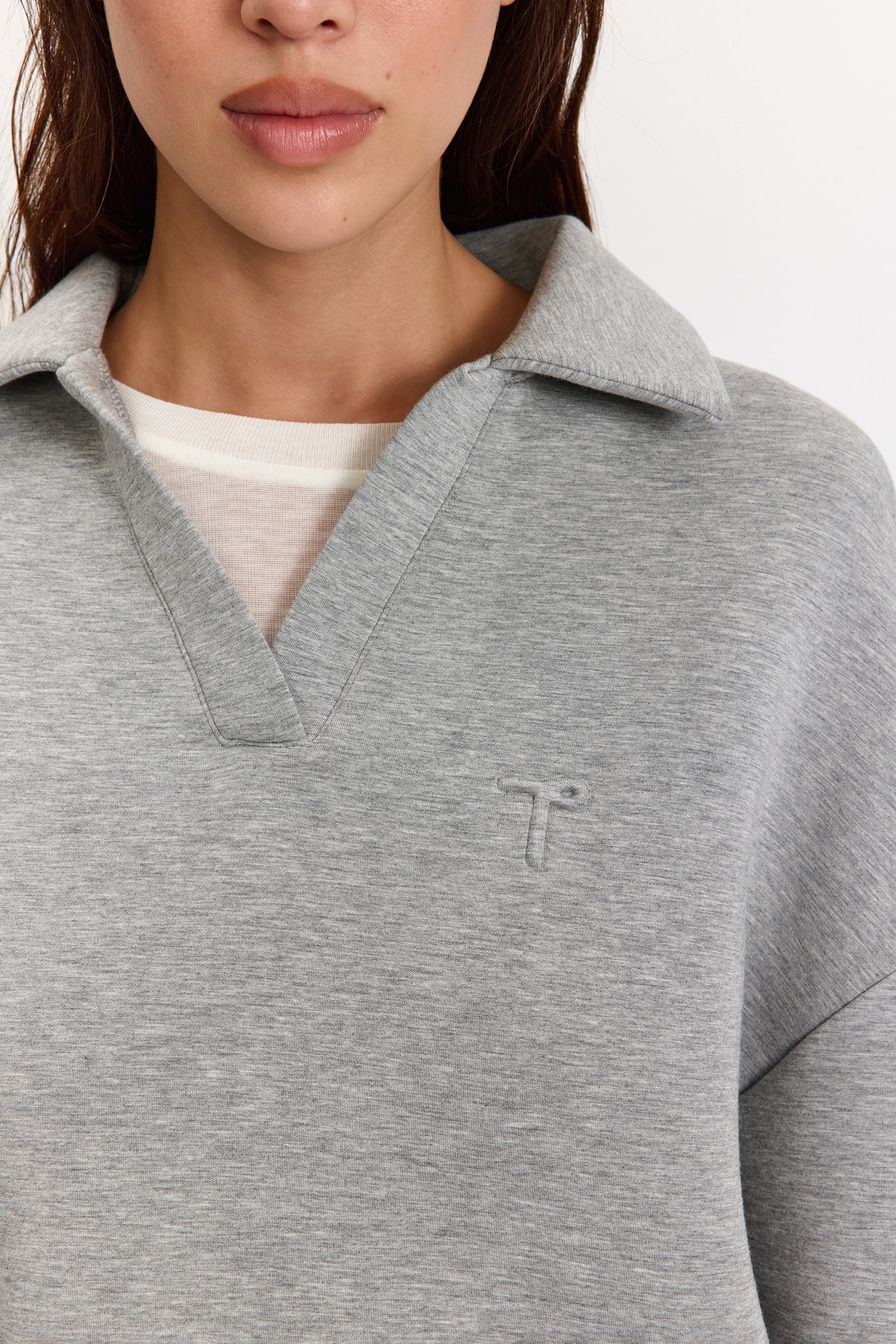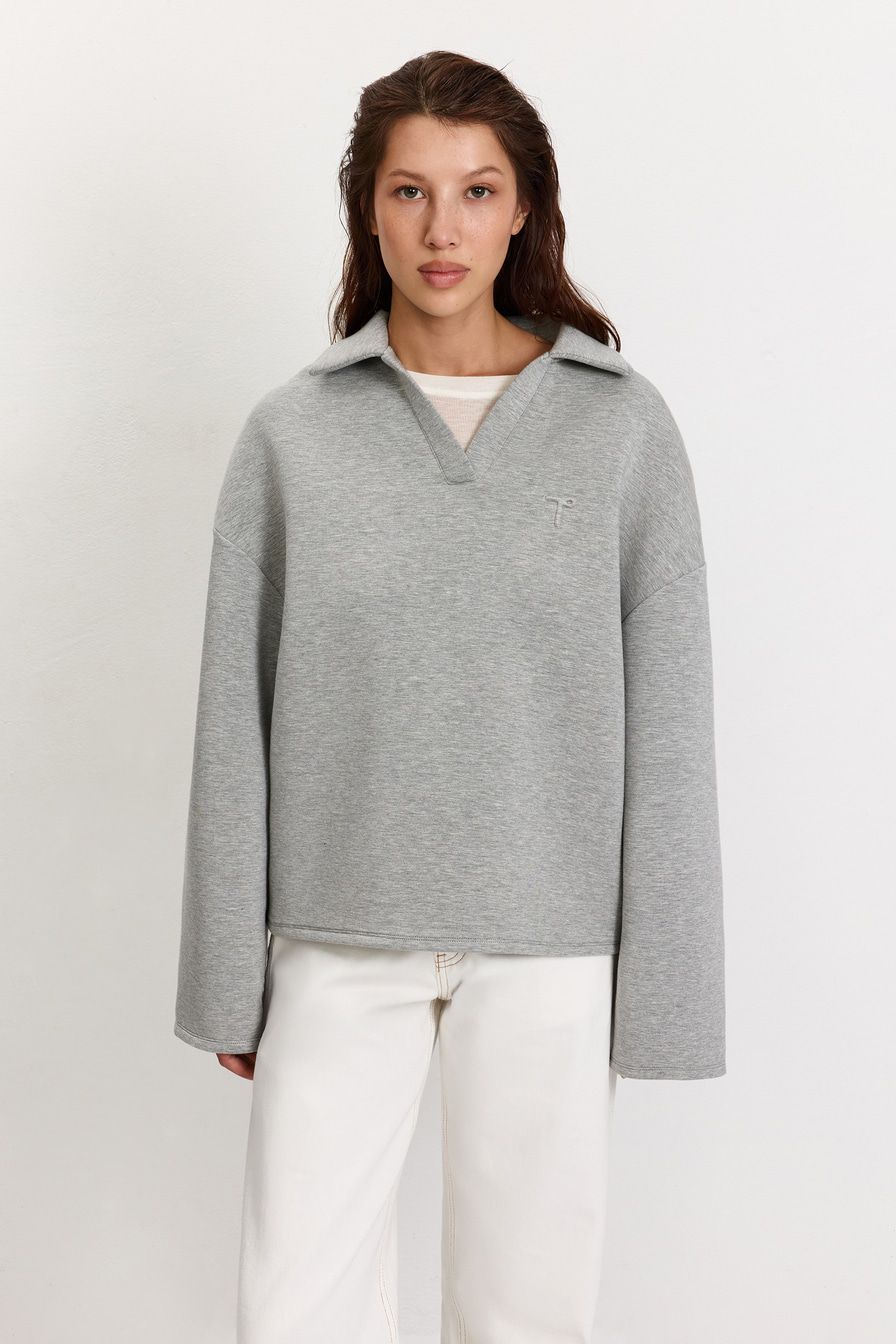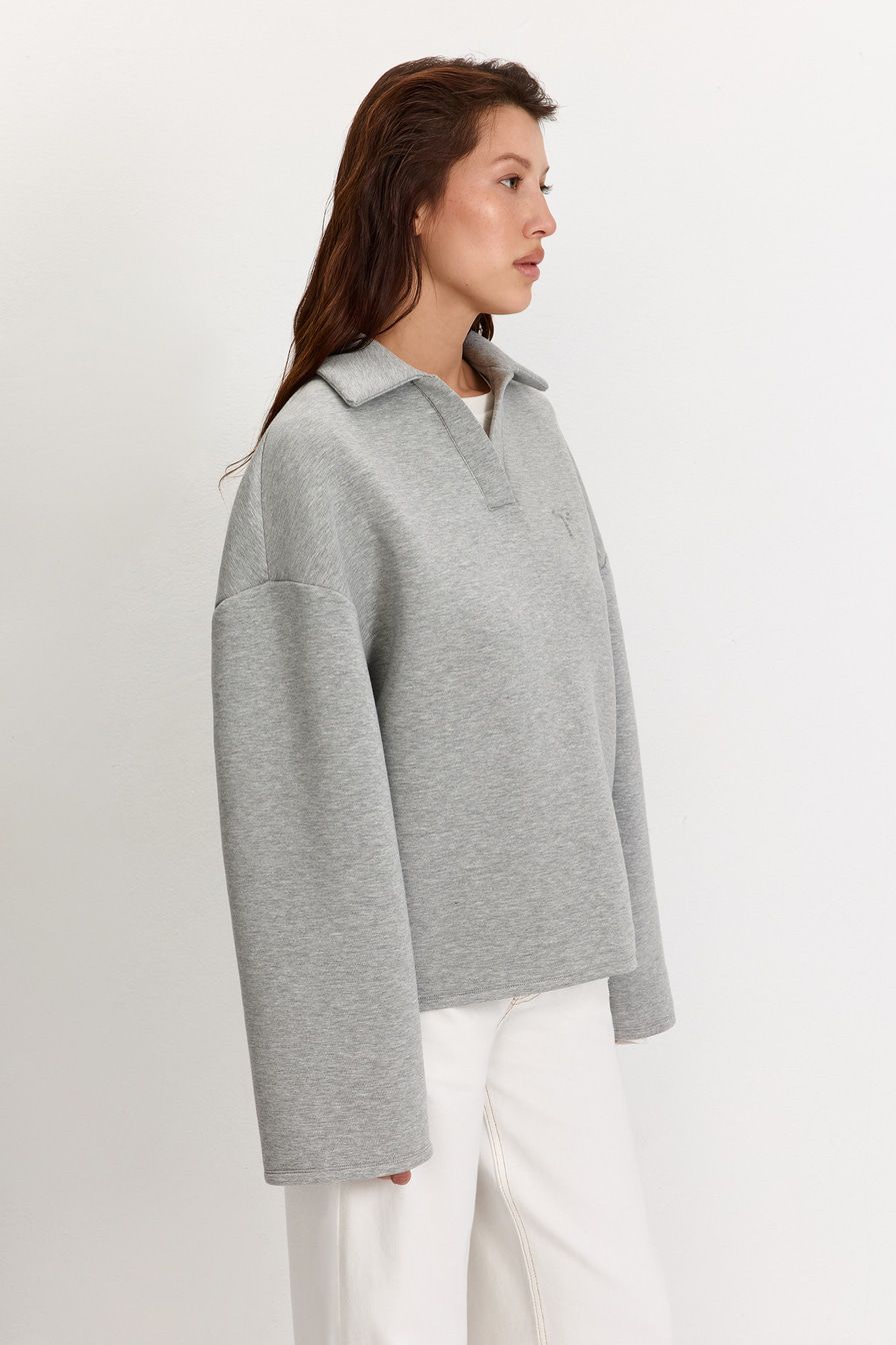 Серый меланжевый лонгслив из смесовой вискозы – модель оверсайз-кроя со спущенной линией плеч. Лонгслив дополнен отложным воротником и вышивкой в виде логотипа бренда.