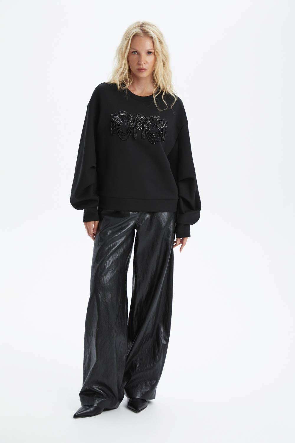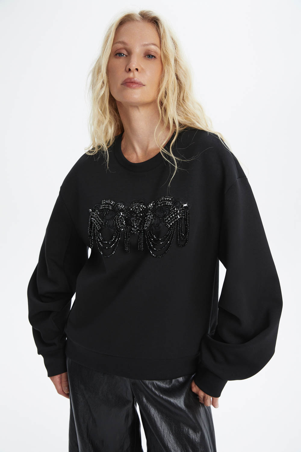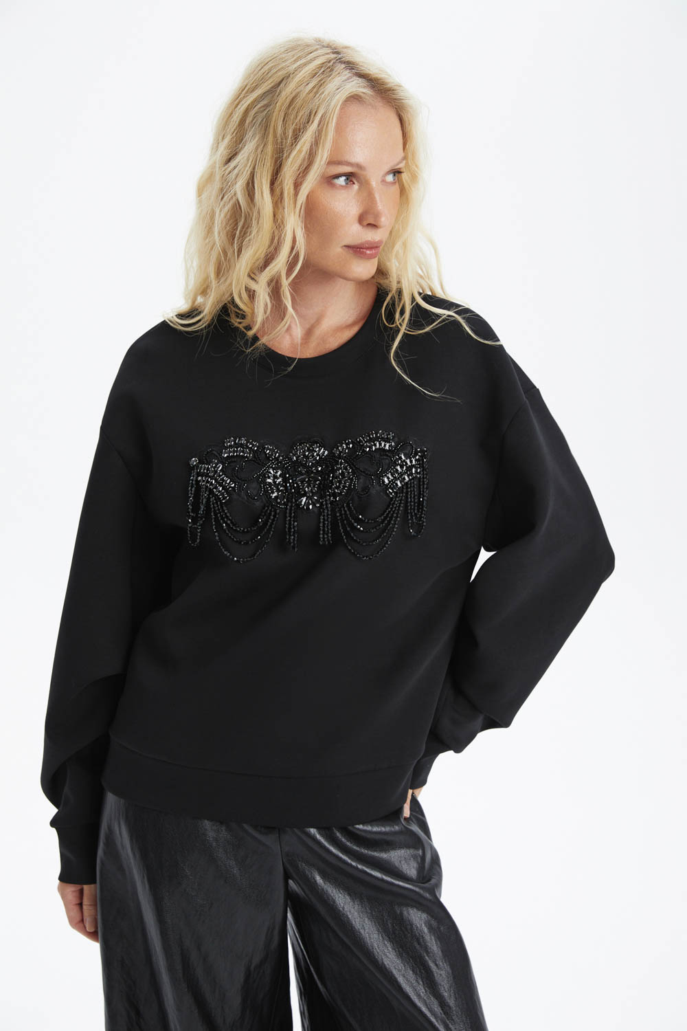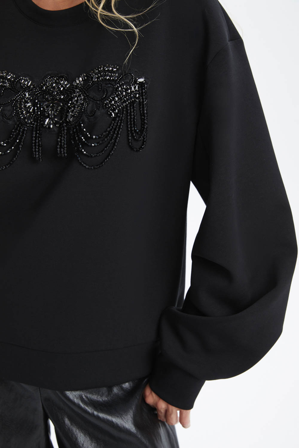 Чёрный свитшот со стразами — стильный и комфортный элемент гардероба. Идеальный выбор для создания модного образа. Стразы добавляют изысканность и блеск, делая этот свитшот ярким акцентом в вашем луке. Отлично подойдёт для повседневной носки и встреч с друзьями.