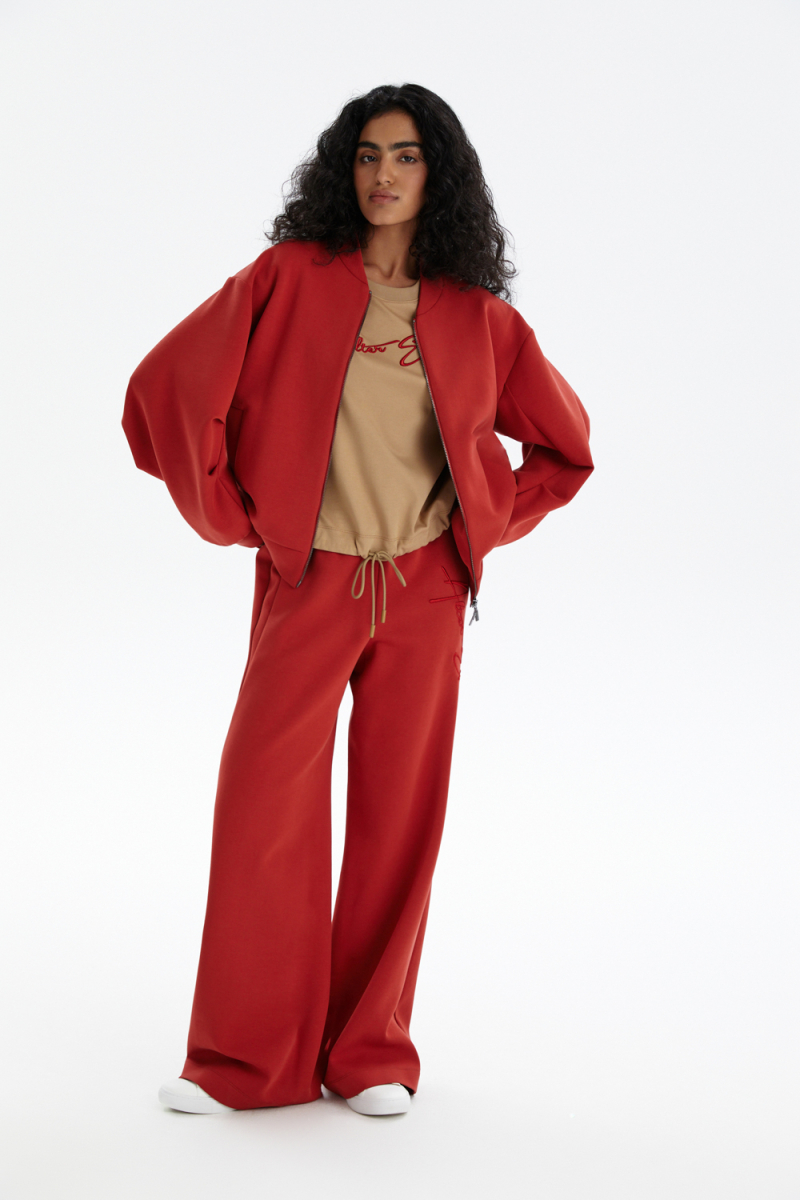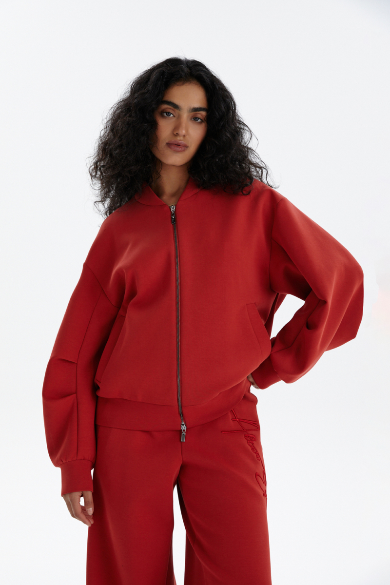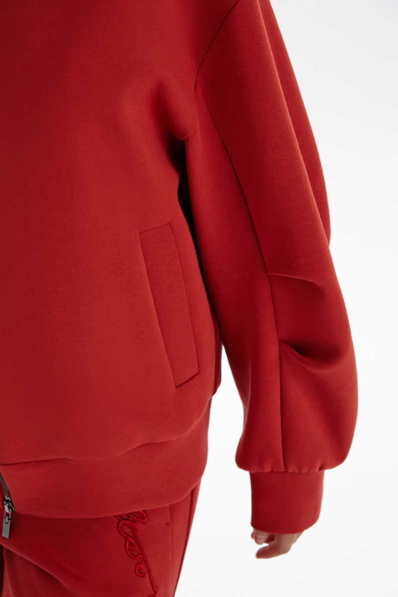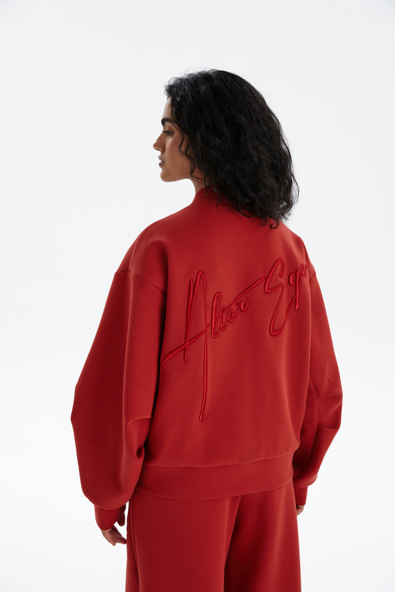 Свитшот из мягкого хлопкового трикотажа в насыщенном красном оттенке — смелый акцент в вашем гардеробе. Свободный крой с объёмными рукавами дарит ощущение комфорта и лёгкости, а удлинённая линия плеча создаёт расслабленный силуэт. Деталь, задающая настроение модели, — фактурная объёмная вышивка «Alter Ego» на спинке, которая подчёркивает уникальность и современный характер изделия. Застёжка на молнию добавляет удобства, а аккуратные прорезные карманы делают вещь ещё более практичной. Такой свитшот станет отличным выбором как для динамичных повседневных образов, так и для стильных уикенд-комбинаций. Идеально сочетается с джоггерами или прямыми брюками в тон, а также гармонично смотрится с джинсами и кроссовками, формируя множество актуальных сетов.