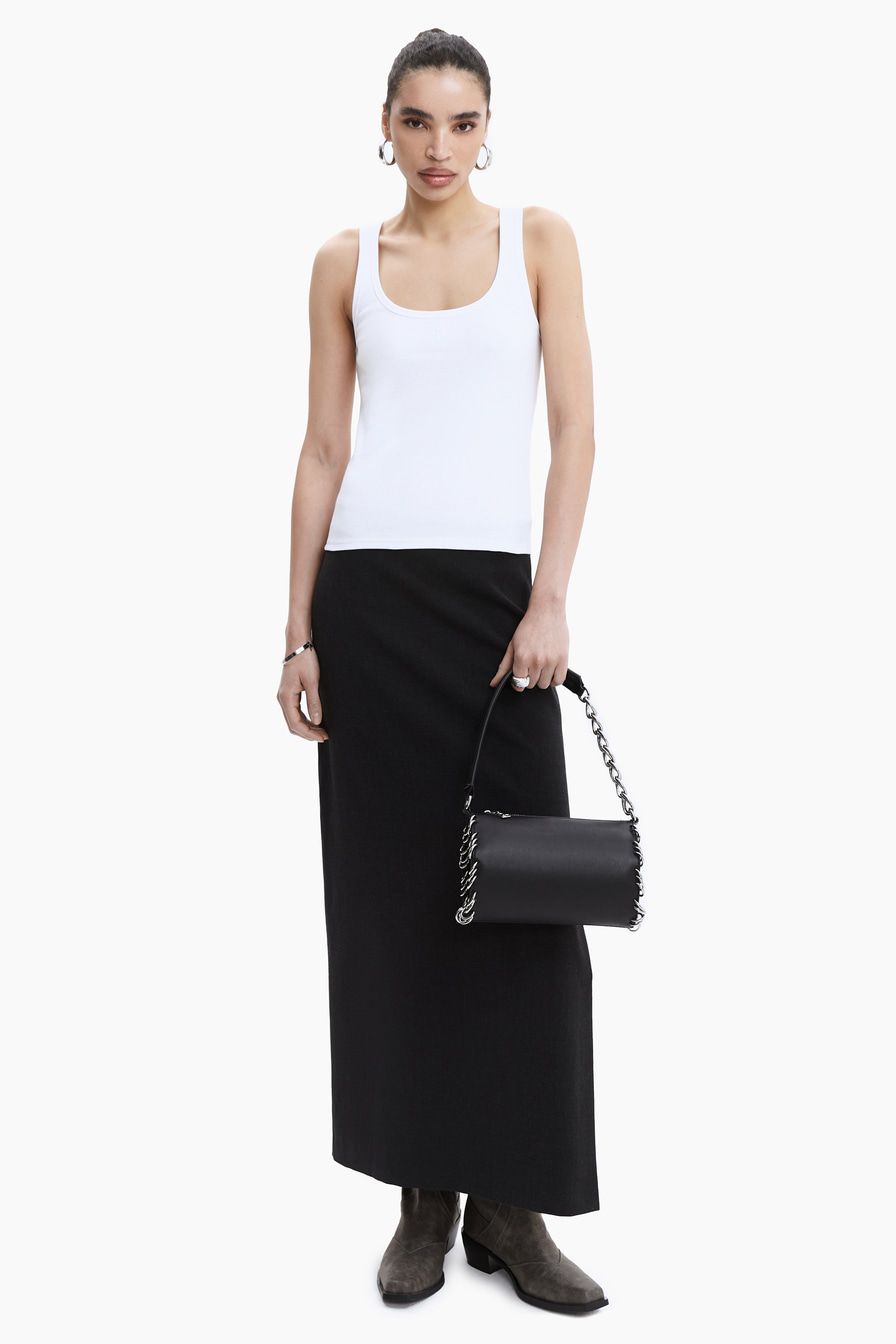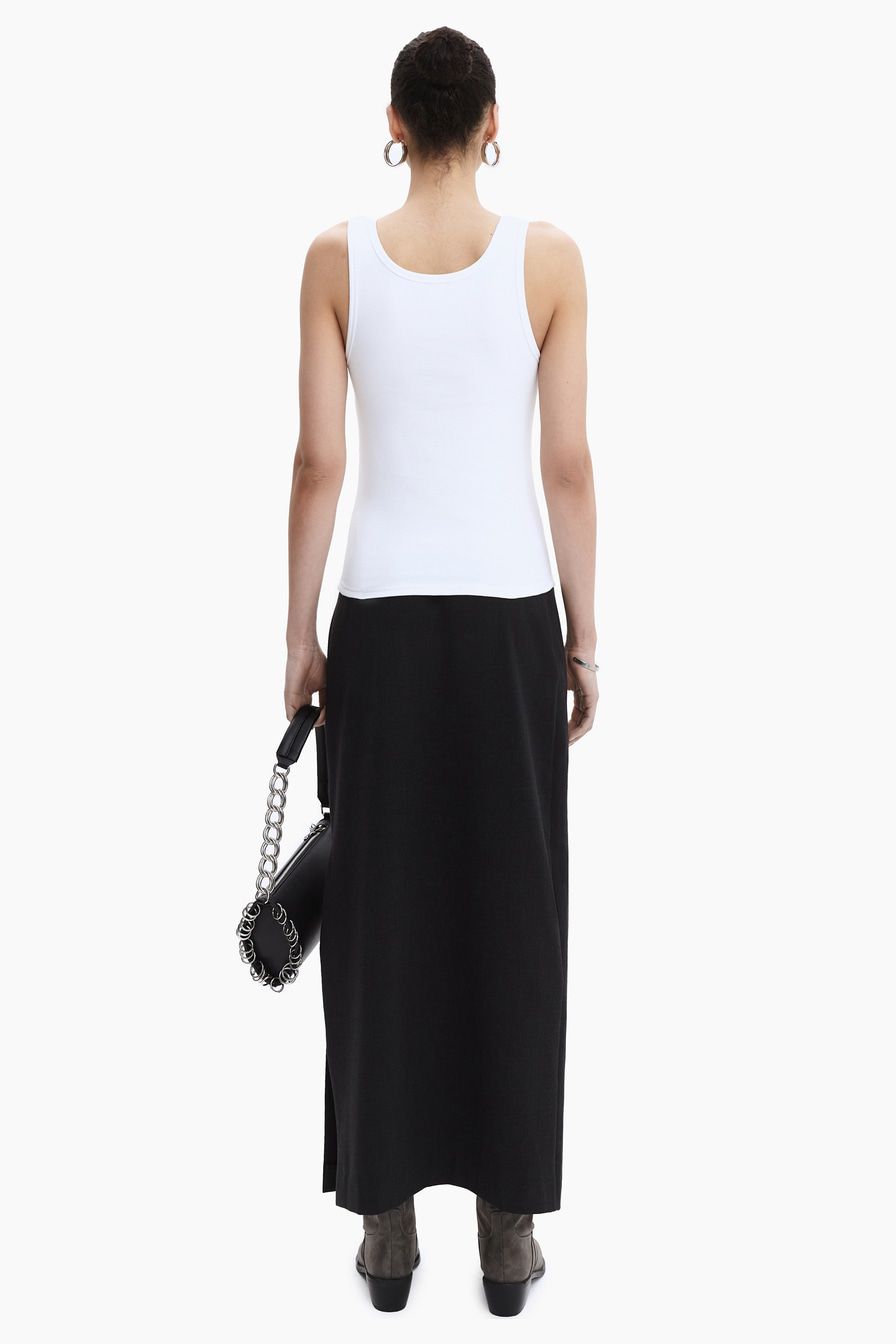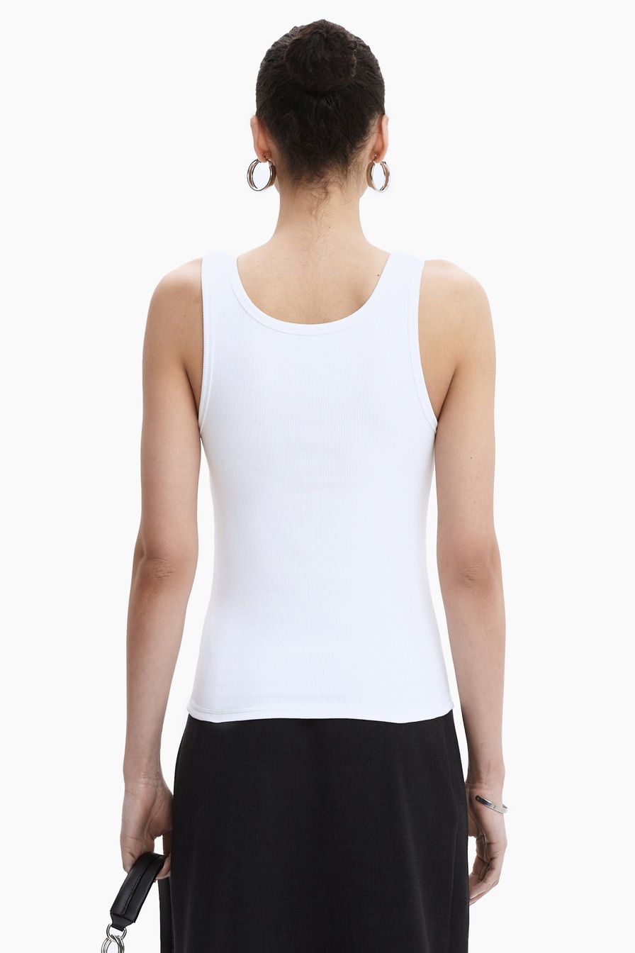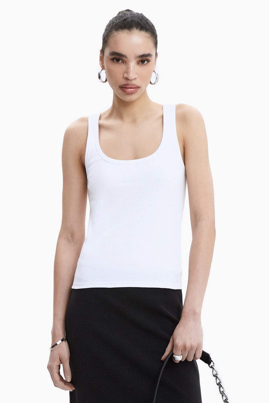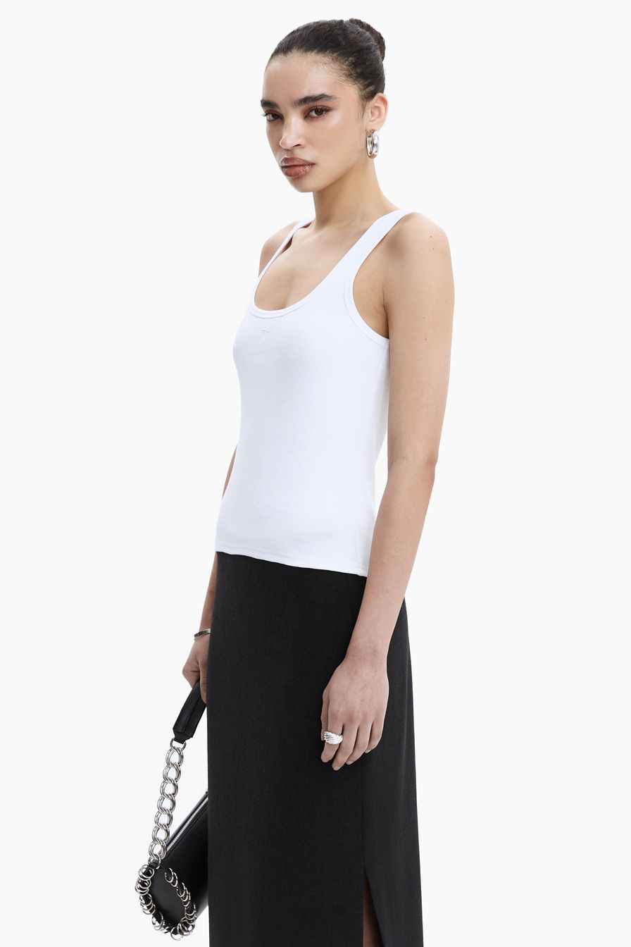 Базовая белая майка из смесового хлопка – модель с тонкими бретелями и U-образным вырезом. Майка декорирована небольшой вышивкой в виде логотипа бренда на груди.