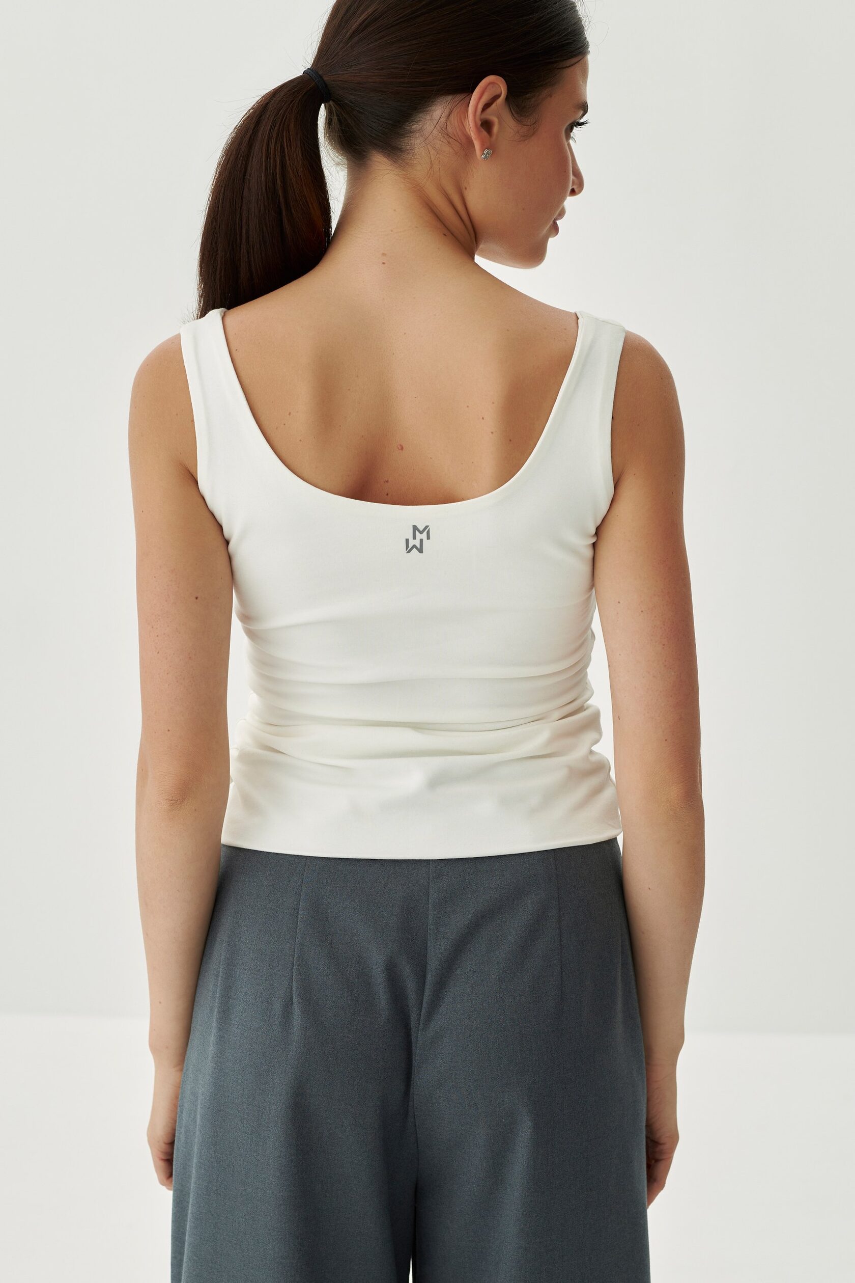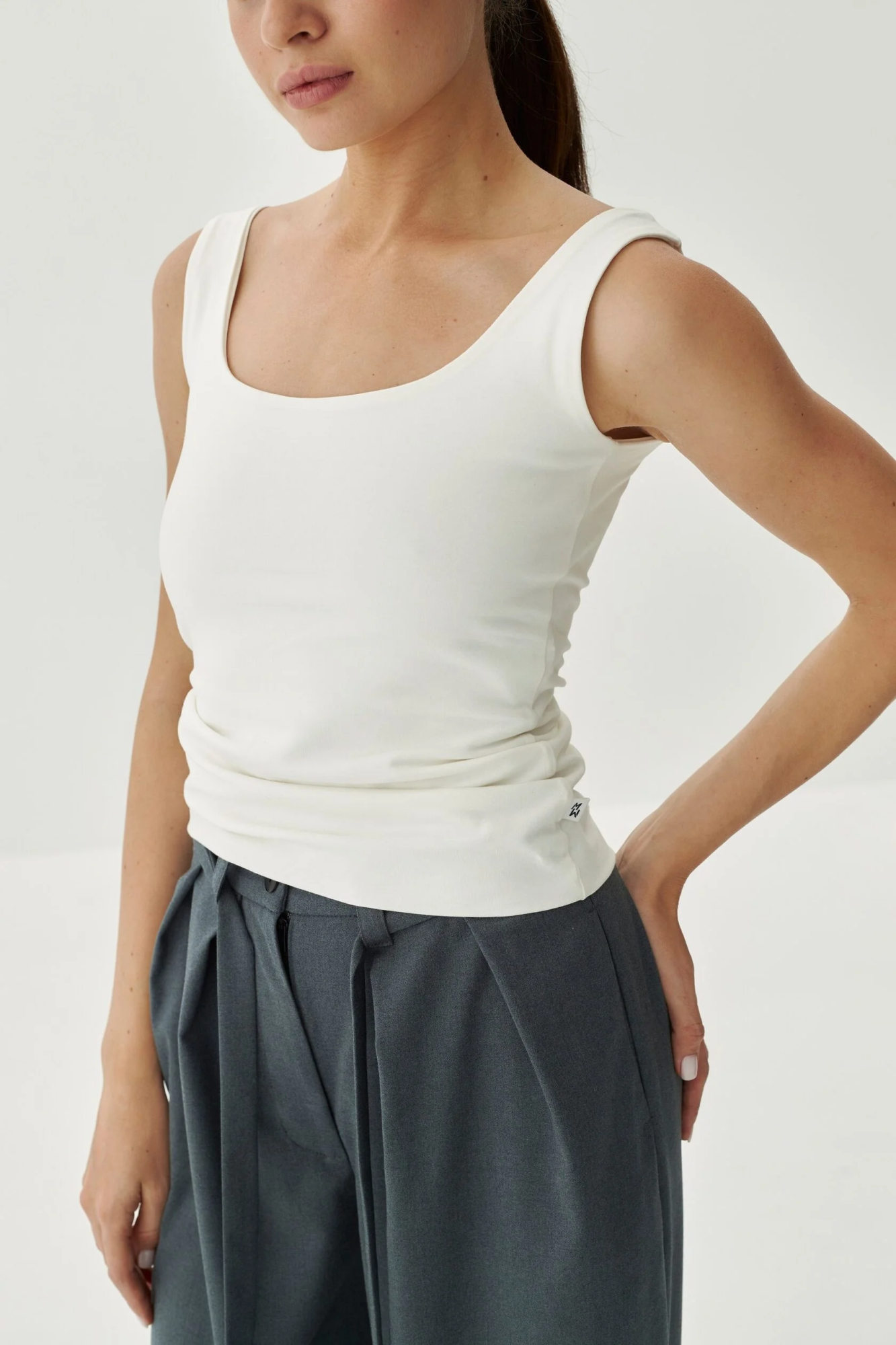 Базовая майка с широкими бретелями и круглым глубоким вырезом. Приталенный силуэт подчеркивает фигуру, а легкий, но плотный и эластичный материал дает ощущение комфорта и удобства.