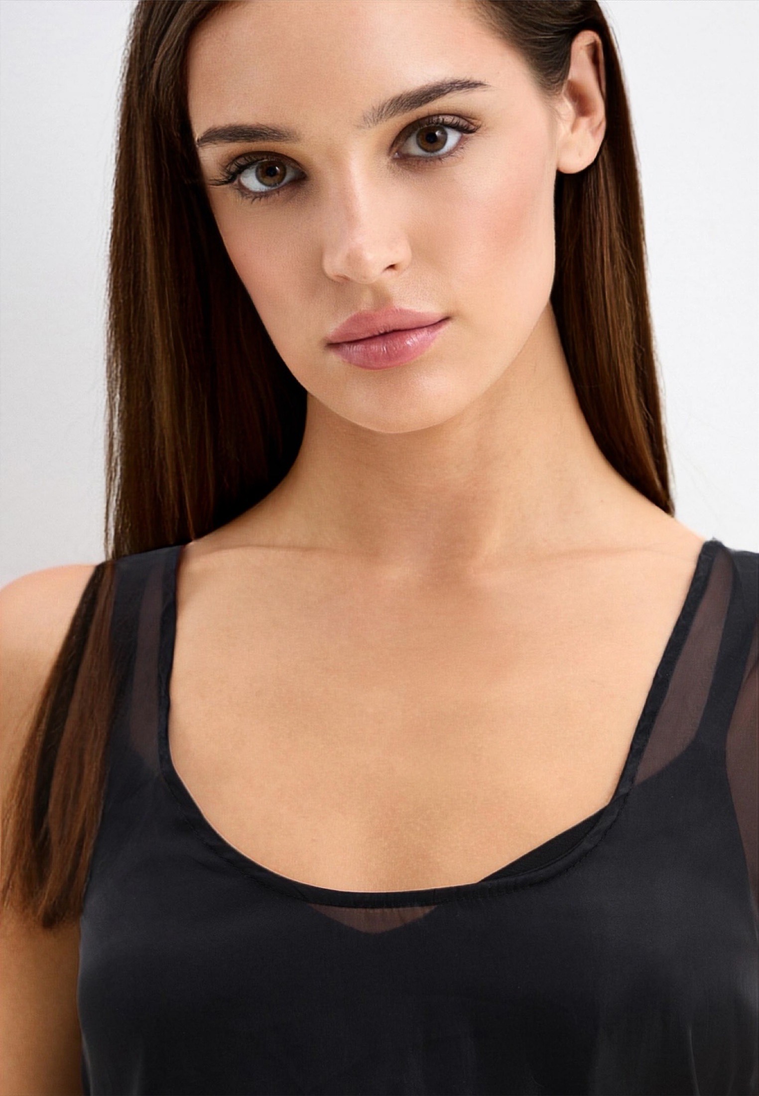 Чёрный топ с полупрозрачной текстурой и воздушным воланом превращает базовый силуэт в арт-образ. Чистая линия выреза, мягкая игра ткани и динамика формы — для смелых и выразительных сочетаний.
