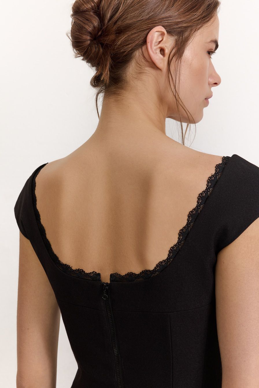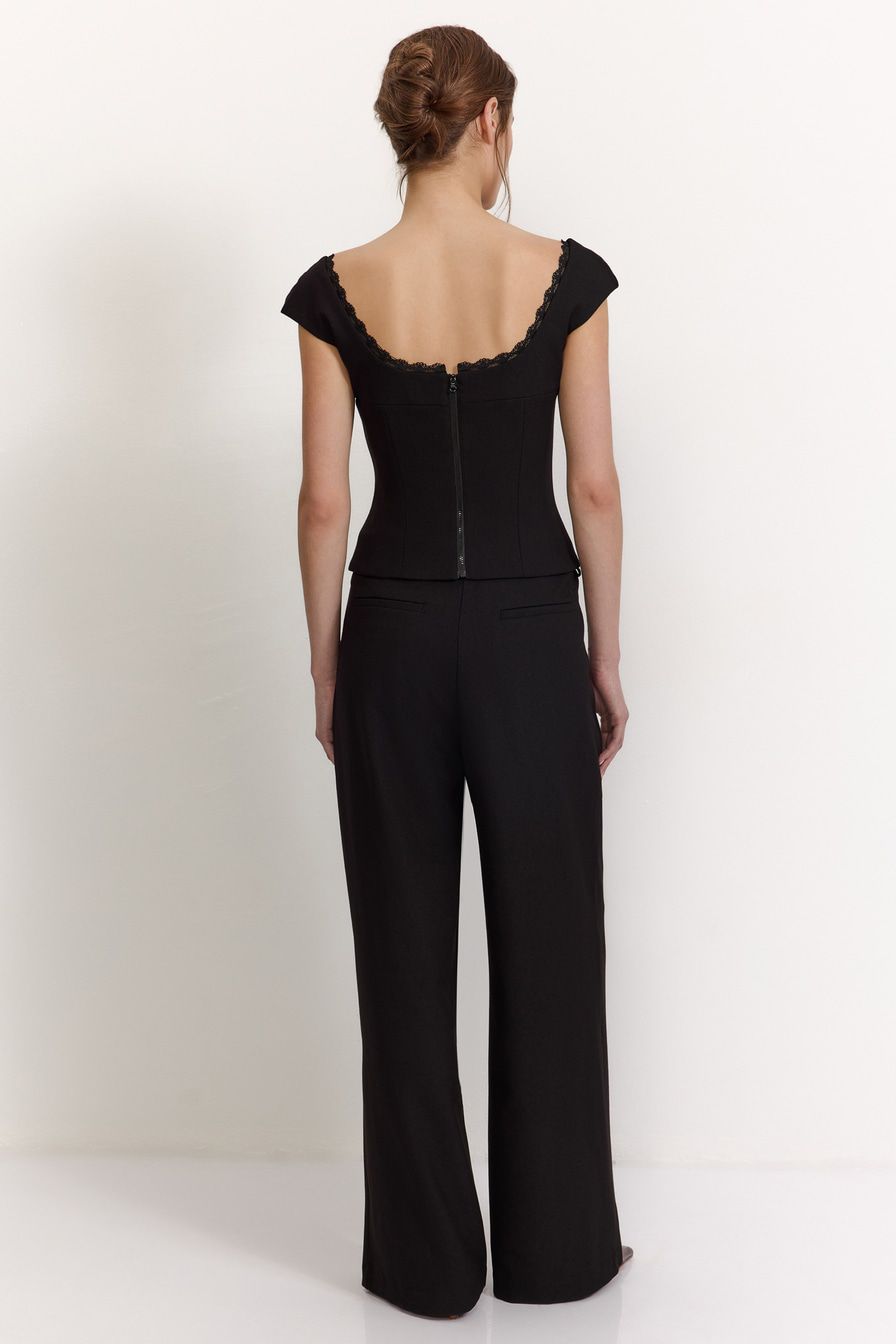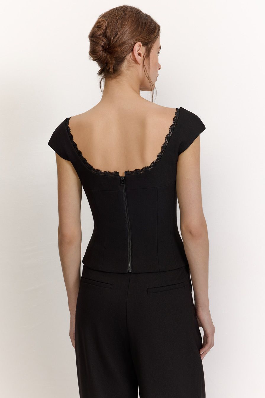Черный топ с высокой линией лифа выполнен из смесовой ткани с добавлением вискозы, дополнен застежкой-молнией на спине и декорирован кружевной отделкой.