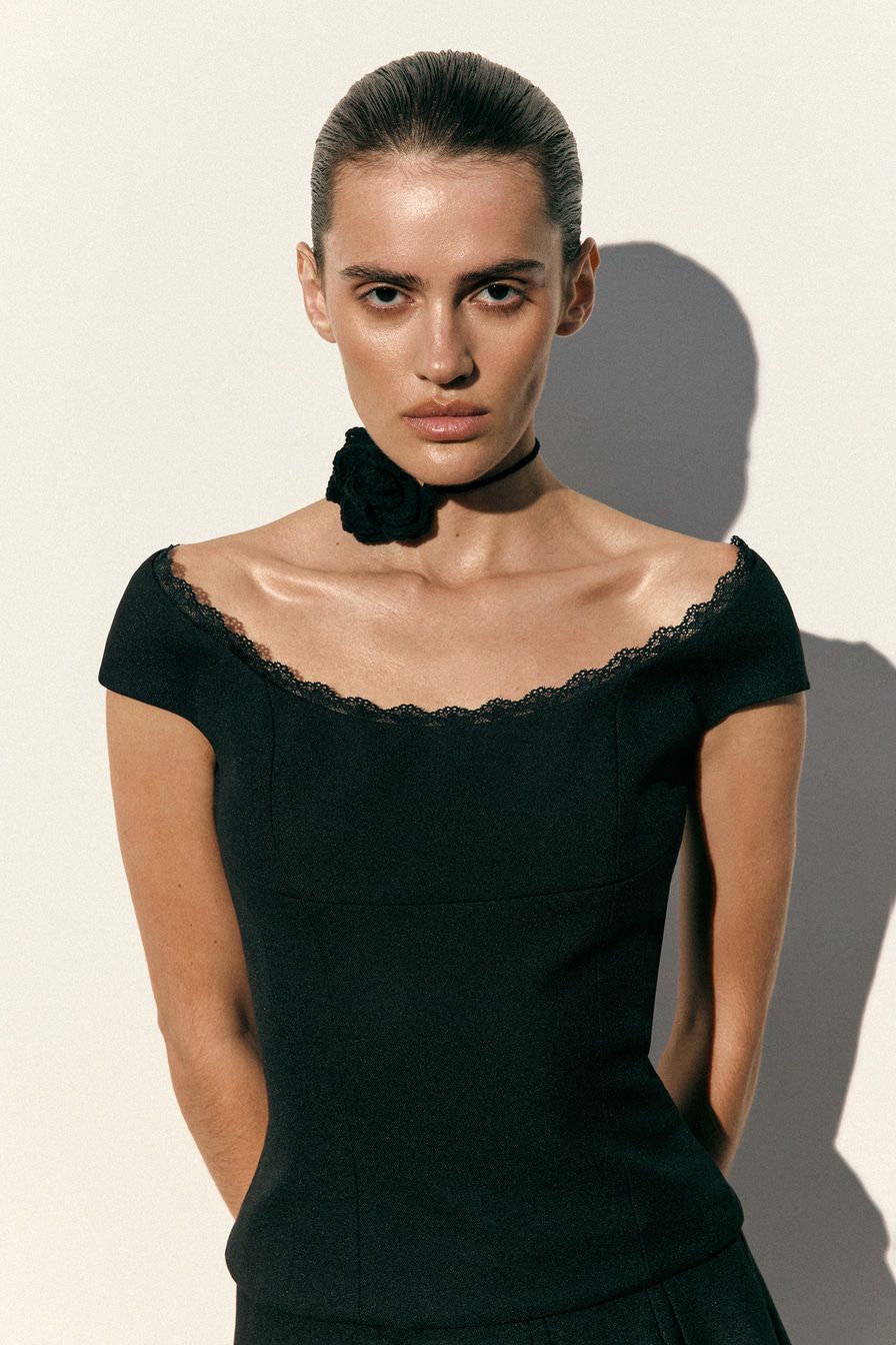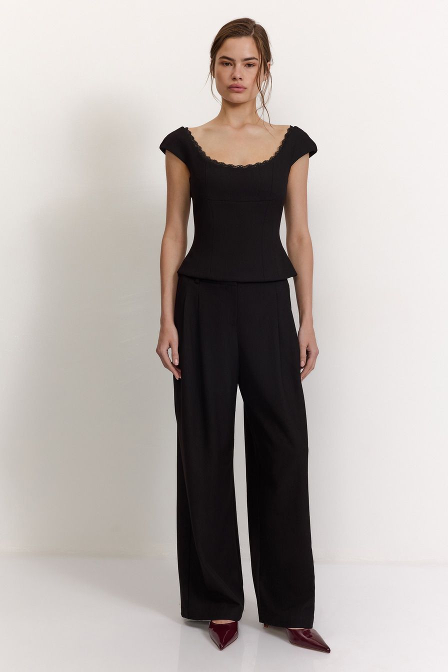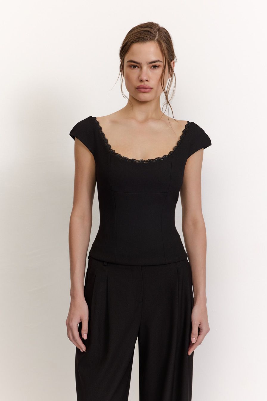 Черный топ с высокой линией лифа выполнен из смесовой ткани с добавлением вискозы, дополнен застежкой-молнией на спине и декорирован кружевной отделкой.