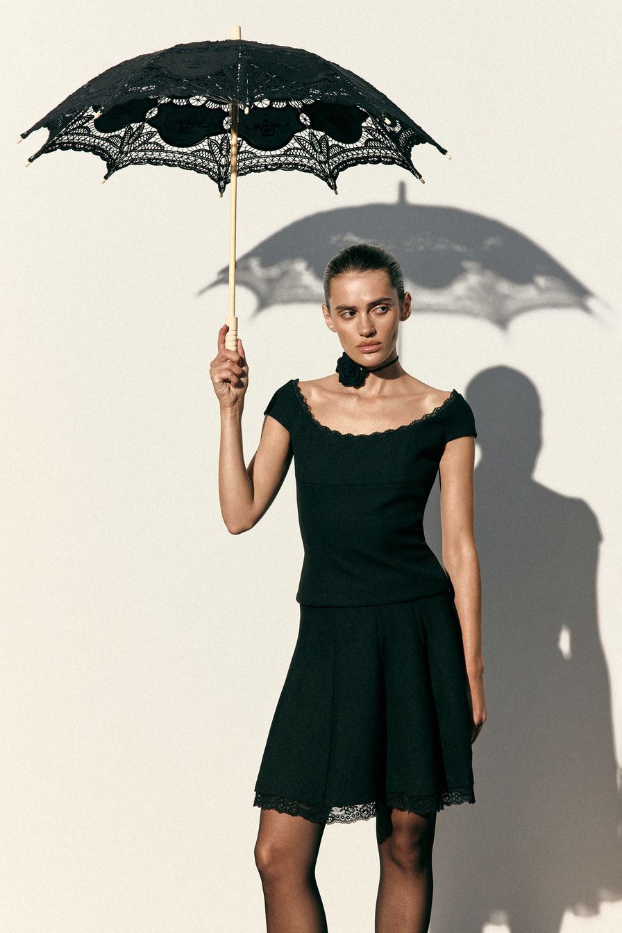 «Для бранча с подругами сочетайте топ с черной юбкой-мини из комплекта, босоножками с тонкими ремешками и небольшой сумкой-багетом».