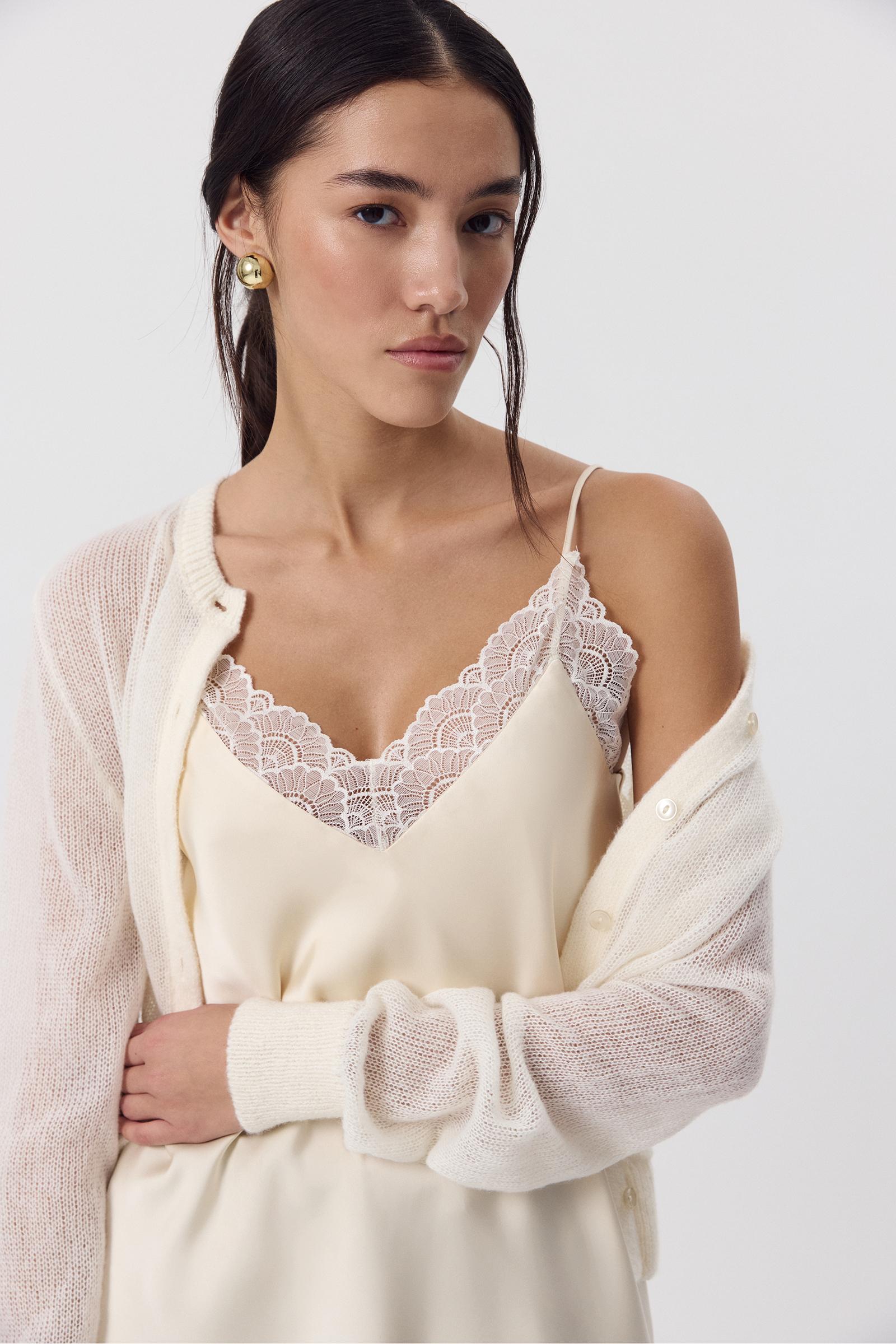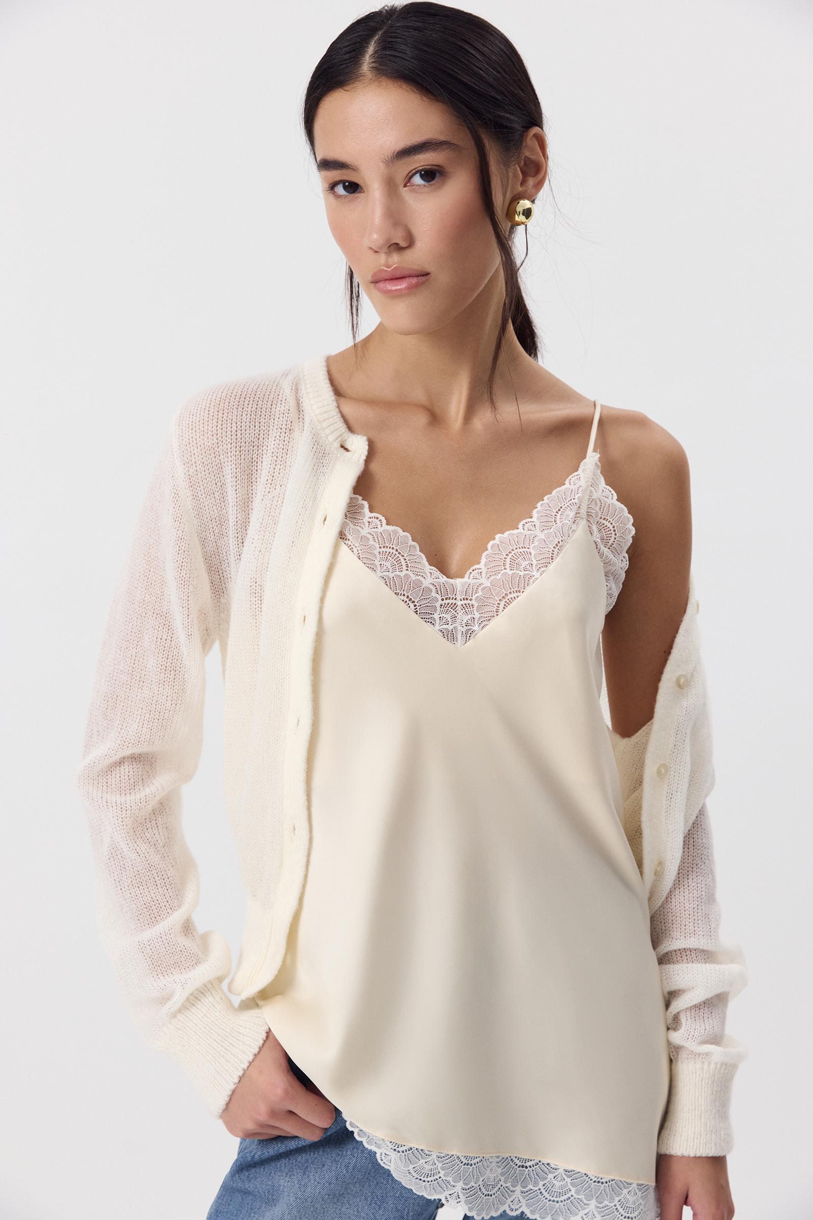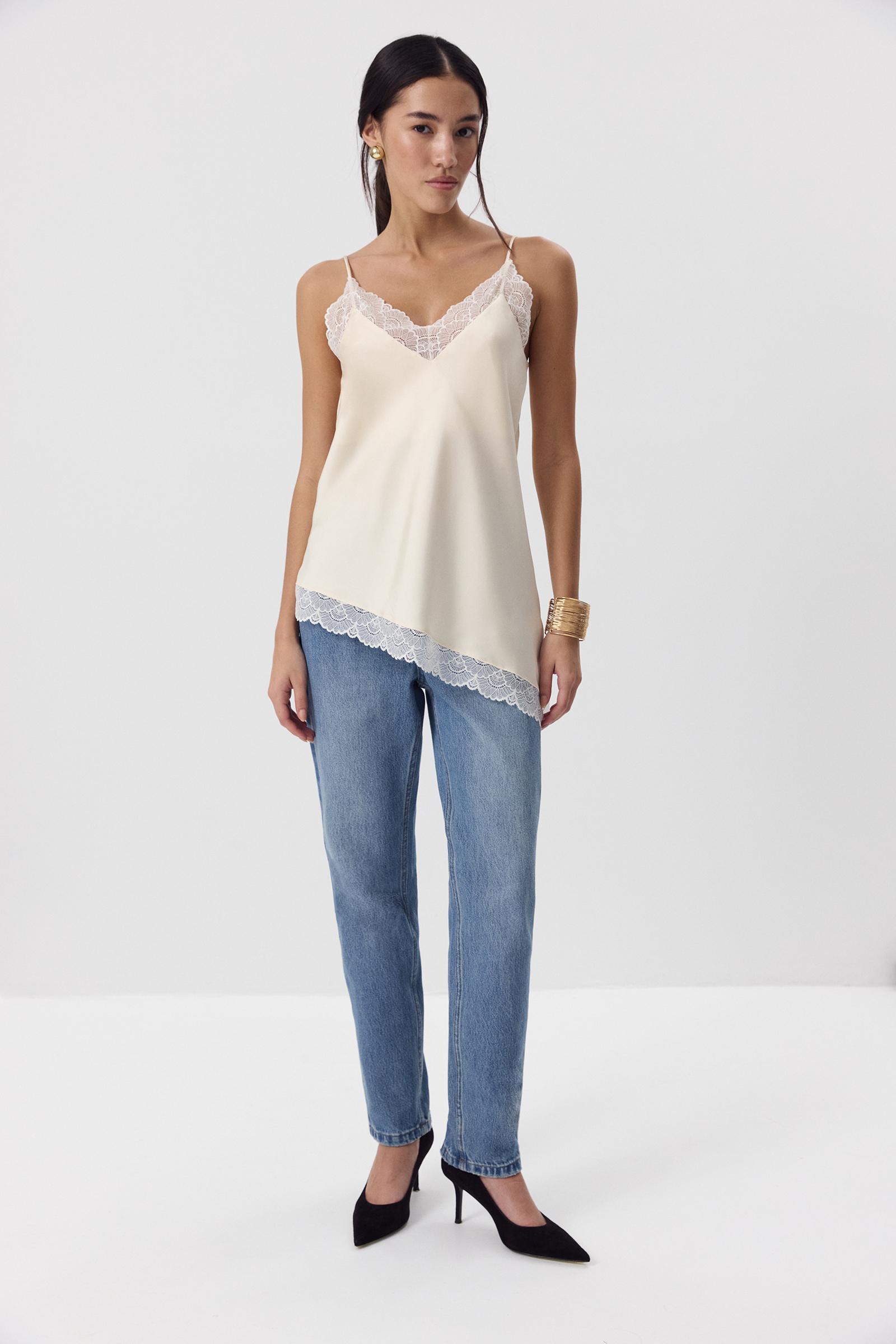 Свободный топ из сатина на тонких бретелях. Топ с ассиметричным низом и V- образной горловиной. По низу изделия и вырезу декоративная кружевная отделка.