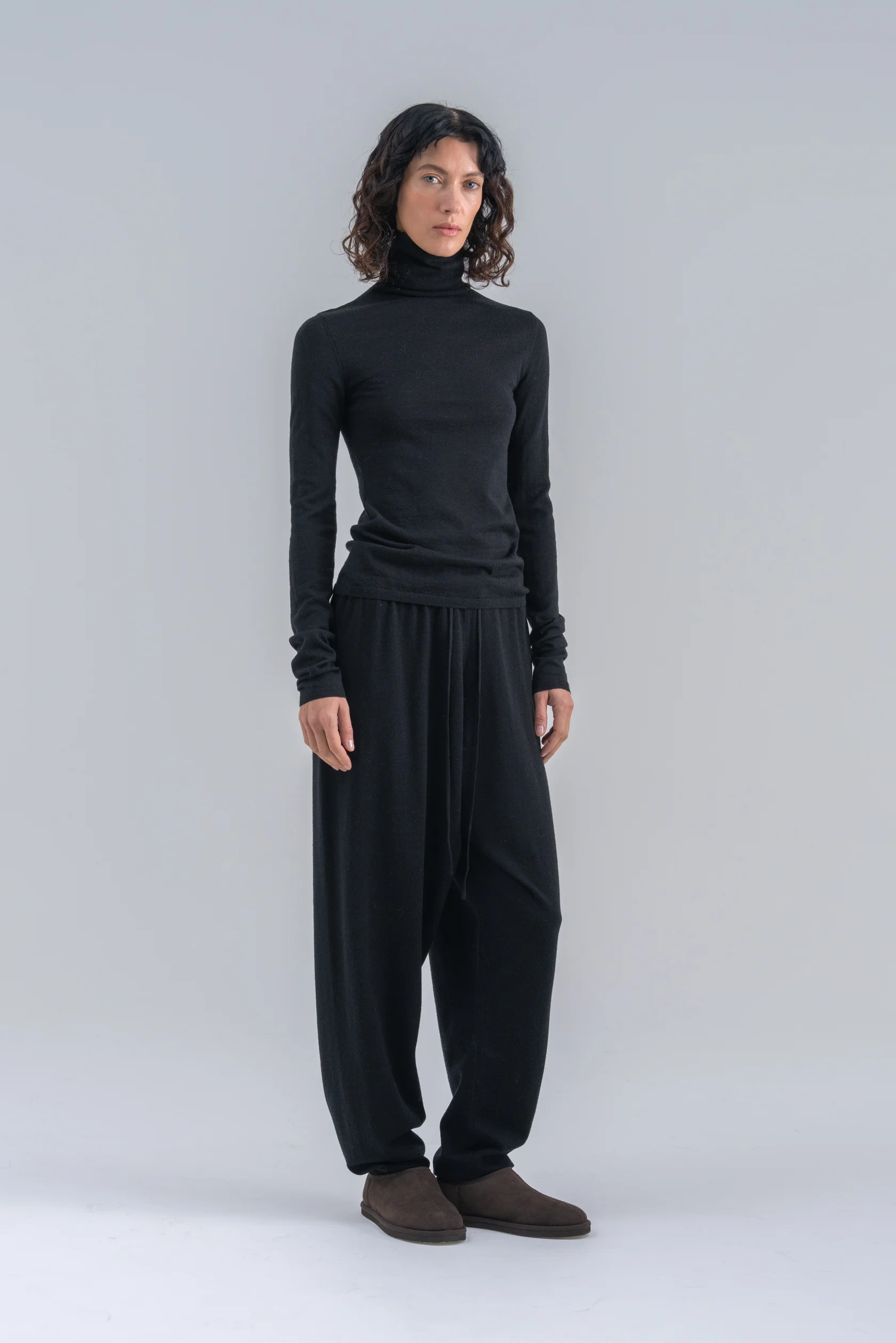 Знакомый и любимый силуэт брюк Mankova теперь из шерсти мериноса. Пояс по классике регулируется шнурком. Низ брючин имеет лёгкую манжету. Основное преимущество — заниженный шаговый шов, который обеспечивает свободную и непринуждённую посадку на бёдрах.