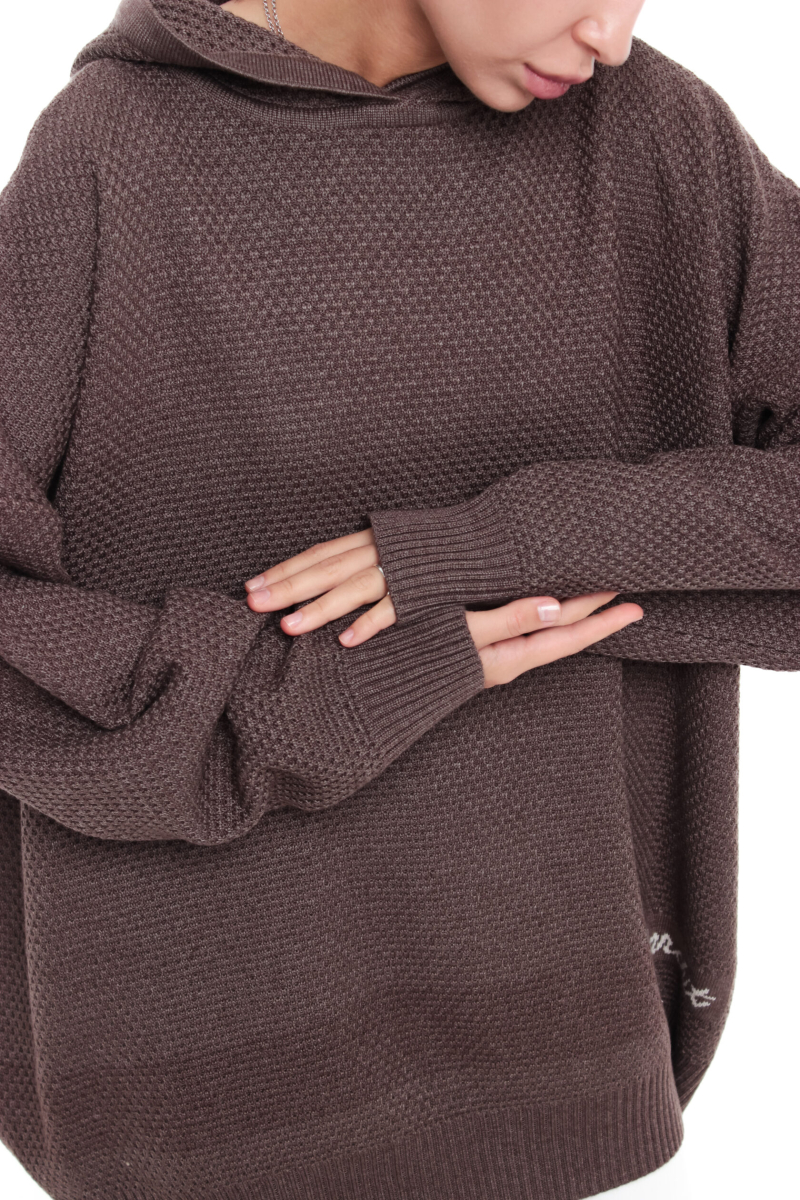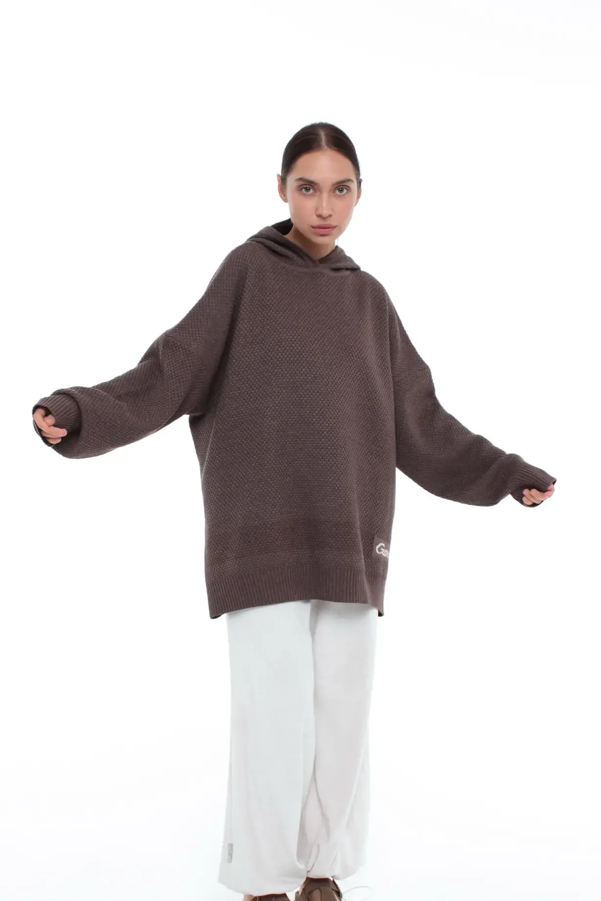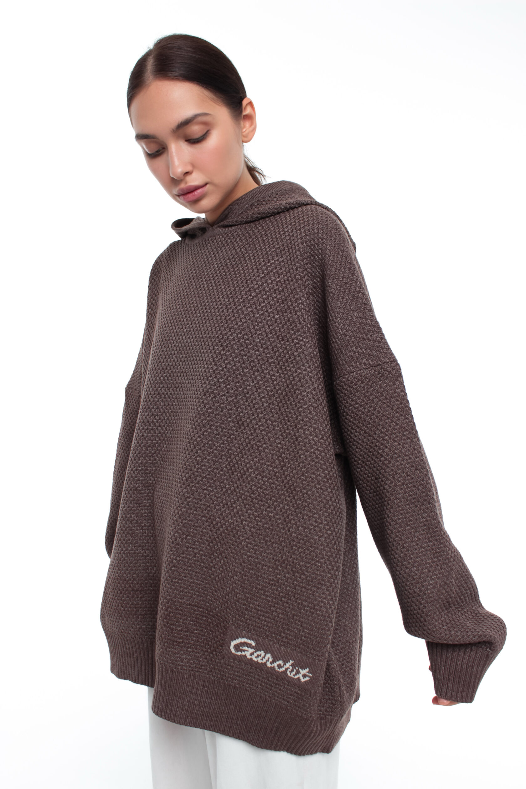 Объёмное вязаное худи Garchit с фактурной «вафельной» вязкой и мягким капюшоном. Свободный oversize-крой со спущенной линией плеча и удлинёнными рукавами, эластичные манжеты и низ. Приятная к телу пряжа, фирменный логотип пряжей у низа. Универсально для повседневных образов — сочетается с джинсами, широкими брюками как Velour и леггинсами.