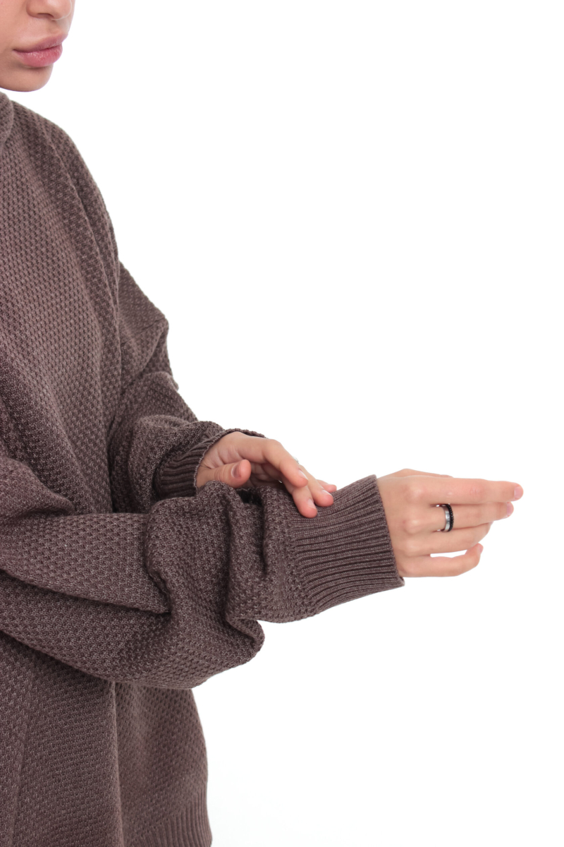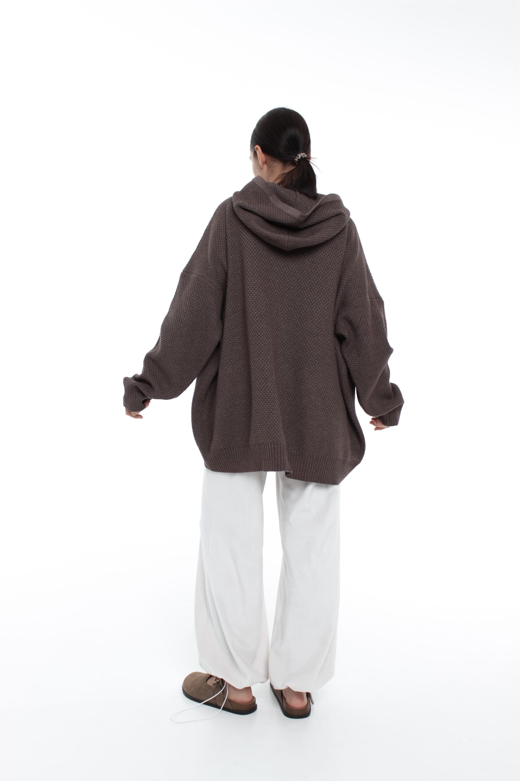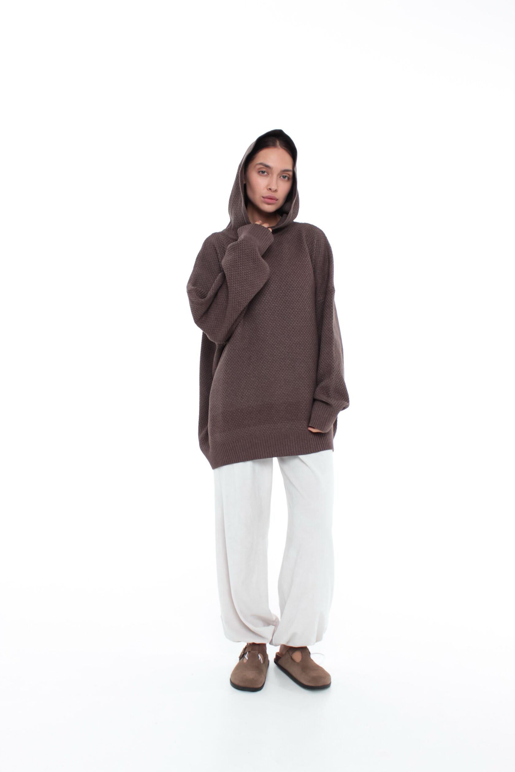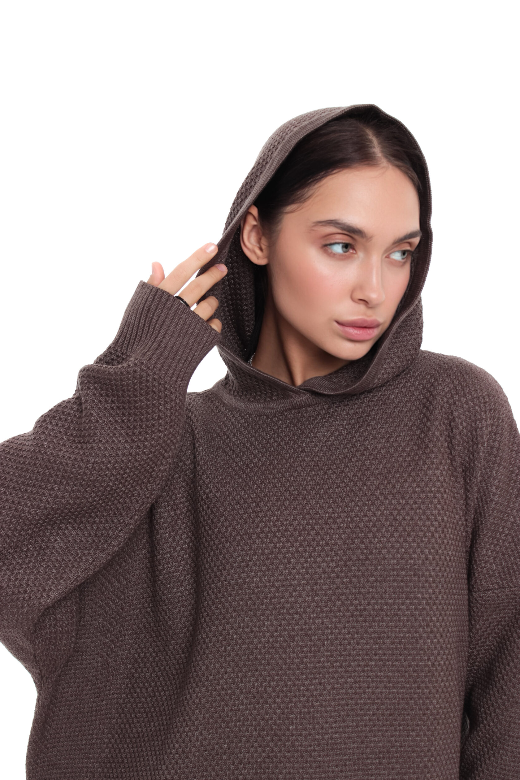 Объёмное вязаное худи Garchit с фактурной «вафельной» вязкой и мягким капюшоном. Свободный oversize-крой со спущенной линией плеча и удлинёнными рукавами, эластичные манжеты и низ. Приятная к телу пряжа, фирменный логотип пряжей у низа. Универсально для повседневных образов — сочетается с джинсами, широкими брюками как Velour и леггинсами.