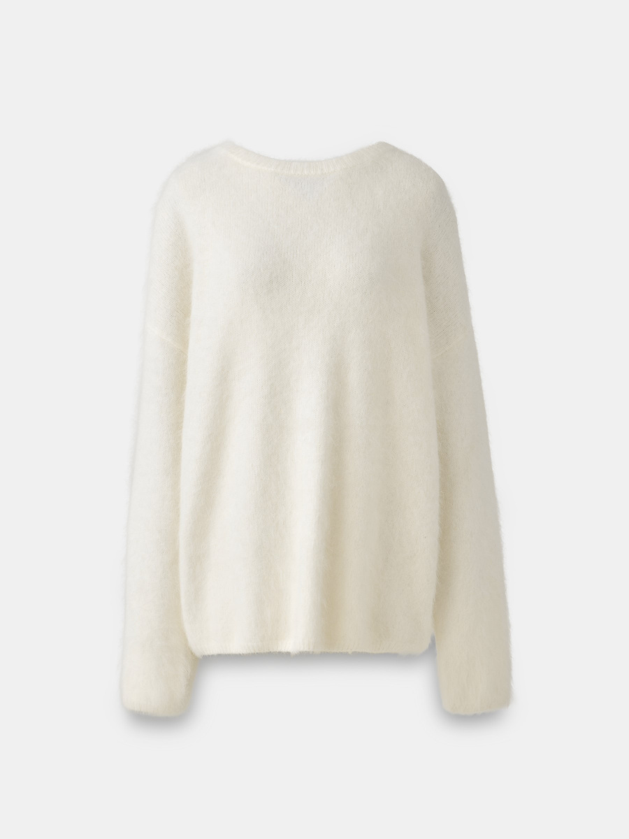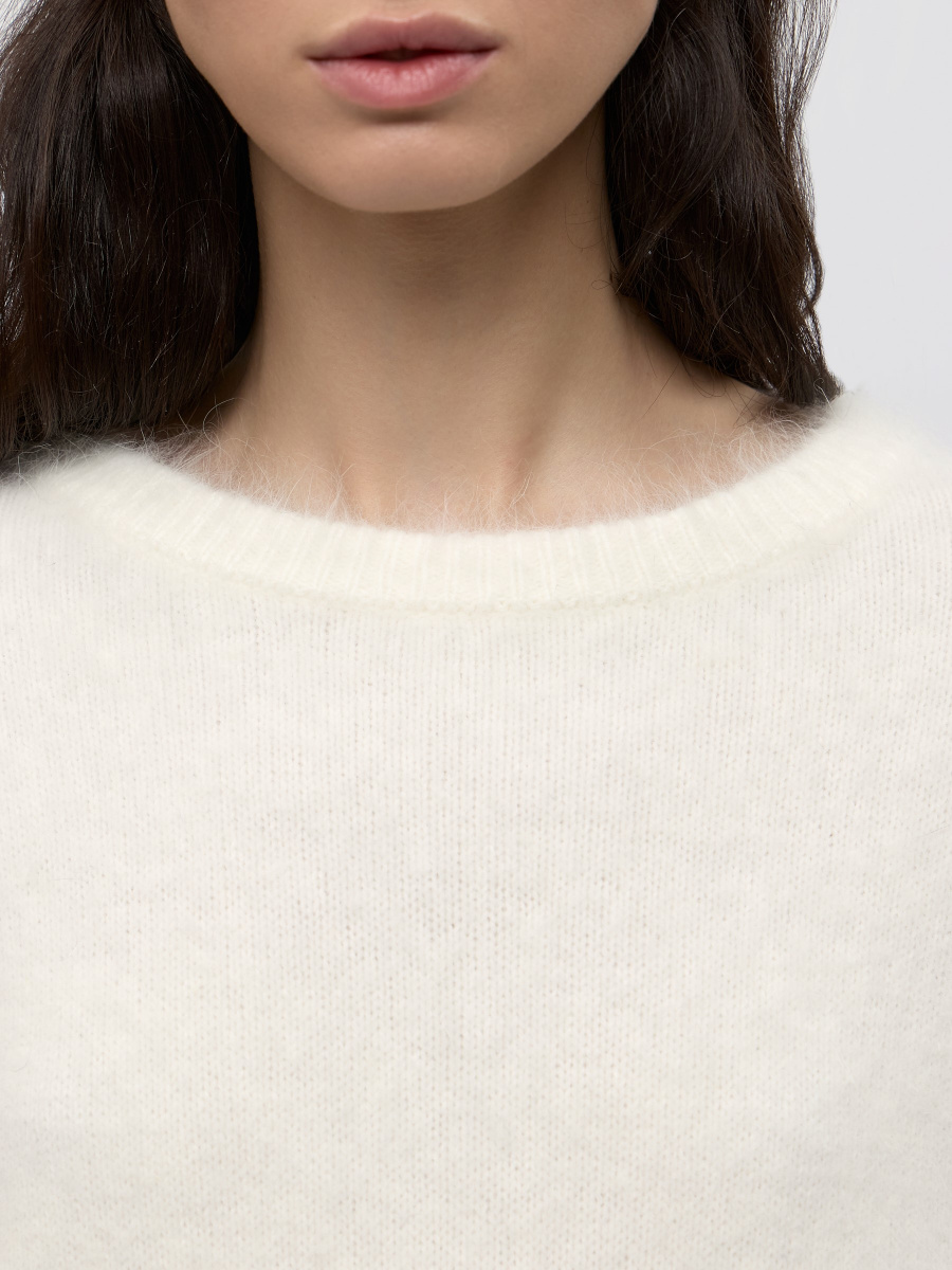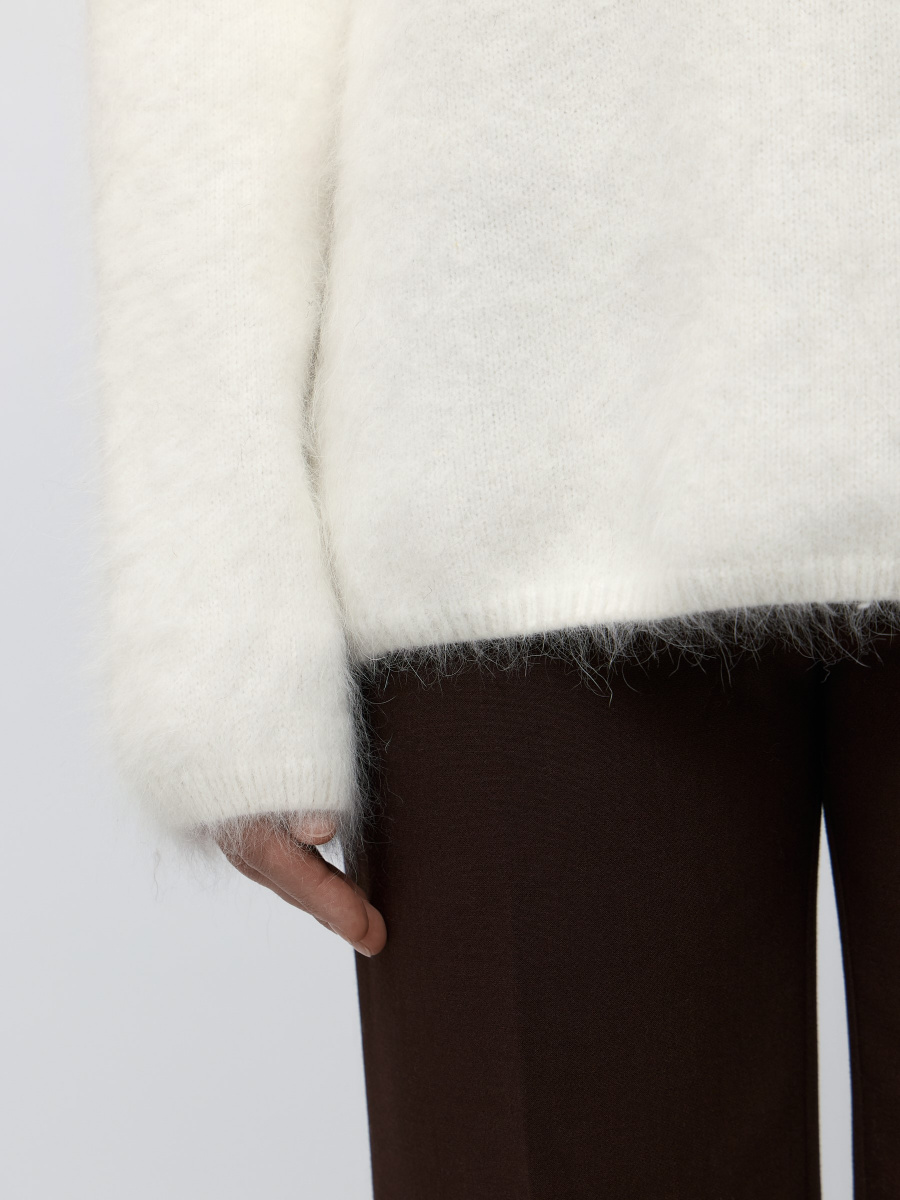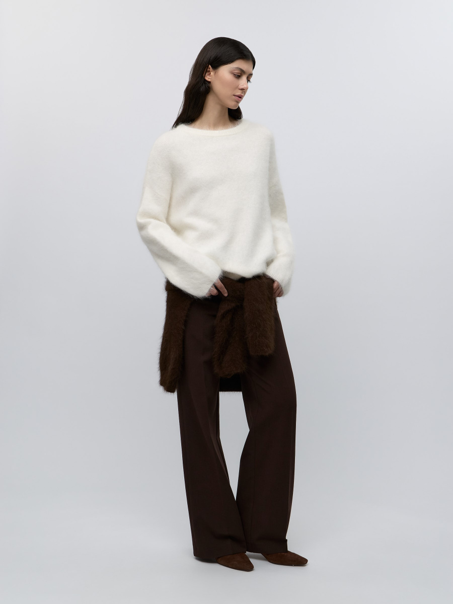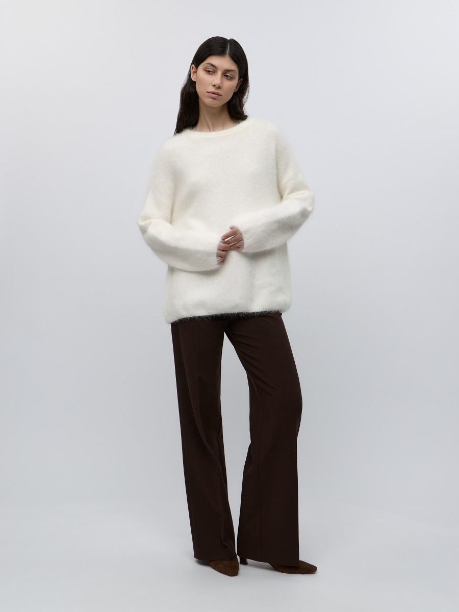 Просторный джемпер из пушистой ангоровой пряжи создан для холодной осени и зимы. Дополнен классической круглой горловиной. Прямой крой позволяет сочетать модель с разными вариантами низа, а спущенная линия плеча — носить как второй слой, не беспокоясь о посадке.
