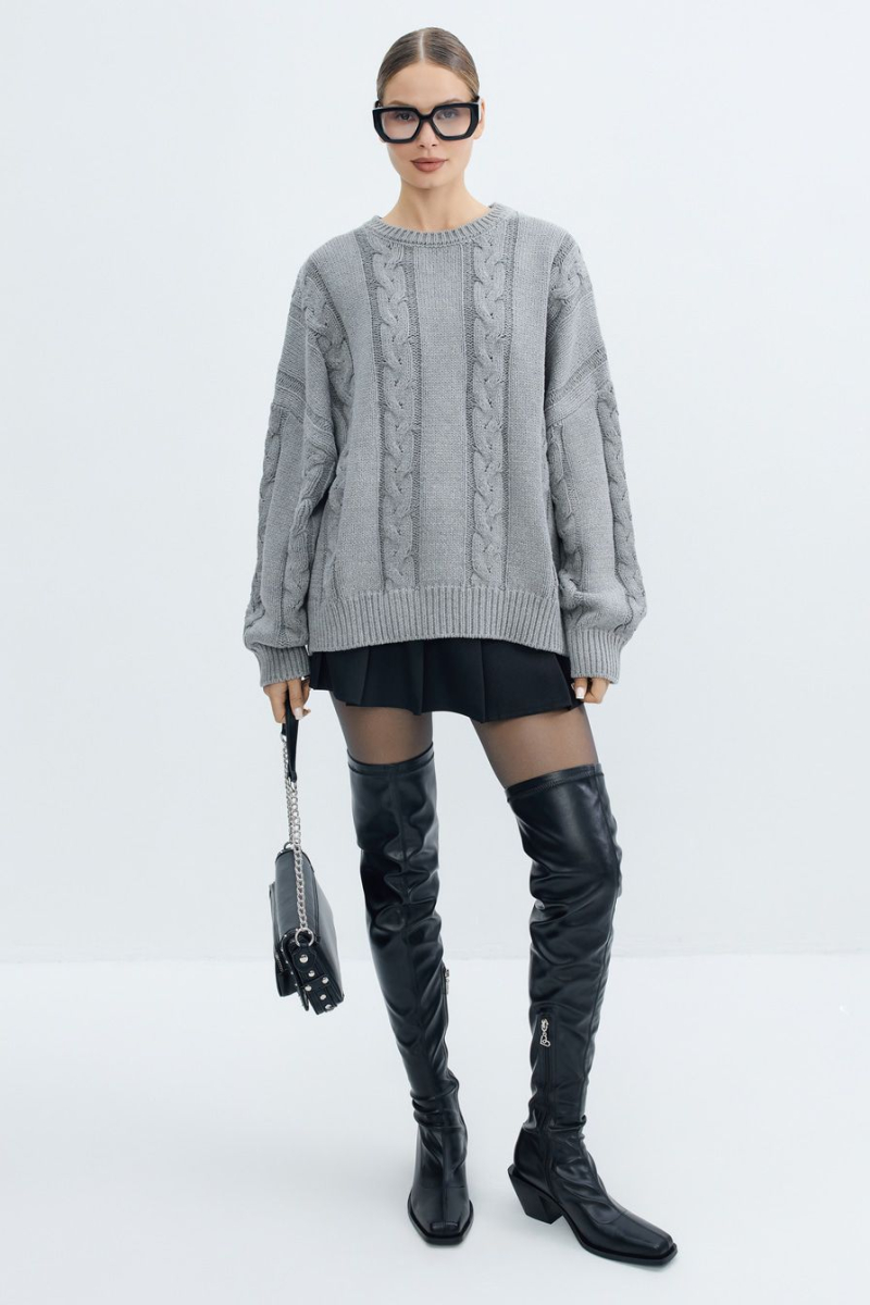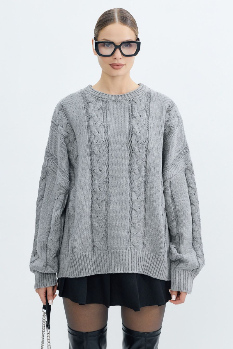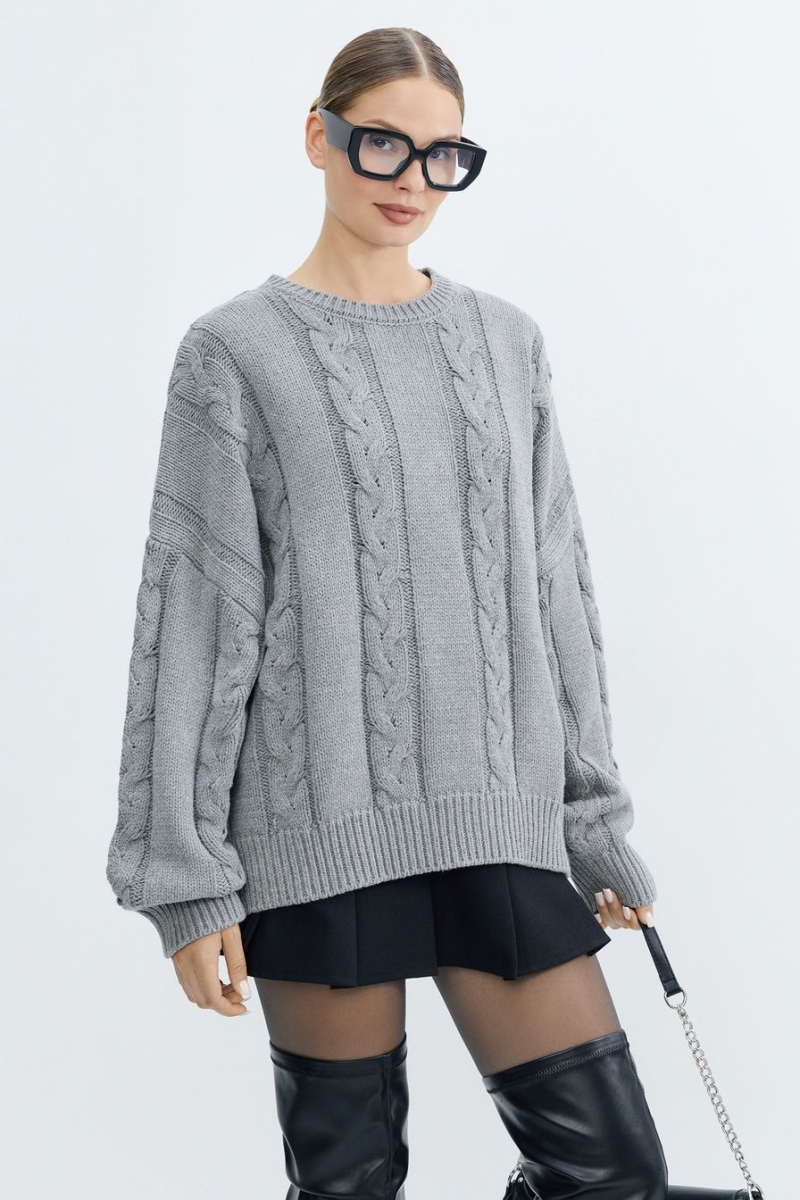 Объемный джемпер крупной вязки – модель серого цвета. Джемпер выполнен из смесового хлопка и декорирован вязкой «косичка».