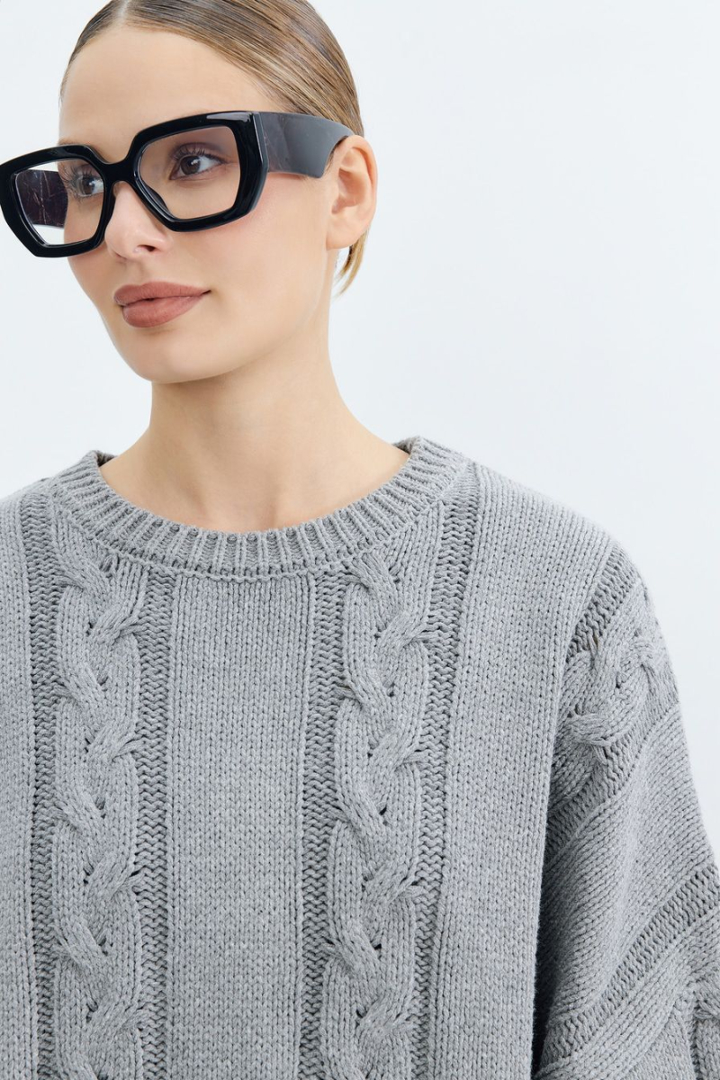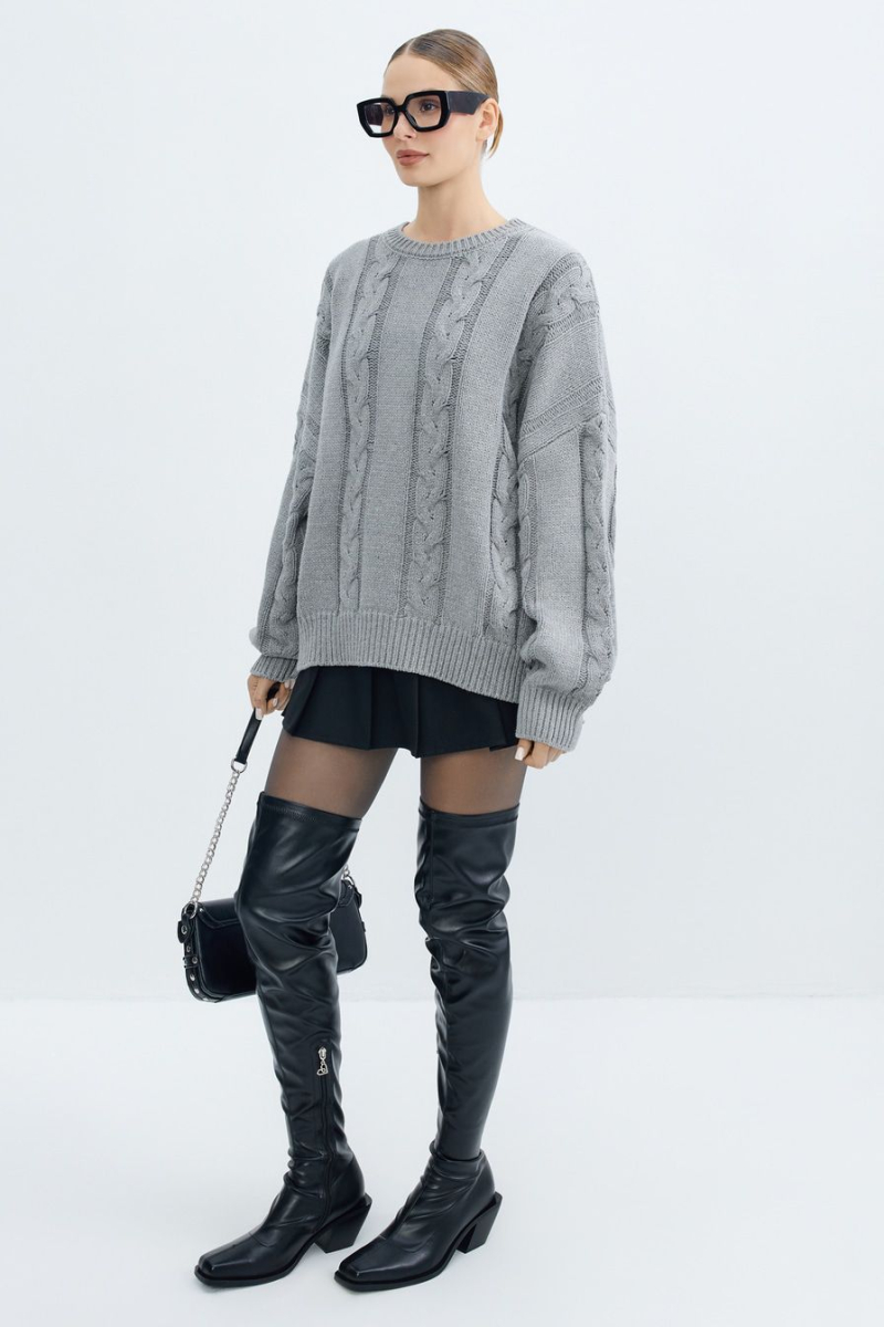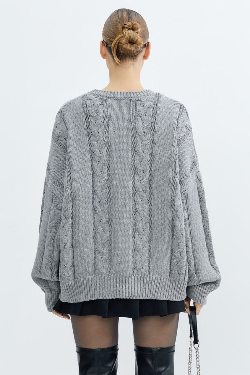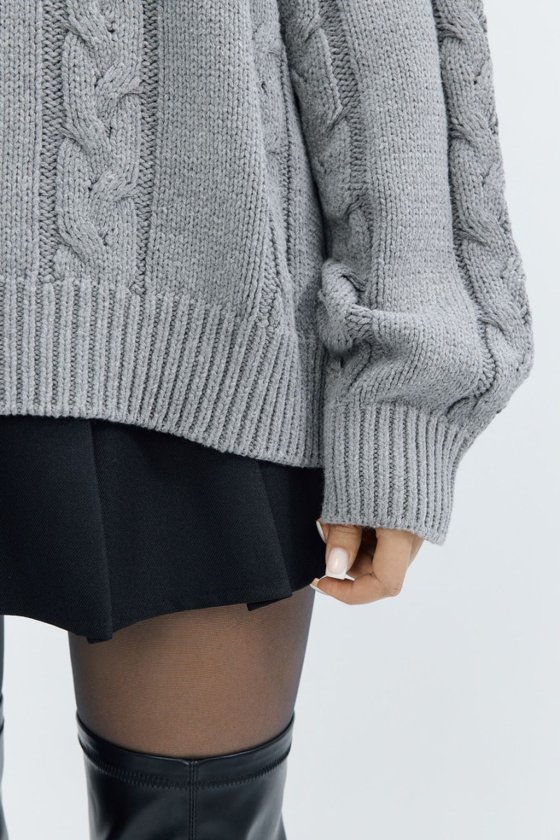 Объемный джемпер крупной вязки – модель серого цвета. Джемпер выполнен из смесового хлопка и декорирован вязкой «косичка».